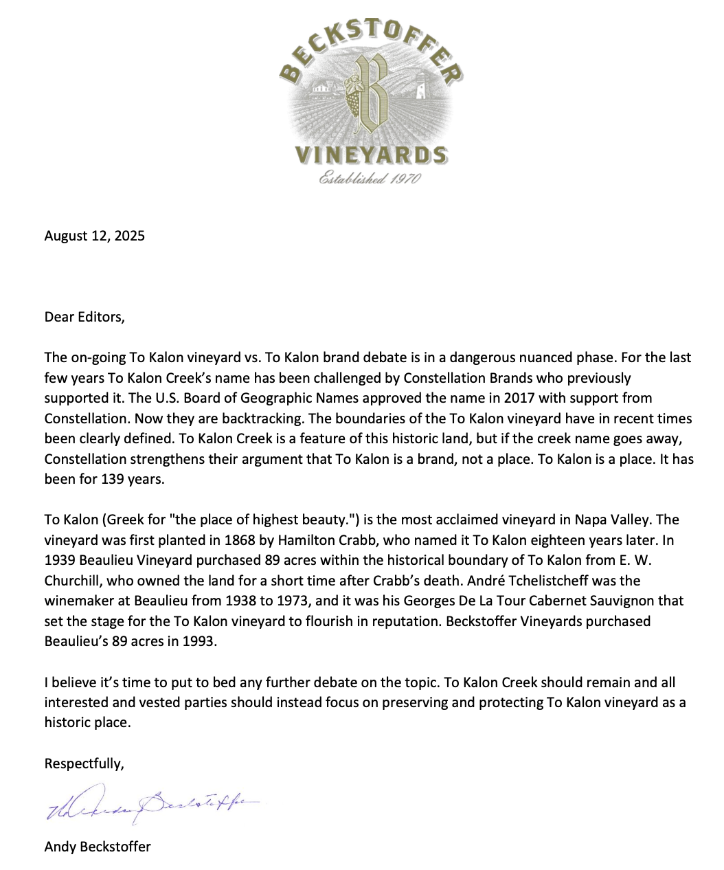 Thanks for sharing - but for historical accuracy my recollection is the history of To-Kalon includes a To-Kalon wine company which made wine in the early history of the property.