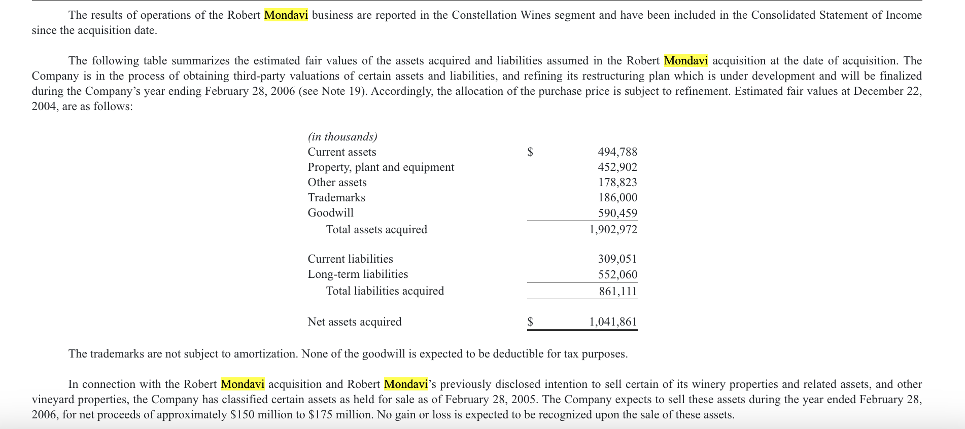 Yup, looks like Mondavi FV’ed the total trademarks in the acquisiton at 186M. Given how FV accounting worked then, most of that would not have been form the To-Kalon TM unless they expected it to generate significant future cash flows.