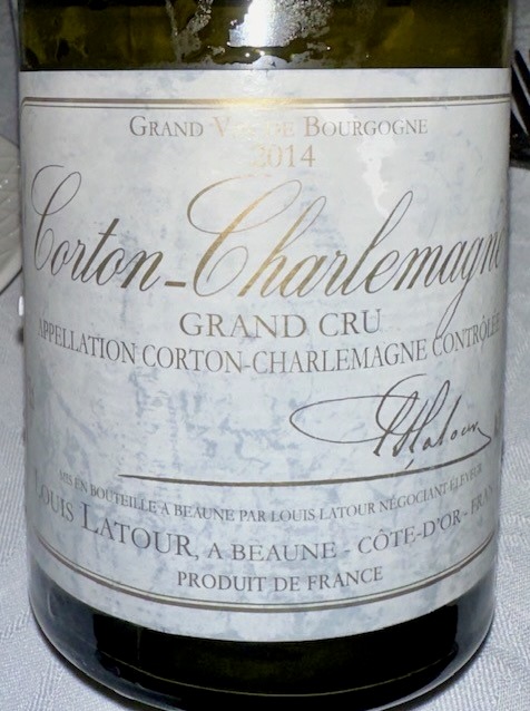 2014 LOUIS LATOUR CORTON-CHARLEMAGNE GRAND CRU- pale yellow color; this outstanding wine gave its first indication of being such with inviting aromas of mineral and chalk laden yellow and green apple; once tasted, additional notes of spiced and mineral infused pear and pineapple came in; it had a lovely texture and finished impressively with everything coming together.