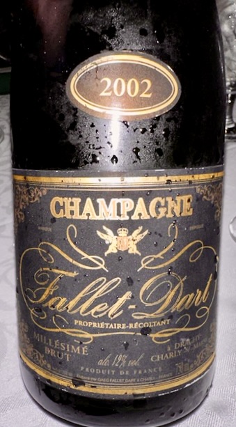 2002 FALLET-DART BRUT MILLESIME- following its yellow gold color came super inviting aromas of honey, brioche and ginger laced citrus with lemon and orange most prevalent; on the palate, additional notes of butter cream, nectarine and tangerine came in while being delivered in a tactile pleasing creamy mousse; on top of all of these highlights was its amazing balance throughout; there was a very slight hint of oxidation at the end, but that was the only sign of any aging and certainly not a deterrent as to how wonderful this was.