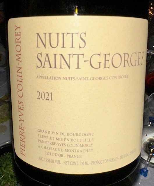 2021 PIERRE-YVES COLIN-MOREY NUITS-SAINT- GEORGES- blind; served warm; this was so atypical for Burgundy; in fact, I called it a Cote Rotie with its black pepper and spicy blueberry notes and accused the one who brought it as having missed the theme; I did like it as I do love those pepper notes and this wine was a tasty treat.