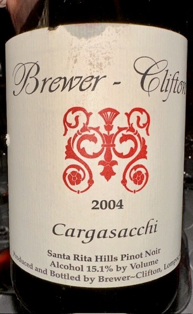 2004 BREWER-CLIFTON CARGASACCHI VINEYARD SANTA RITA HILLLS PINOT NOIR- blind; my bring, decanted 2 hours and unrecognized; I loved it and called it Burgundy; it was ideally balanced and seemingly very youthful with a vibrant dark red purple color and aromas and tastes of spice, coffee and dark chocolate laden black cherry; it was full bodied, had a soft, velvety texture with a bit of weight and finished nicely with the wonderful spicy black cherry. My fav of the flight and a surprise once revealed.