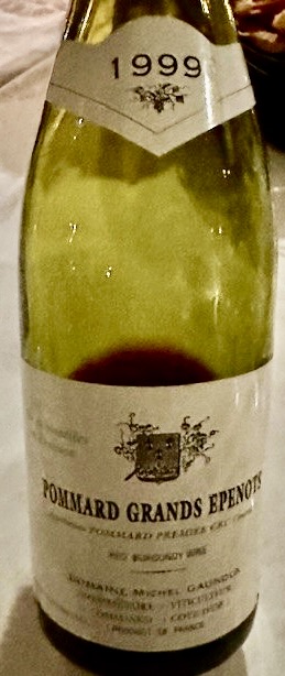 1999 DOMAINE MICHEL GAUNOUX POMMARD GRANDS EPENOTS 1er Cru- blind; I got this as a Burgundy as it had so much complexity, depth and nuances that I find more often here; in this case, the color was a still somewhat youthful red purple with no signs of bricking or fading; the nose offered talc and milk chocolate covered red cherry with a touch of black cherry and blackberry coming in past mid palate and finishing up the nice, long finish; it seems that this could go even longer before reaching its apogee as the fruit profile is still first and foremost. Loved this wine.
