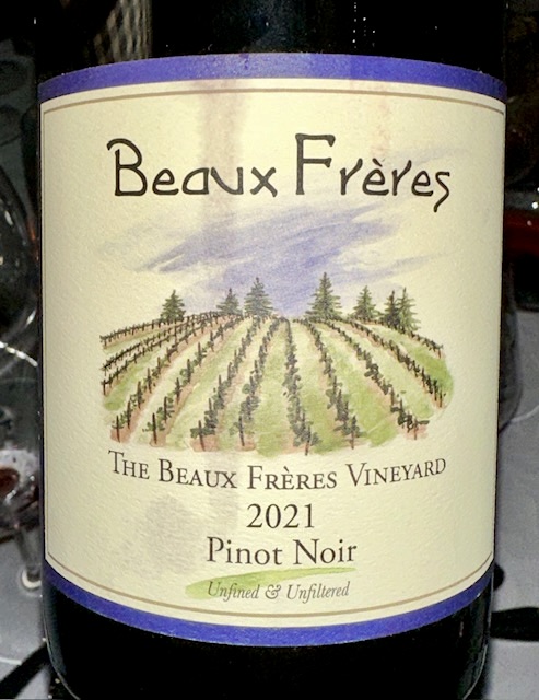 2021 BEAUX FRERES THE BEAUX FRERES VINEYARD WILLAMETTE VALLEY PINOT NOIR- blind; this was marvelous from the outset and got my attention for the best Pinot Noir yet and maybe a WOTN candidate; talc and sandalwood provided the perfect accents to the red and black raspberry fruit that was prevalent all the way through the back end; it had a super smooth mouthfeel, layered depth and a nice dollop of late arriving blueberry that topped off the taste profile.