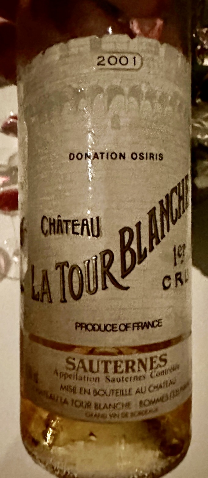 2001 CHATEAU LA TOUR BLANCHE SAUTERNES- i usually pass on the sweet ones or only have a small sip, but this one got a 2nd sip as it was stupendous giving amazing honeyed apricot, marmalade, orange peel and mango notes and a creamy, viscous texture that emulated buttered candy melting in my mouth; it stayed on my palate for what seemed like hours and I took my time before vigorously brushing my teeth once home.