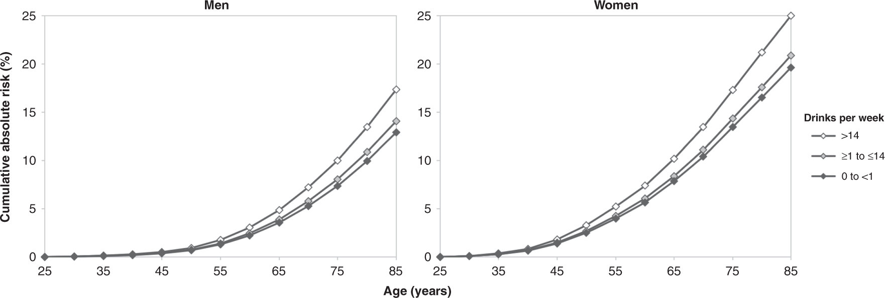 The heaviest drinkers (>14 drinks/week, median 21/wk for men, 20/wk for women), represented by the top curves had an absolute increase in risk of developing an alcohol-related cancer of about 1% for men and 2% for women by age 65. That increased to about 3% (men) and 4% (women) by age 75 and about 4% (men) and 5-6% (women) by age 85.