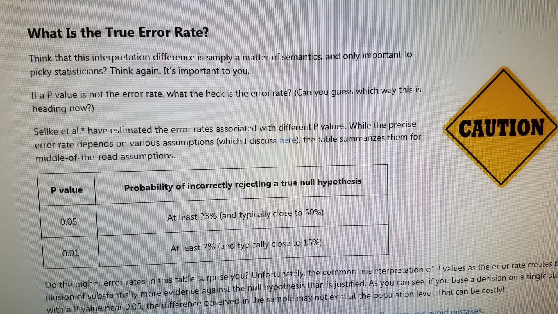 Statistics are hard - and even those of us that took a formal statistics class years ago probably don’t really remember or understand them well. P value of less than .05 is typically considered adequate “proof”, so that must mean the error rate is less than 5%, right? nope.