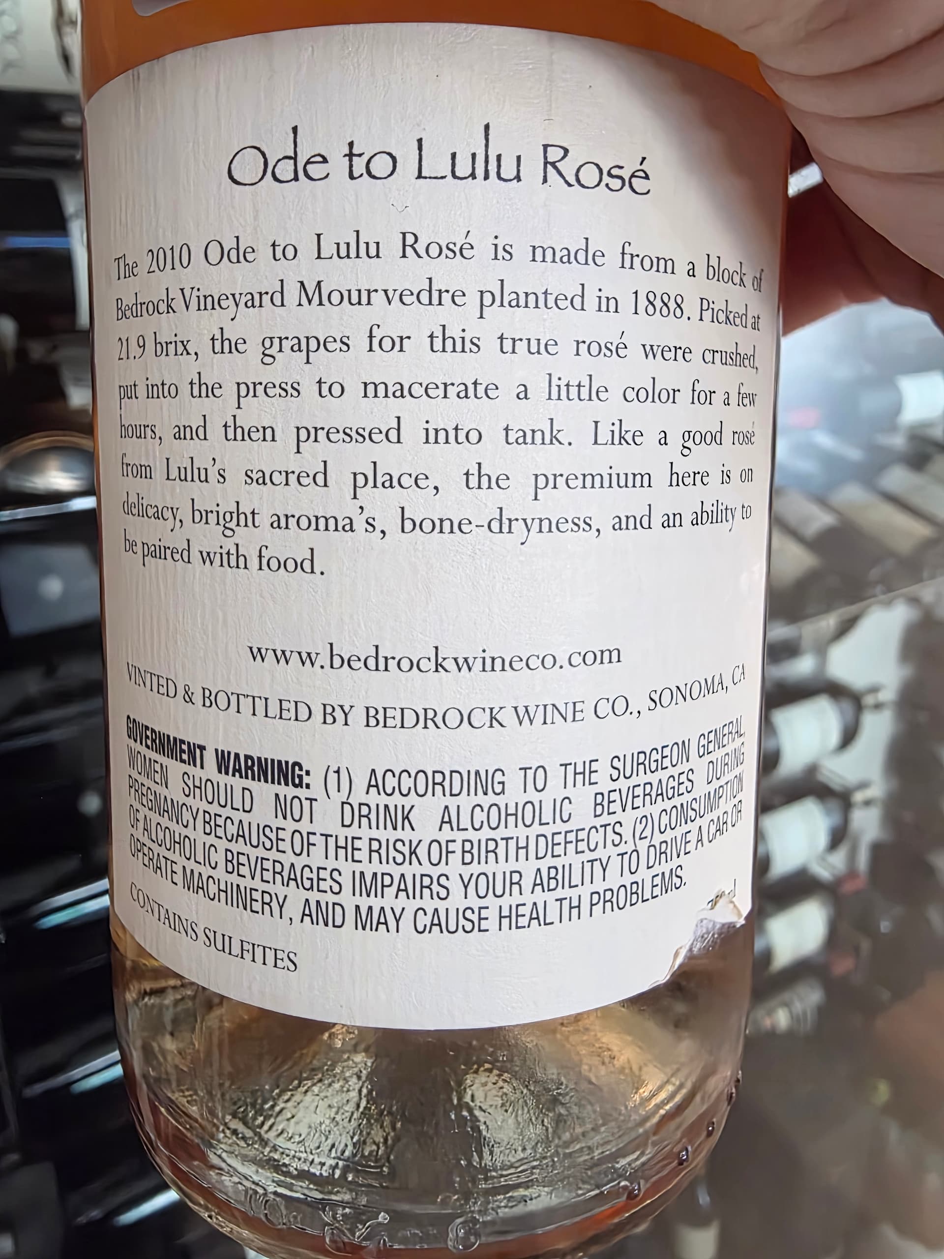 Hereās a fun one! 2010 Ode to LuLu Rose. Yepā¦a 16 year old rose. And honestlyā¦youād never know it. Still a lovely pale salmon color, with freshly picked strawberries and a hint of watermelon on the nose.