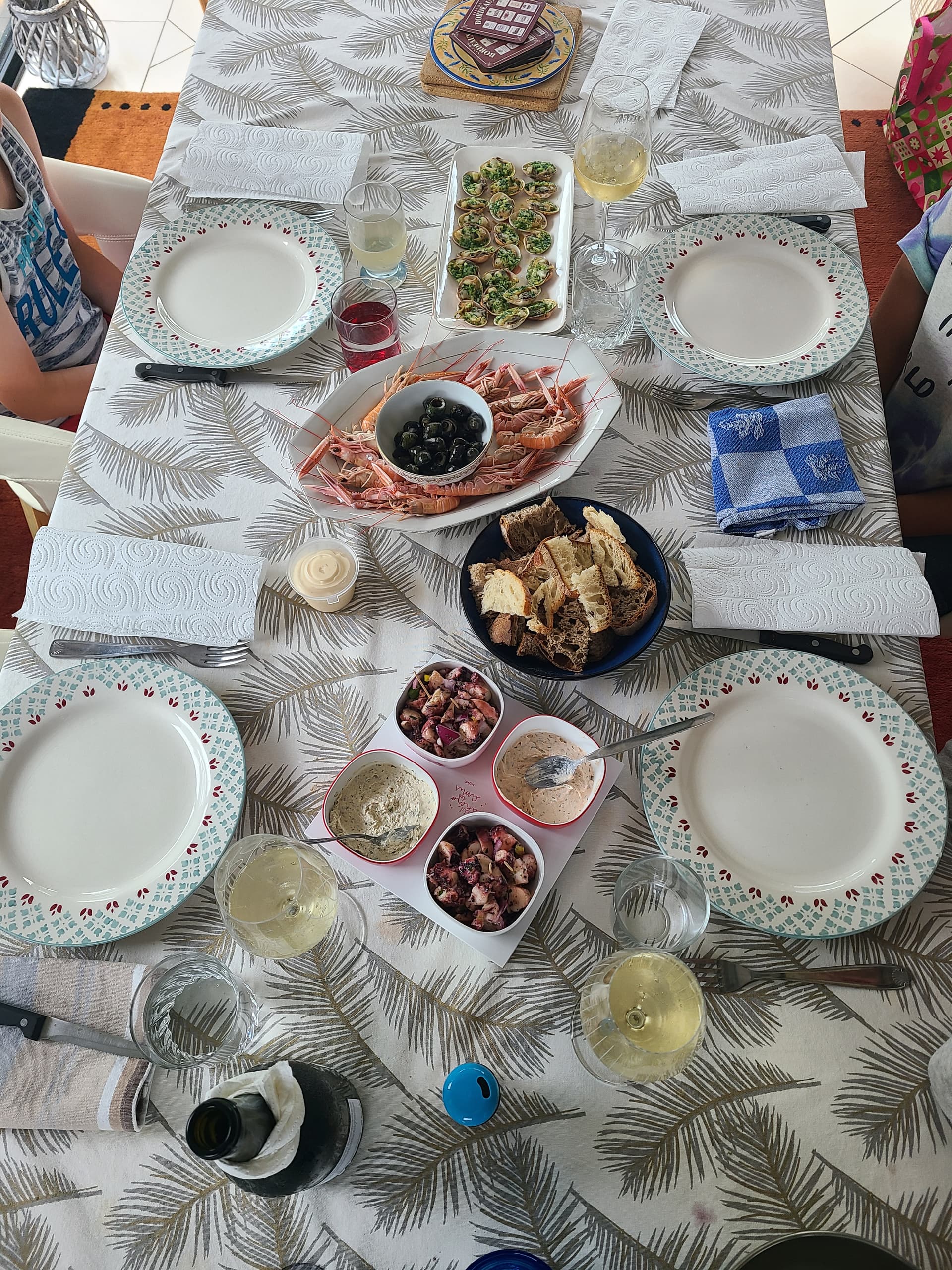 Various fare from les Halles de Concarneau and a nearby fish shop: salmon rillettes, tuna rillettes, octopus salad, langoustines, bigorneaux, stuffed clams and fresh bread to start.