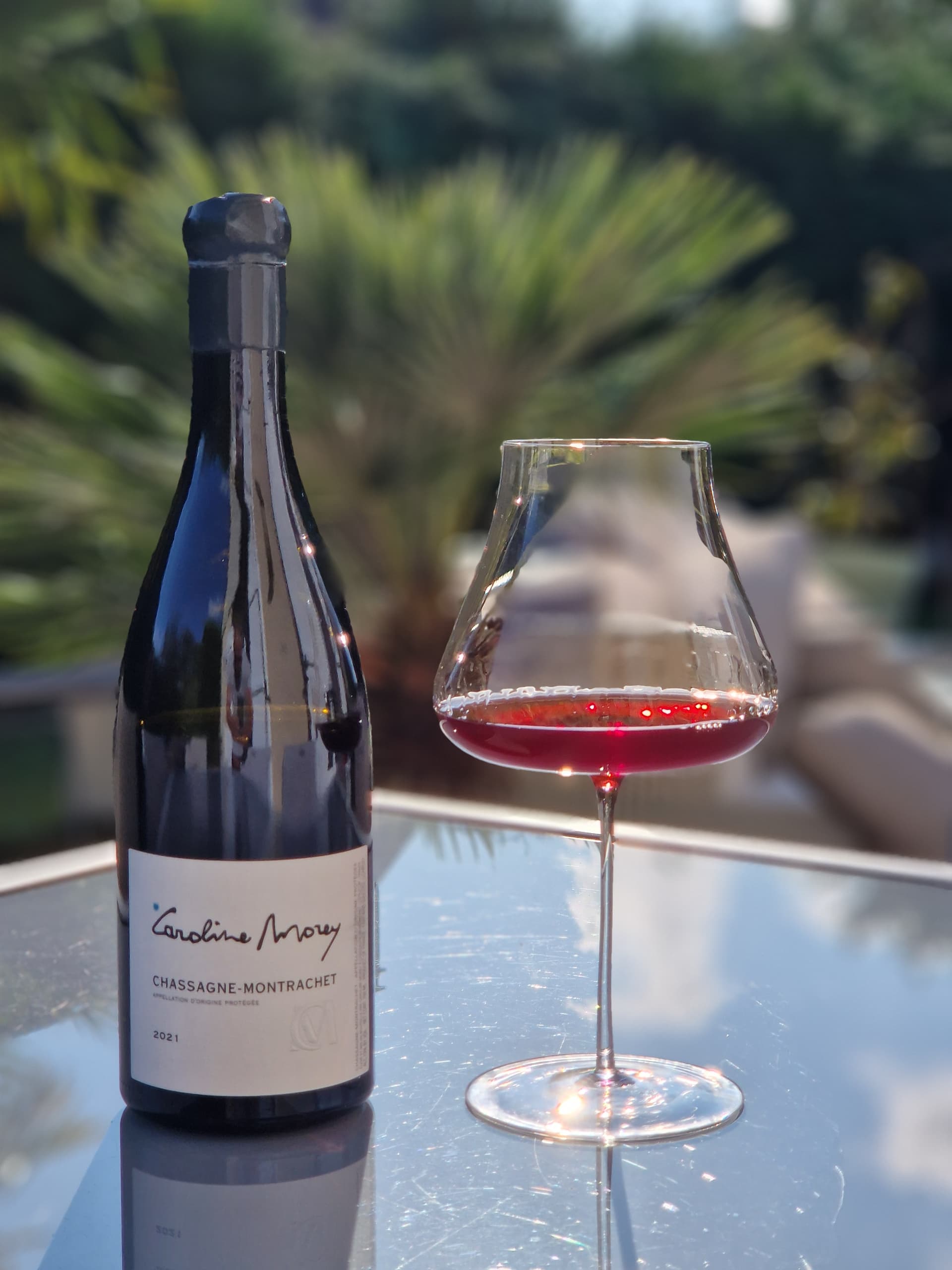 Caroline Morey Chassagne-Montrachet 2021 red, delicate infusion of tart red berries, florals, and bright Pinot aromatics, full of finesse and lift. Just missing a bit of mid-palate gourmandise, with a hint of green on the finish.