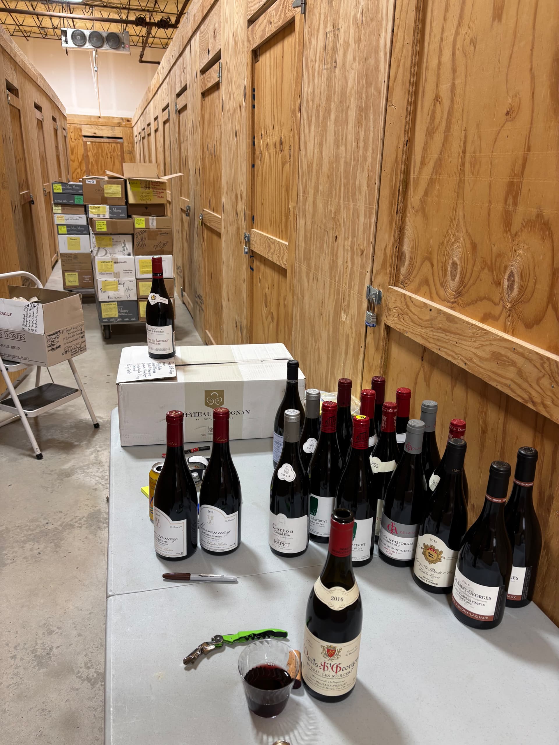 The Vision: Every producer in lift-friendly 6-bottle boxes organized by shelf location and wine region: Burgs, Bubbles, Riesling and small-quantity Outliers (Bordeaux, Italians, Rhone, Oregon [Walter Scott])