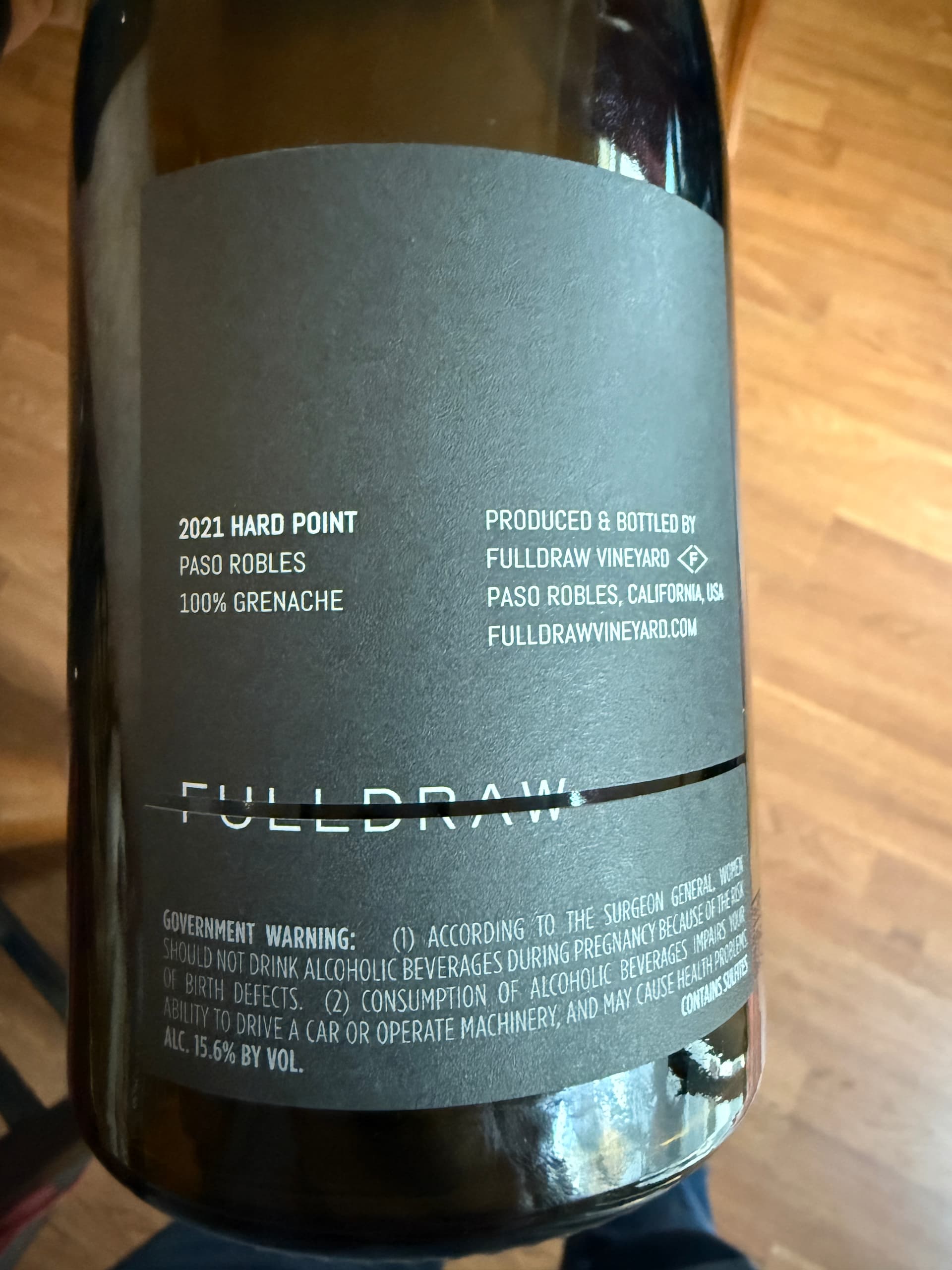 Fulldraw Hard Point from Paso Robles. Great tannin structure, medium body, nice acidity, well balanced but still a big wine, made to age but I opened this one young. Not overly extracted like some Paso wines. One of top Grenache wines right now.