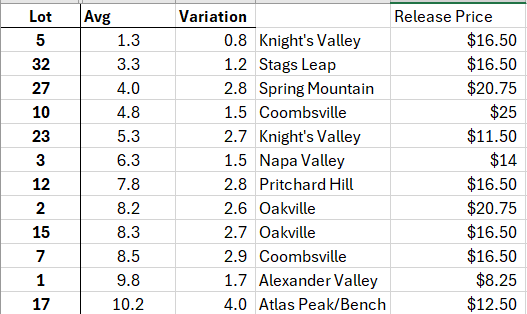 Also, for lot 17, we tasted it 6th, between Lot 5 and Lot 27, the two meritages people loved. So who knows how the order effects played out, but might be some.