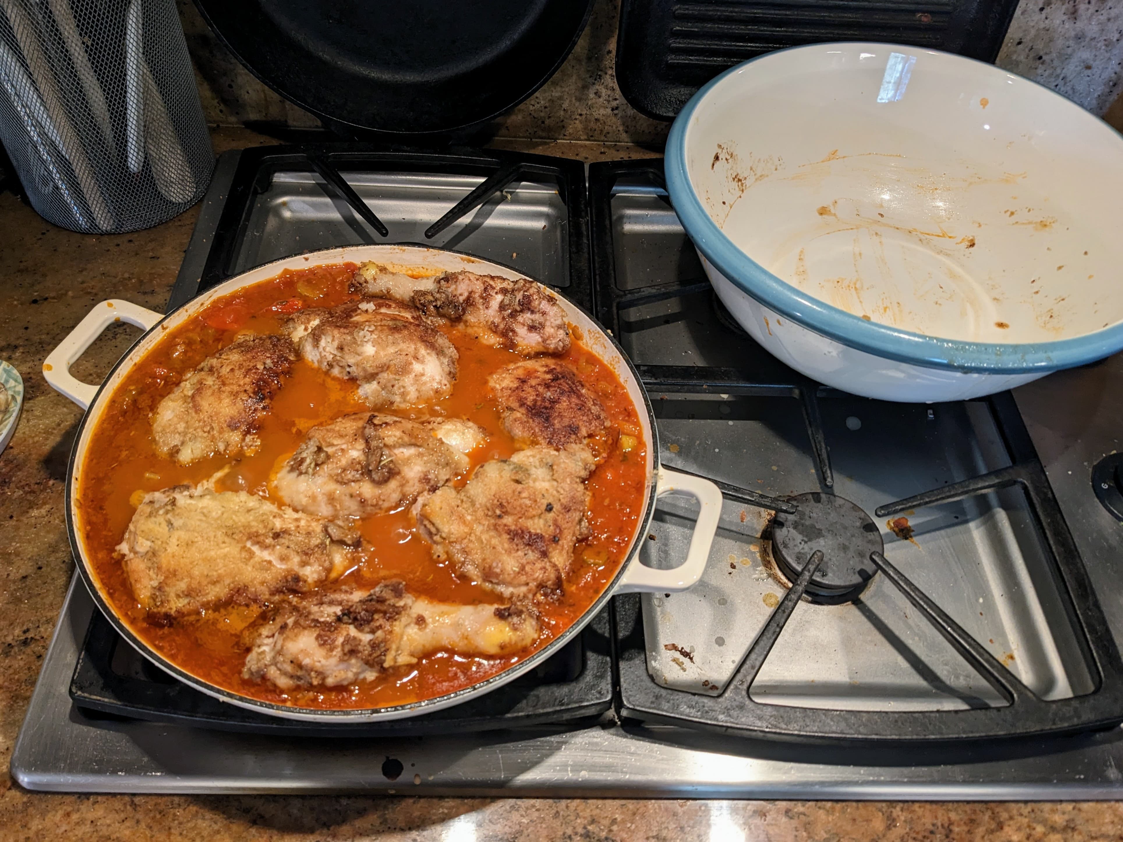 Deglaze with all the tomato, wine, stock and seasoning; then nestle the chicken pieces in the sauce