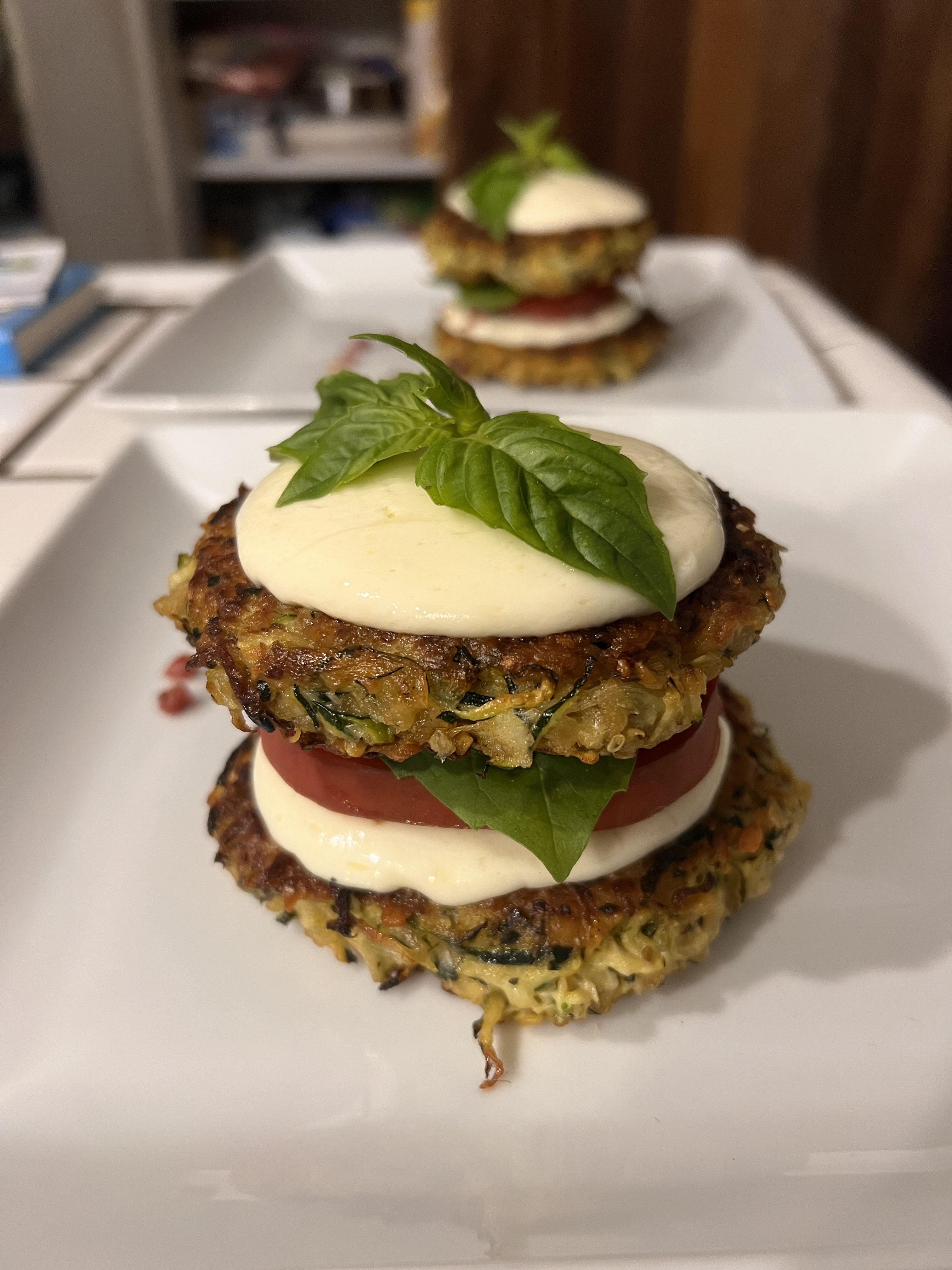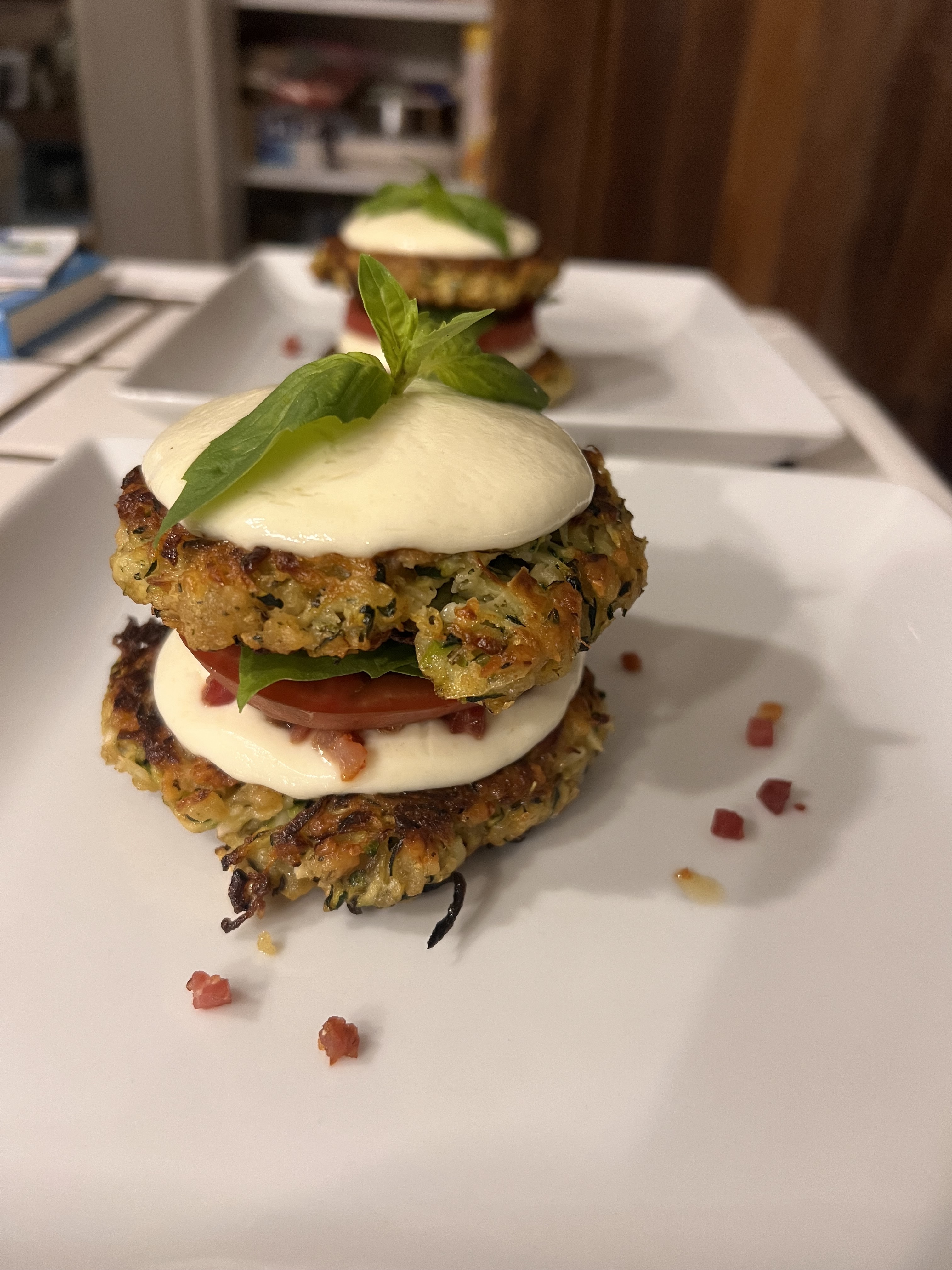 Depending on serving size and/or # of servings use either a 1/3 or 1/2 cup measuring cup and fill with zucchini mixture to form either 4 or 8 equal sized portions. In the pan you cooked the pancetta in heat canola oil med-high, add scoops of zucchini mixture and press into cakes with backside of measuring cup. Cook 4-6 minutes until browned, flip cakes and top with a slice of mozzarella, cook until browned and cheese softens. Remove to paper towel lined plate.