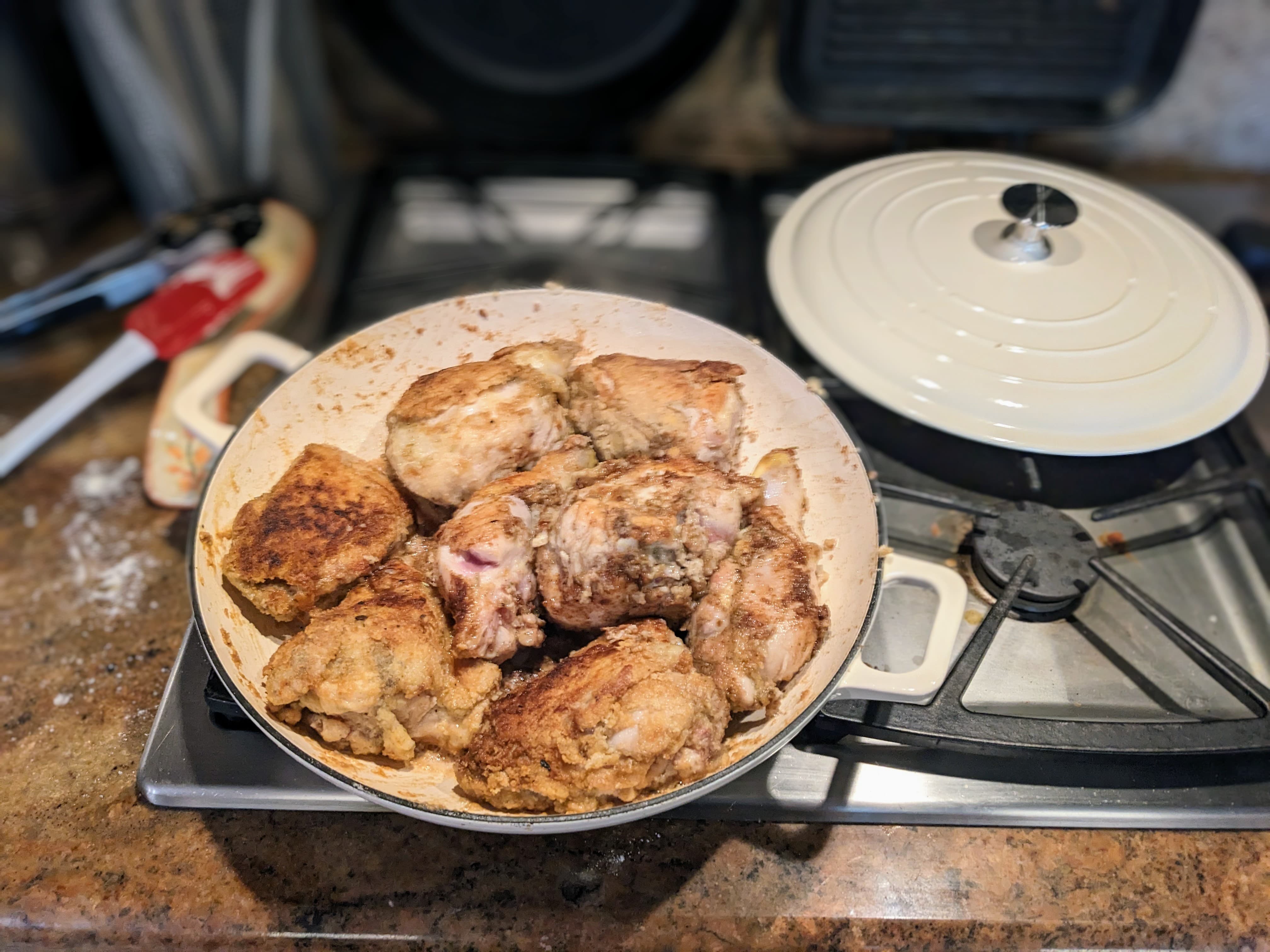 Break down a whole chicken, marinate/season, and then brown