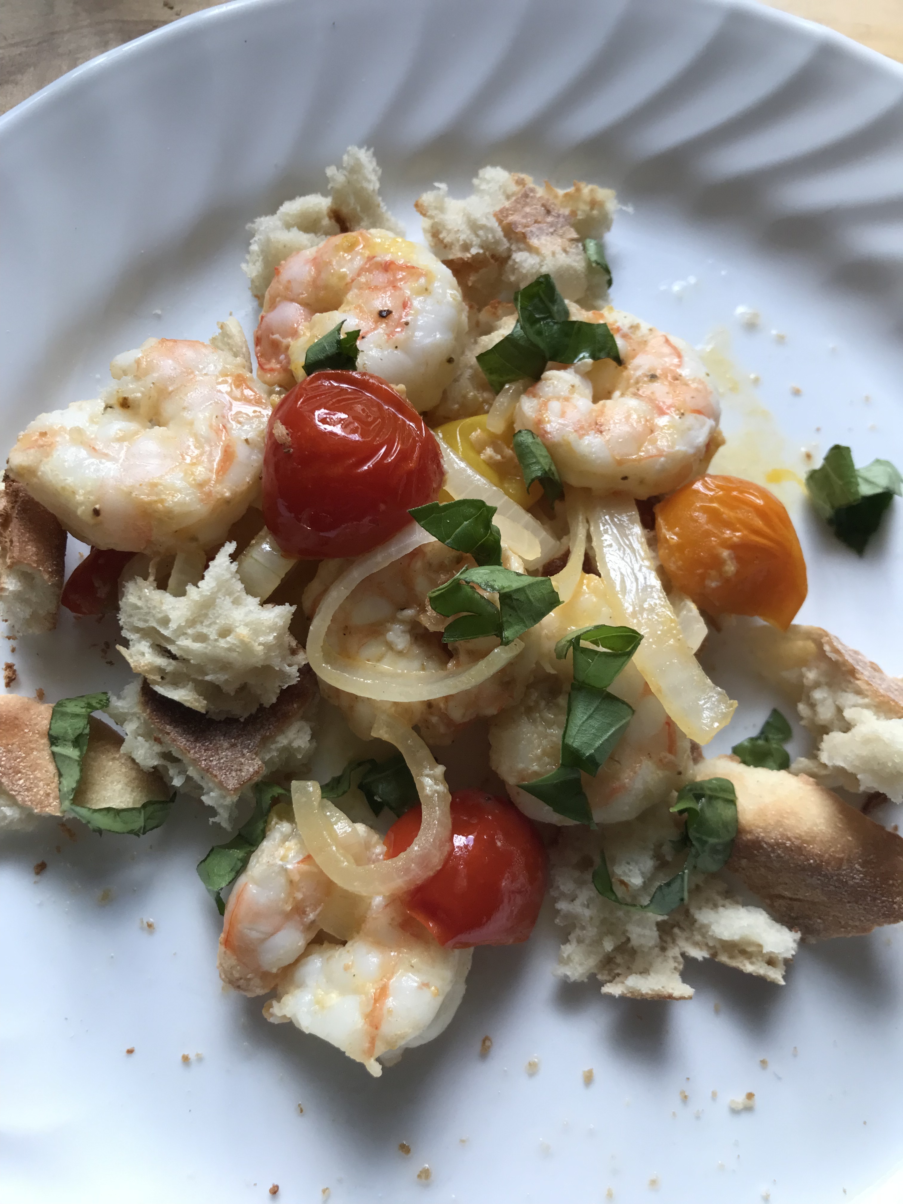 Wild gulf shrimp, onions, tomatoes, and basil with toasted and torn English muffin. The onions, tomatoes, and basil are from our garden. Both dishes paired nicely with a 2022 @Erica_O_r_r Old Vines Chenin Blanc.