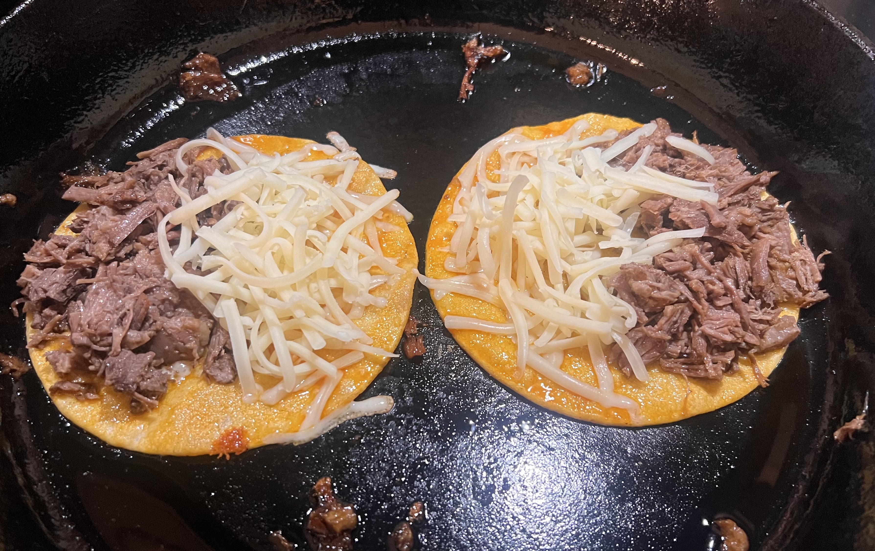 Heat a large skillet/griddle over medium heat. Dip the corn tortilla into the reserved grease from the broth and place on heated griddle for 30 seconds, flip and top with the chopped meat and cheese. Fold the taco over and press down with a spatula. Continue cooking until the taco is crisp and golden on the bottom, about 2-3 minutes. Then flip and continue cooking the other side. Plus you can spoon some additional grease onto the tortilla while it cooks if you need more coloring to the tortilla.