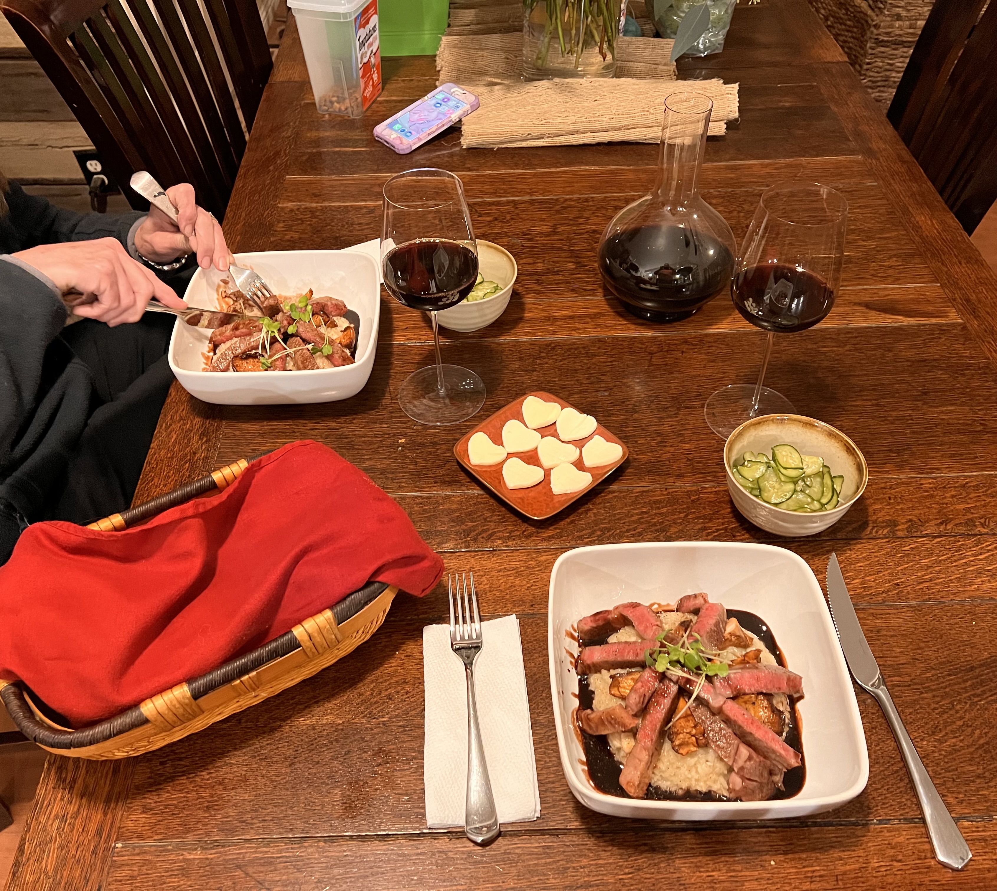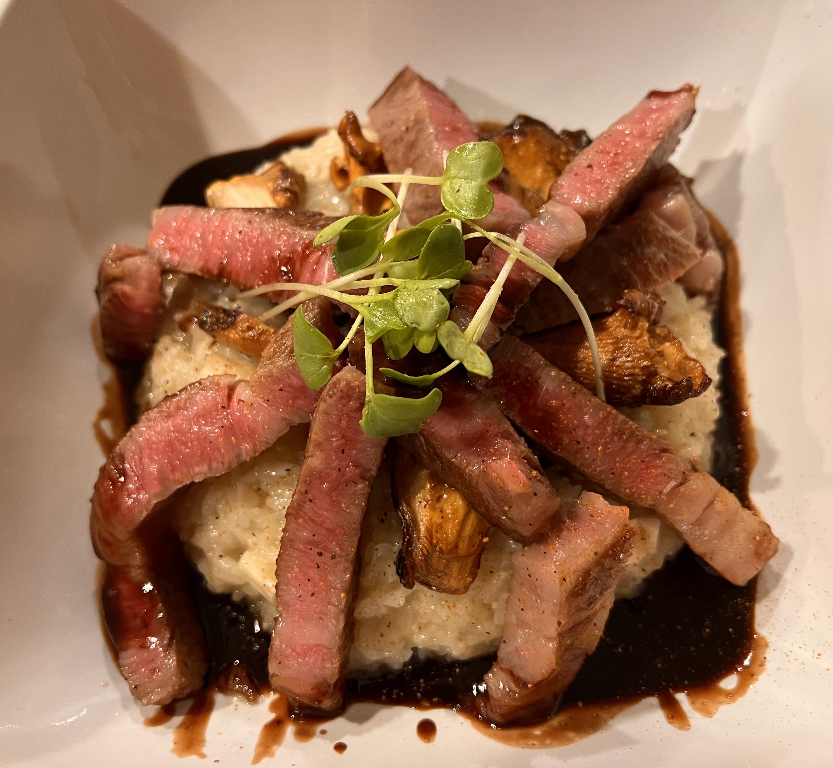 Sweet Malagkit Glutinous Mushroom (Trumpet Royale, Velvet Pioppini, Brown Clamshell) Risotto. Topped with Sautéed Chatarelles, Pan Seared A5 Wagyu Ribeye with Zinfandel Port Reduction and Daikon Sprout Garnish. Side of Japanese Cucumber Salad.