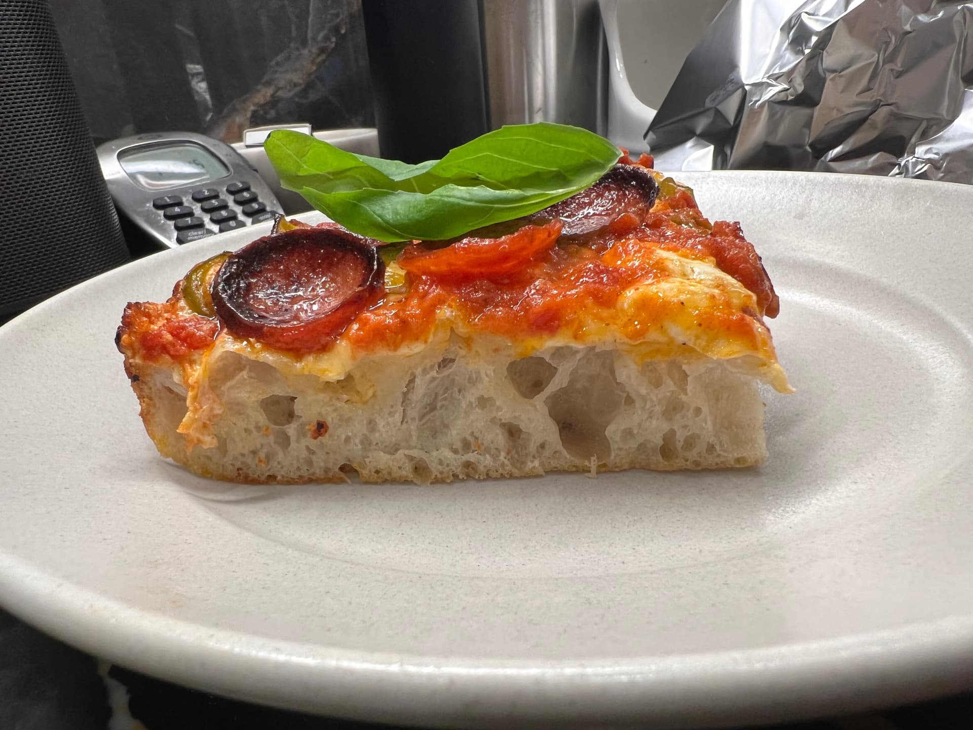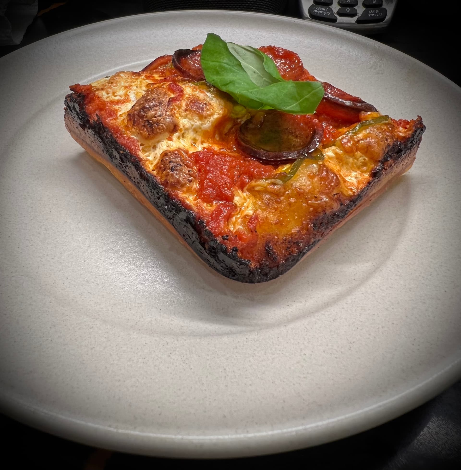 Detroit style pizza with vodka sauce, mozzarella, muenster, jalapenos, natural casing pepperoni… basil.