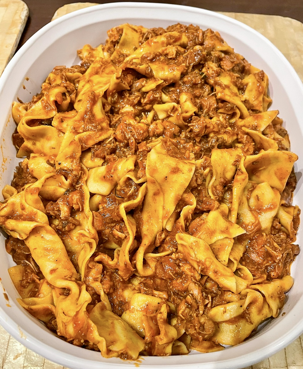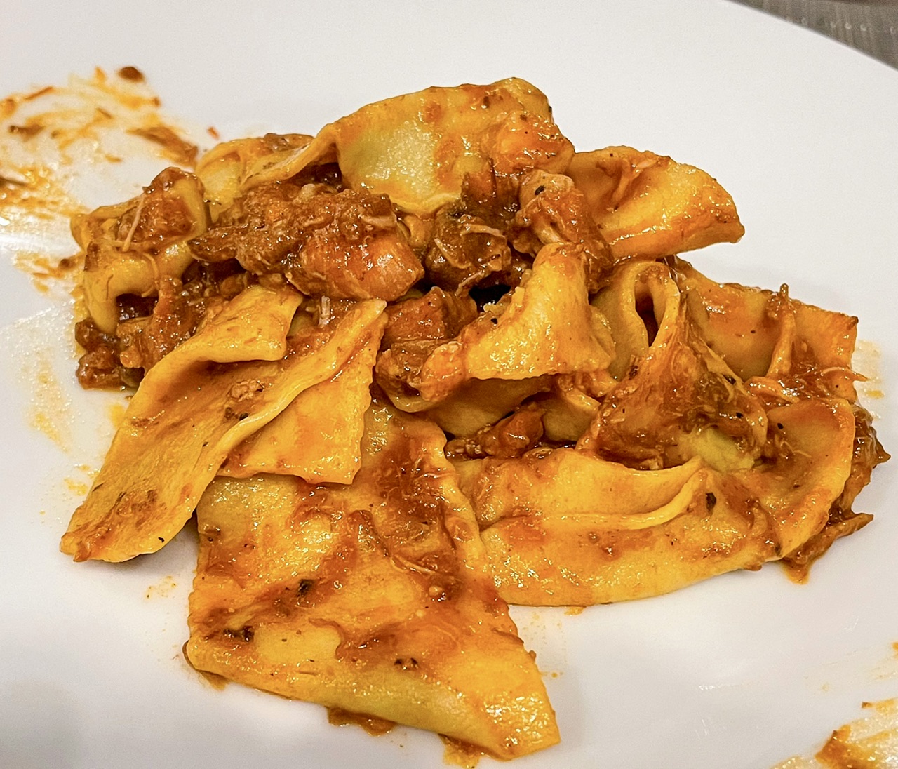 Ok, so I just assembled this dish of pappardelle alla lepre for dinner at home last night. I didn’t make the fresh pasta or the ragù di lepre (hare meat sauce); they were given to me by a Tuscan friend-chef-restaurateur-sommelier (who hails from Castiglione della Pescaia). Good, hearty, rustic, comforting stuff indeed.