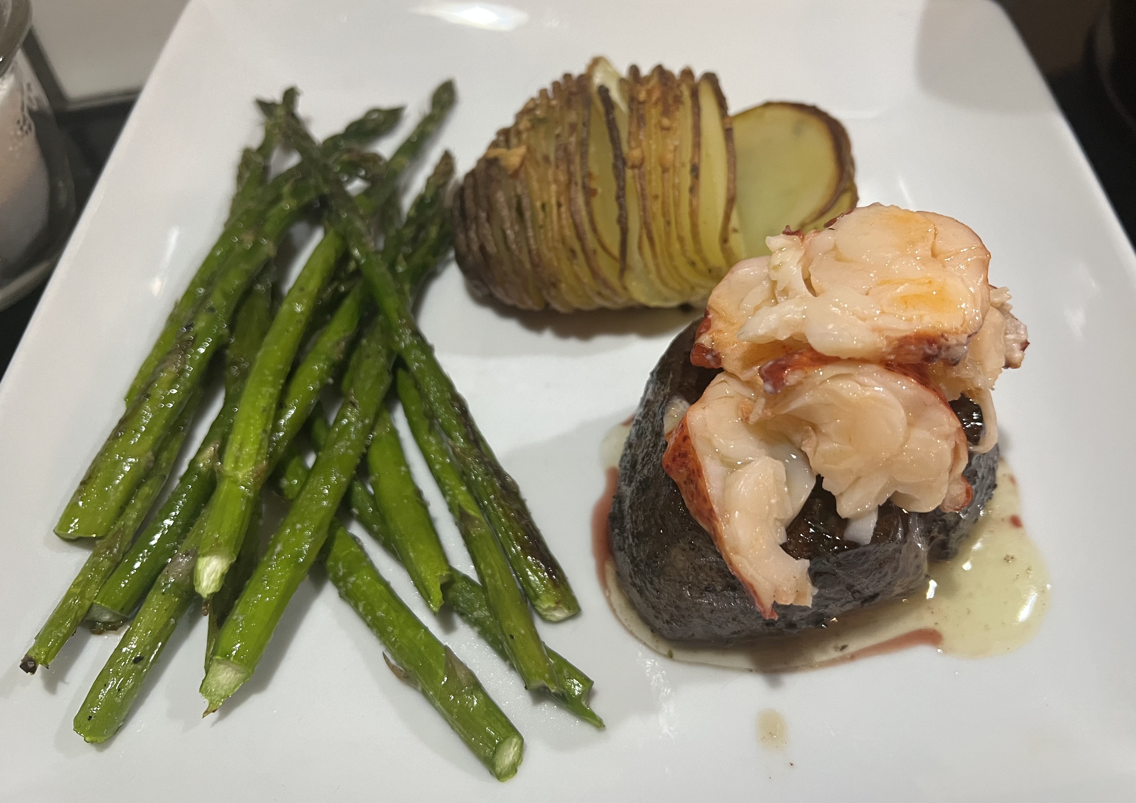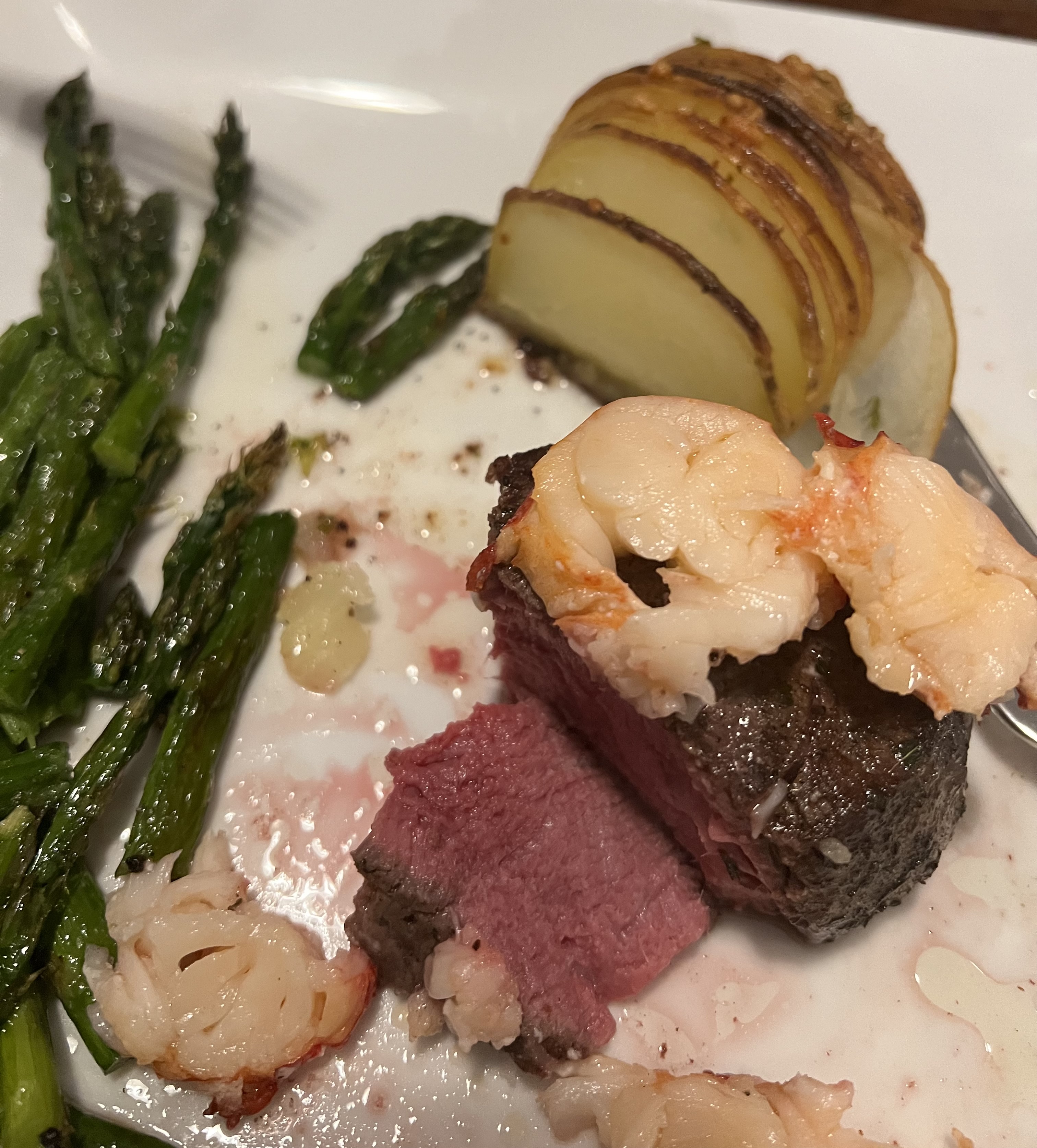 Surf -n-Turf Filet with Butter Poached Lobster, Hasselback Potatoes and Roasted Asparagus.