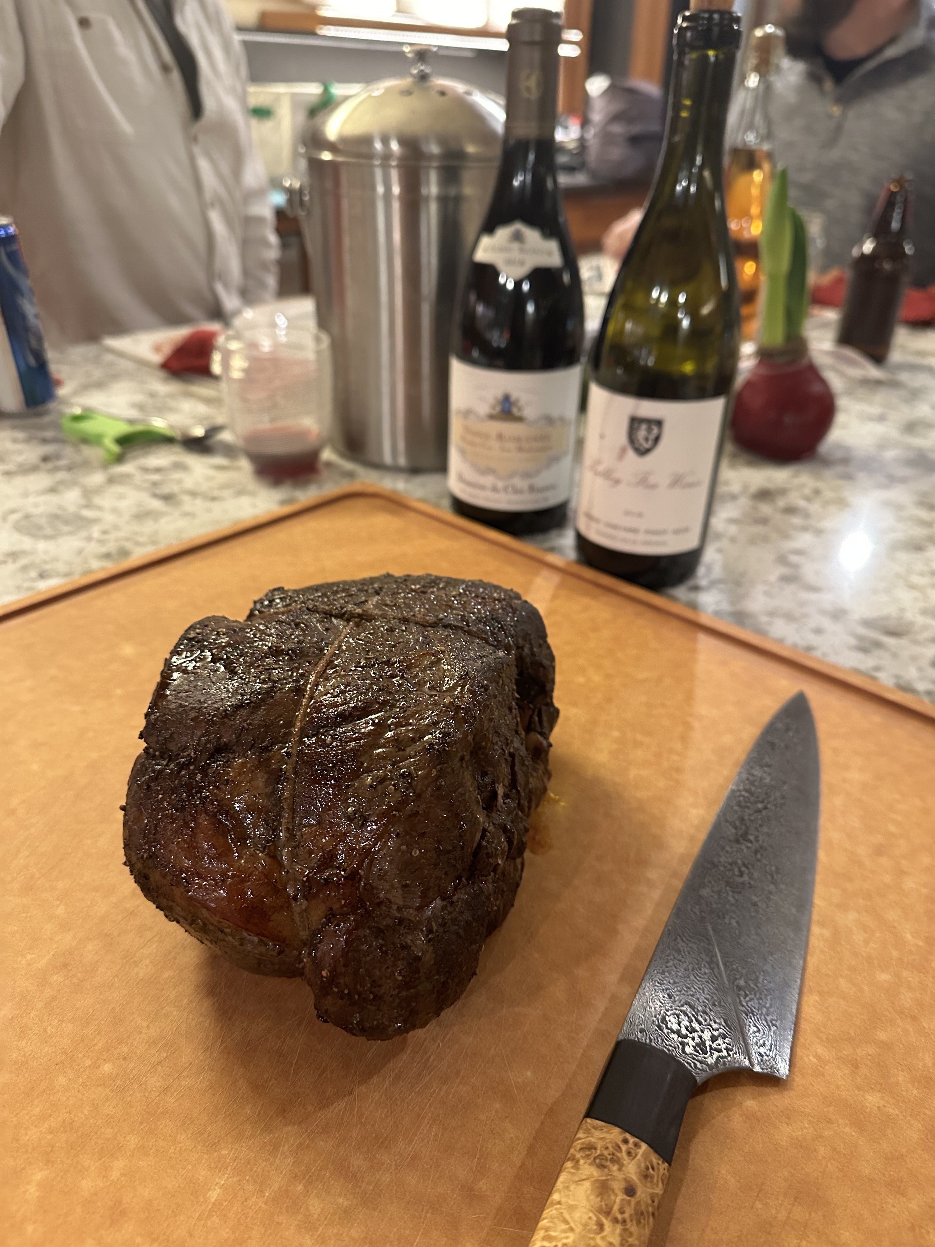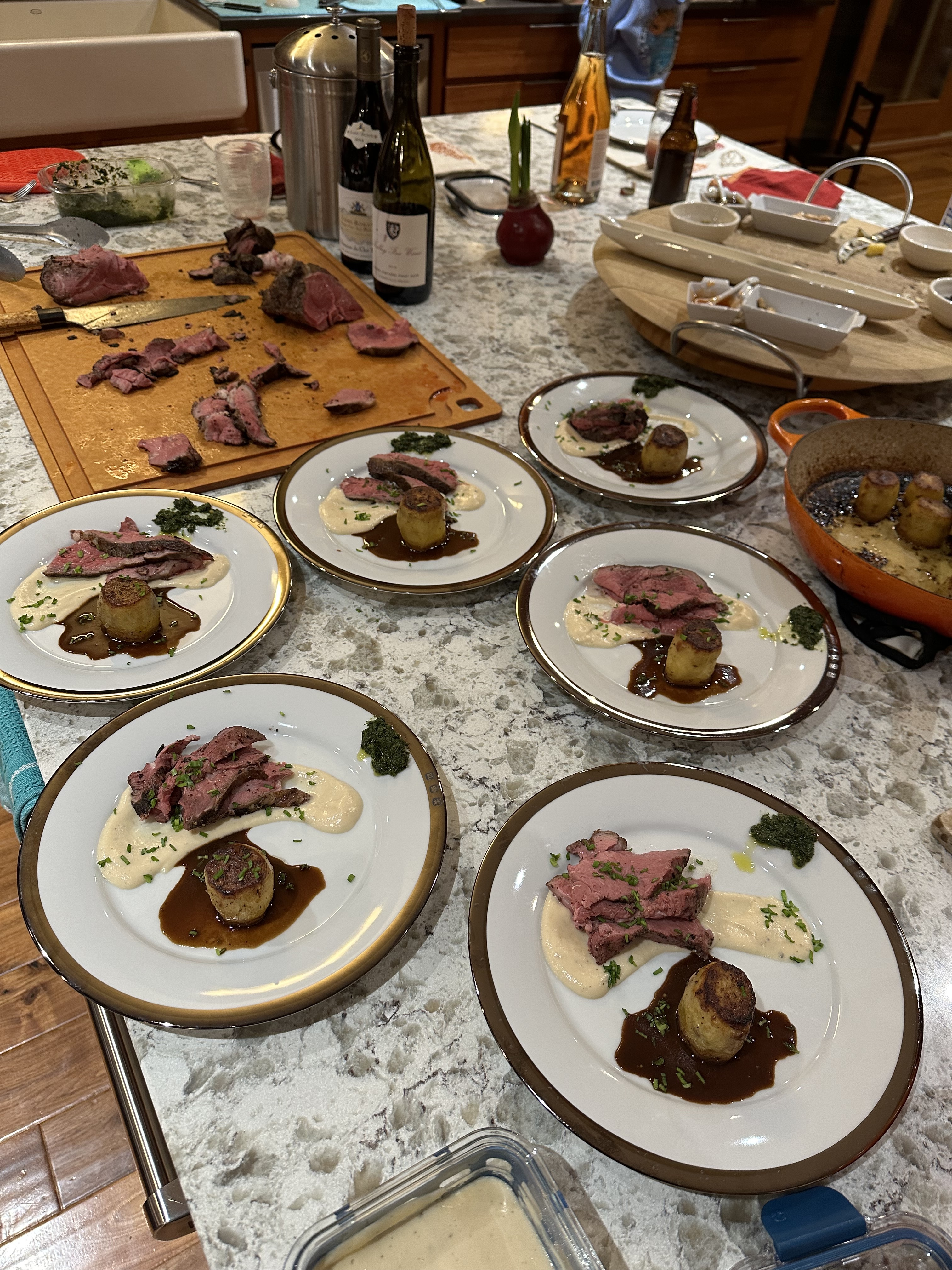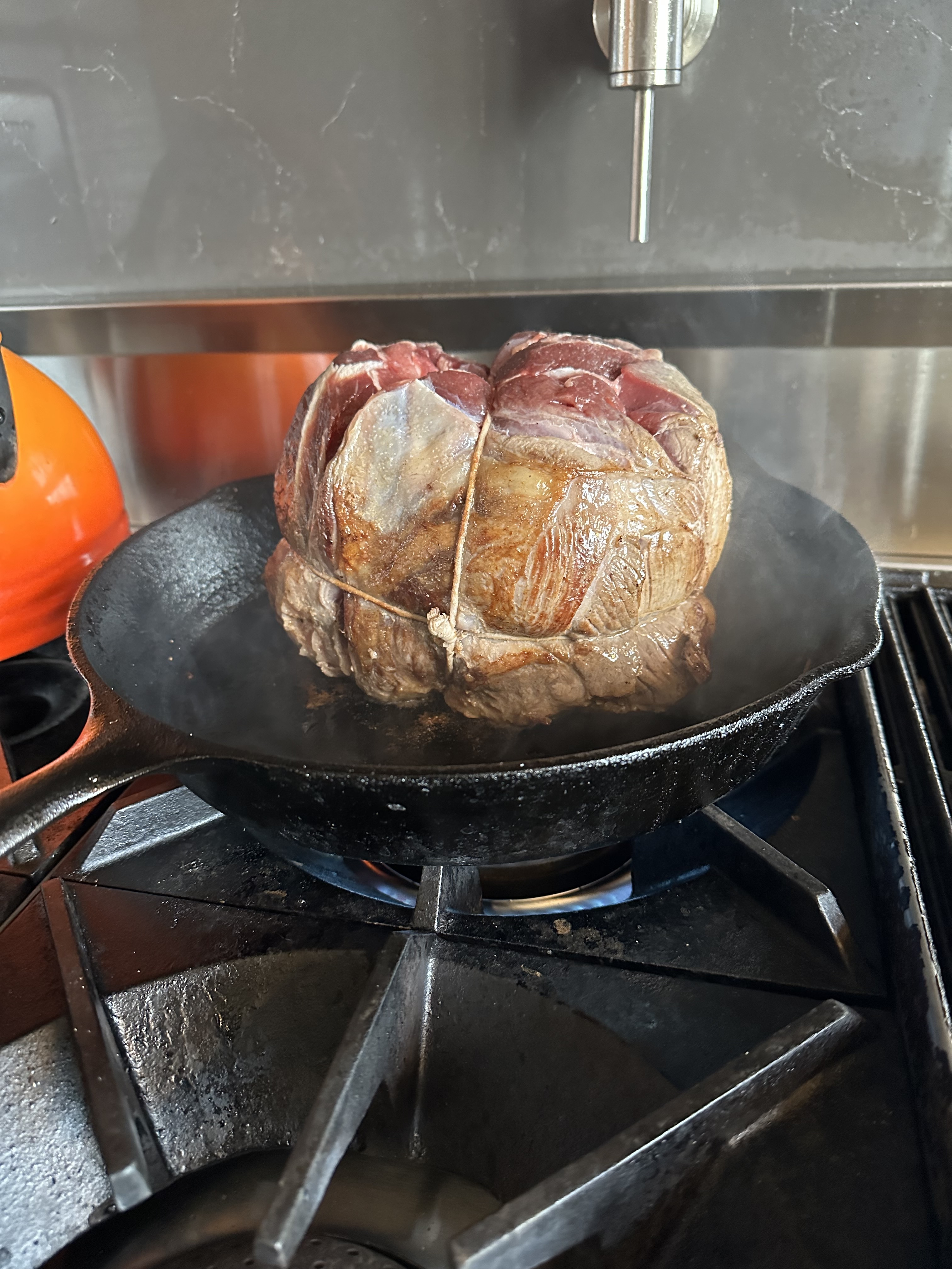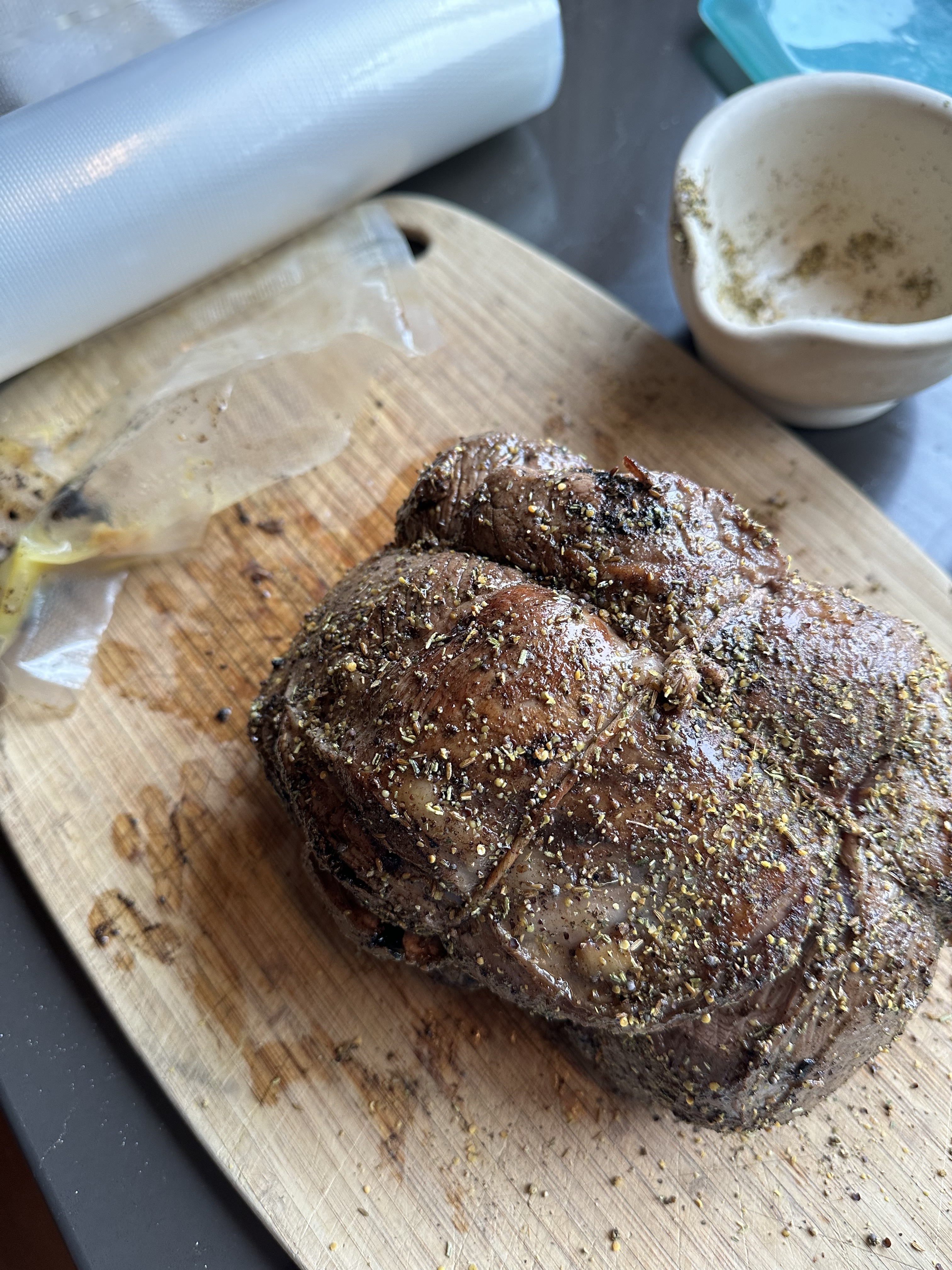 Local lamb I split w a friend. This is leg roast. Seared it off then rubbed and stuffed w confit garlic and coated w fresh toasted and ground black mustard seed, cumin, tellicherry, thyme, mint. Sous vide at 130 for 6hrs. Then roasted at 500F 10min. Made a lamb stock w t-bone and shanks that I had smoked, then added that to the sous vide bag collagen and reduced with some pinot for an ultra rich demi glace. The demi glace is a high level of difficulty when working w several reduced components and no mounting butter, but pulled it off. Potatoes fondant, parsnip purée, and a subtle mint chimichurri.