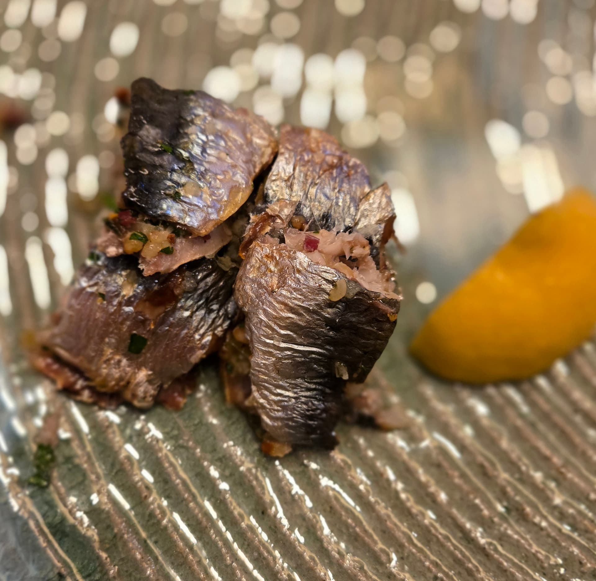 We moved to the table next for a dish of super fresh sardine fillets stuffed with a melange of pine nuts, herbs, jamon, golden raisins, red onion, garlic, and manzanilla. @Zachgoldstein had the idea of putting some remaining toast to work, here, but Jonathan and I had already finished our fish! Luckily, we always make one extra in case a portion doesn’t come out right, so we both had seconds on toast.