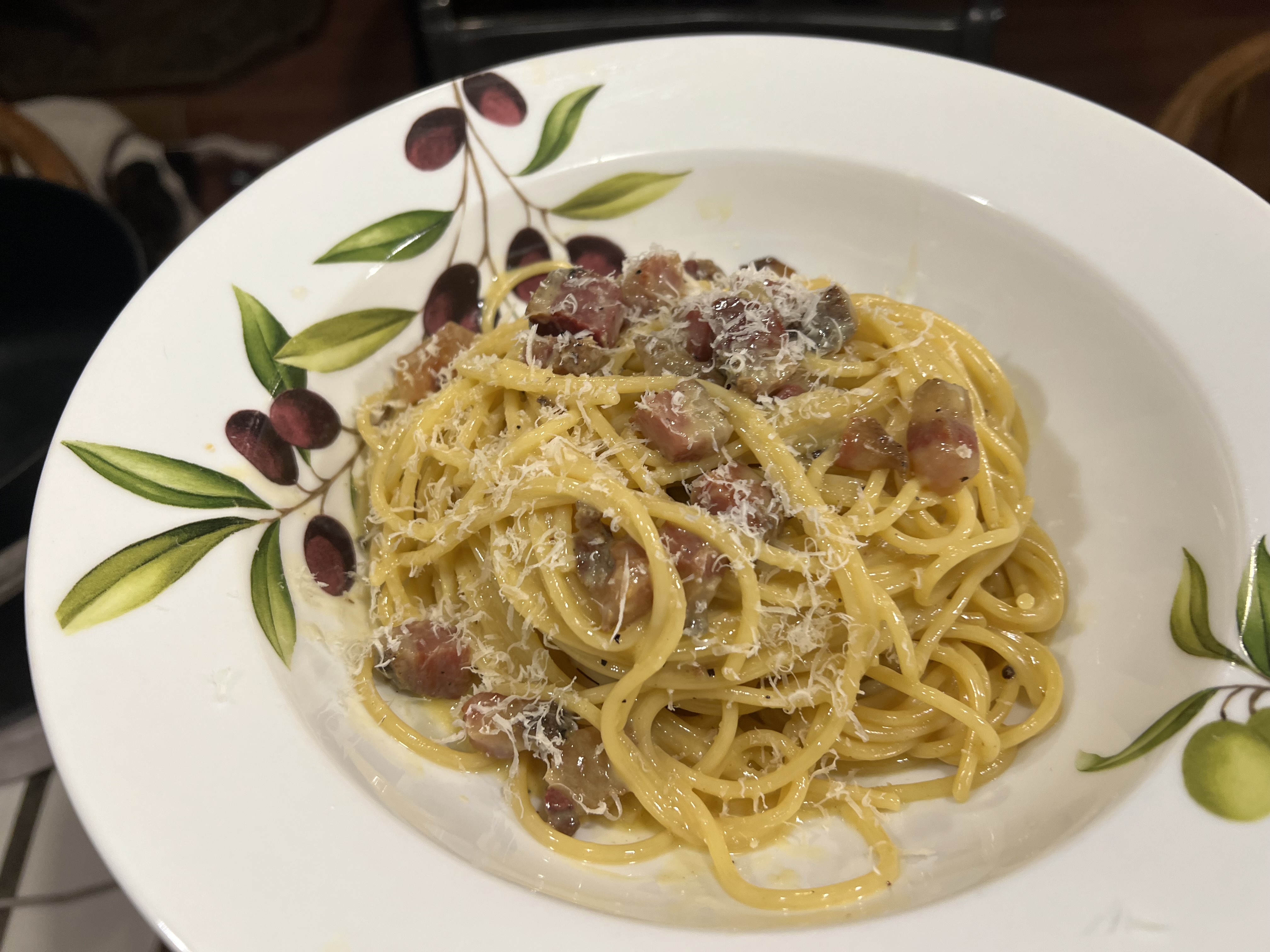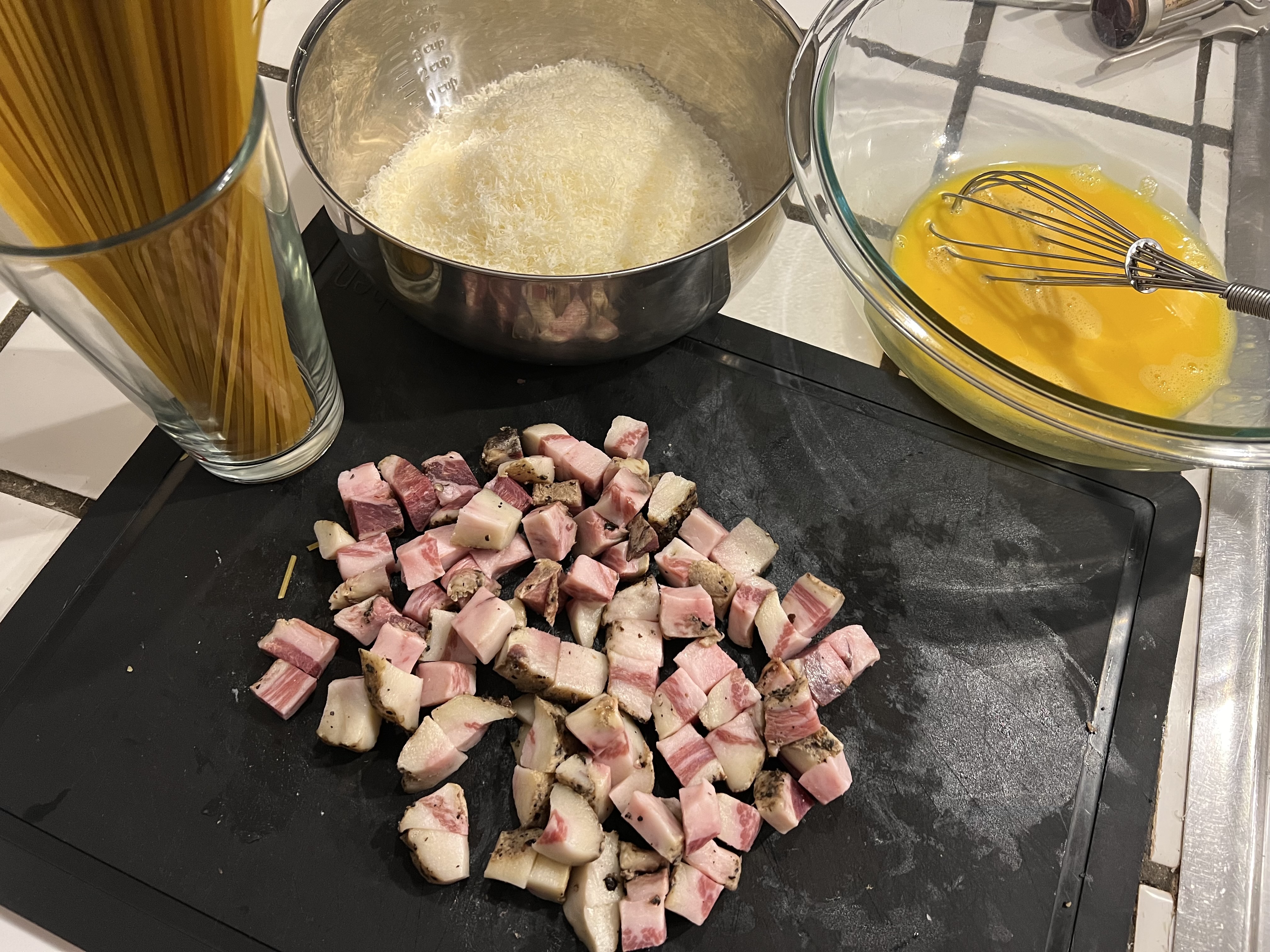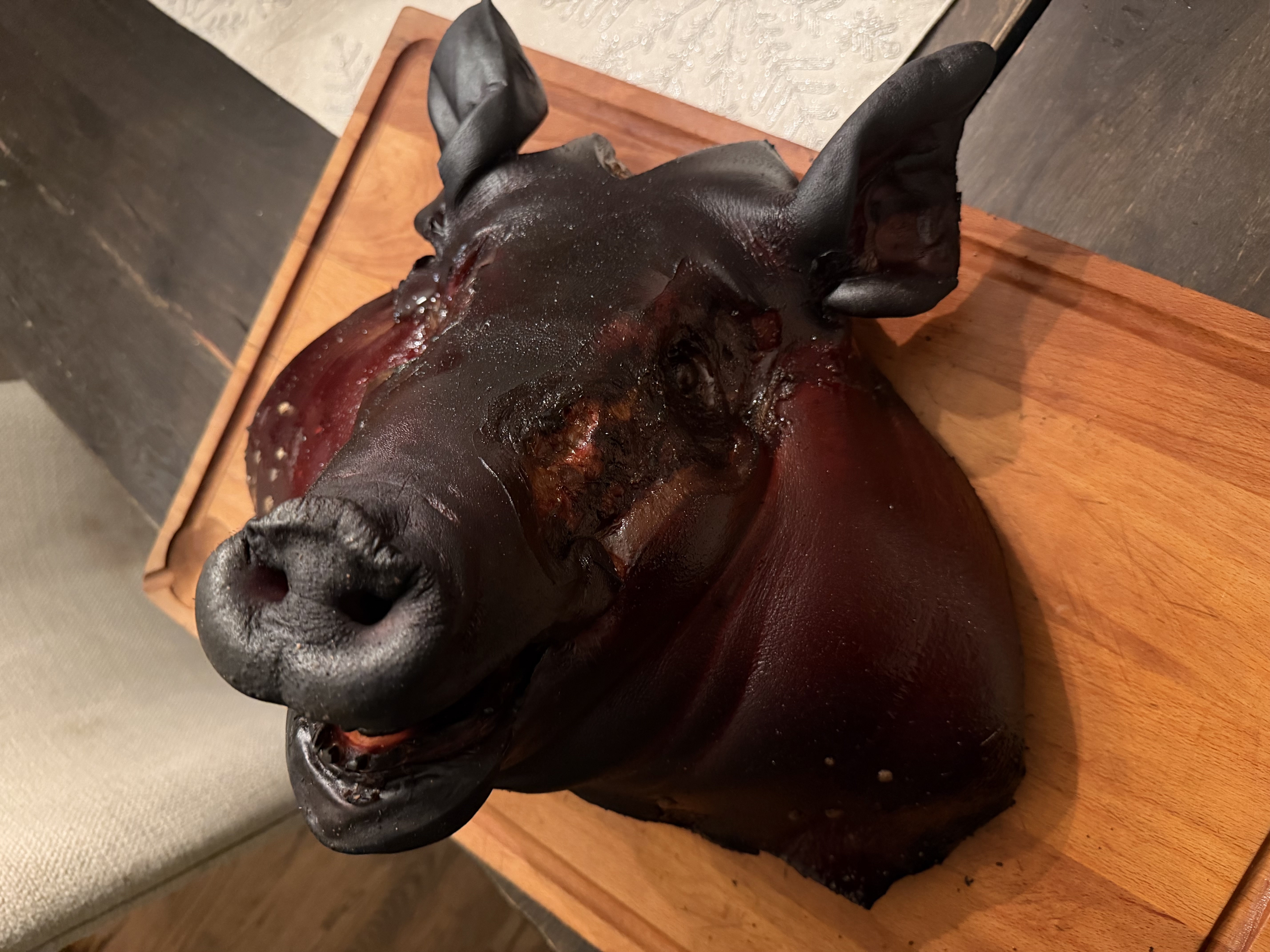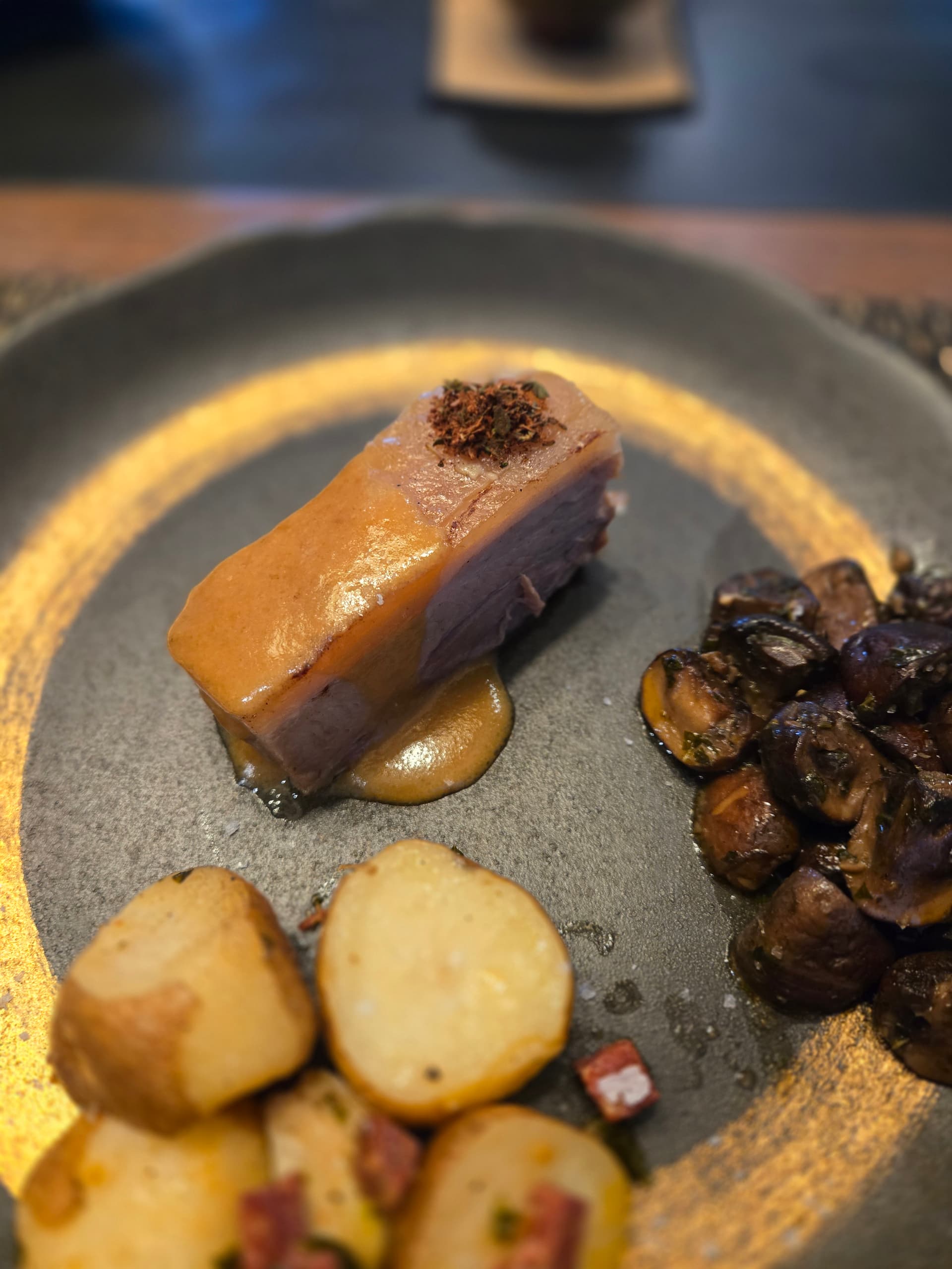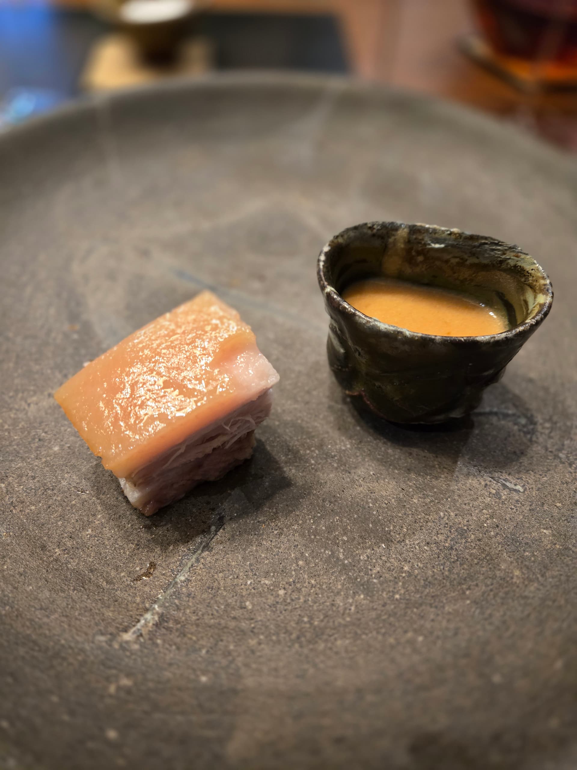 Finally, the piece de resistance, one of my favorite dishes Chez Kirschbaum/Read - skin on pork belly rubbed with sugar/thyme/garlic/bay leaf/white pepper/salt, pressed for 24 hours, then slow braised in chicken stock. Meanwhile, make a sauce of fresh made almond milk/cream/lemon peel. Recombine after straining for another hour of simmering. Final sauce is reduced, and a splash of amaretto is added. We are used to doing pork belly crisped on top, which is wonderful, but there’s something deliciously unctuous about the soft texture in this dish. I wish I had room for seconds!
