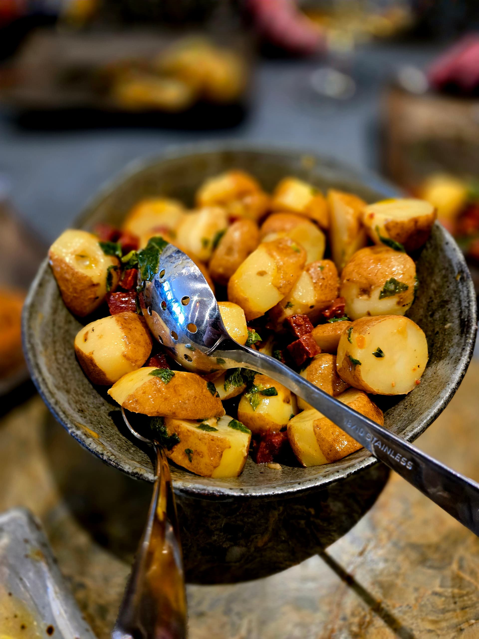 Second was the vegetable course of crimini mushroom cooked with olive oil, garlic, oregano, parsley, sherry vinegar, manzanilla, and some amazing little potatoes with mint and chorizo, dressed with lemon/olive oil/mustard/sherry vinegar. We had some very good bread on the side to soak up juices.