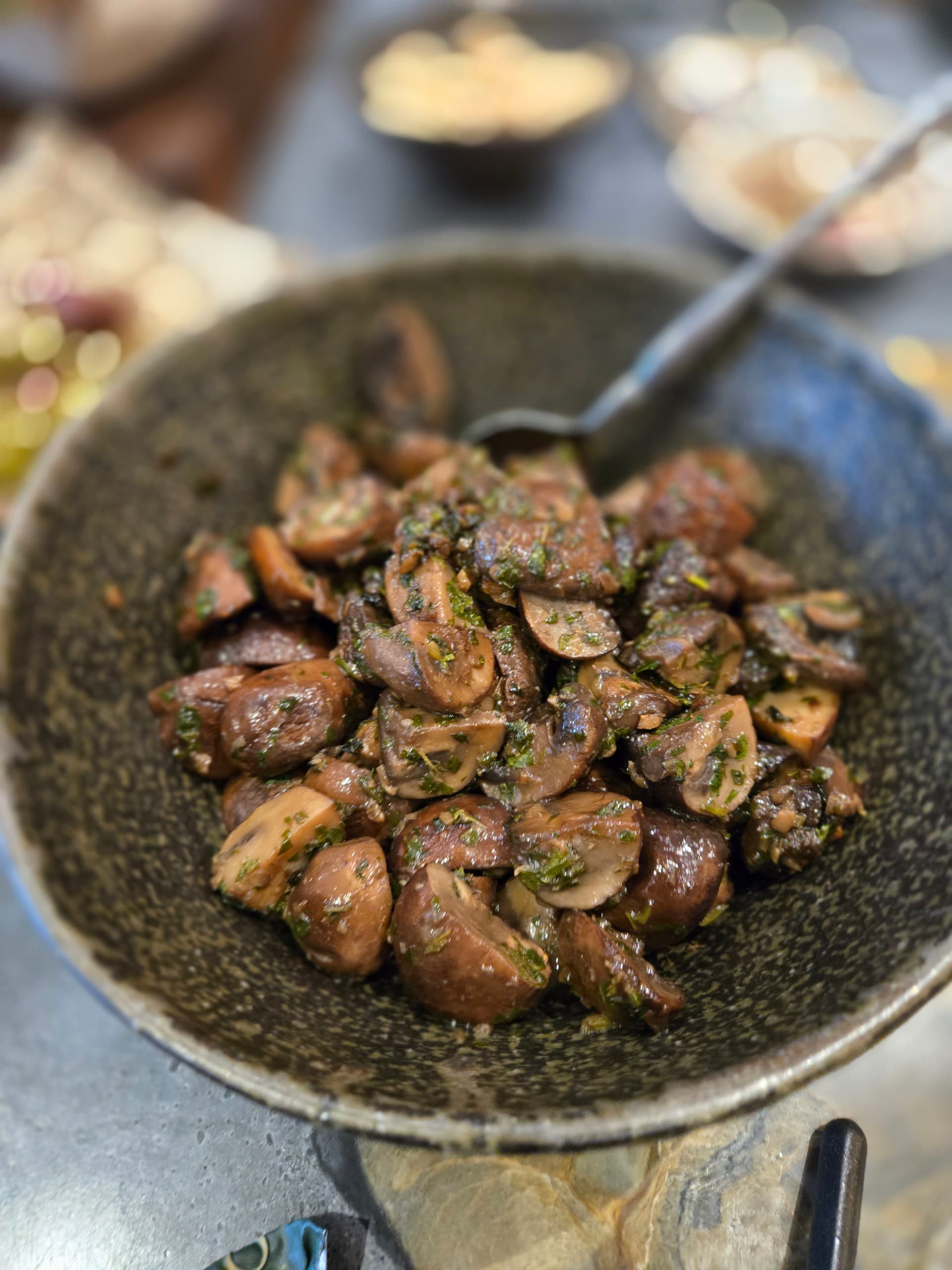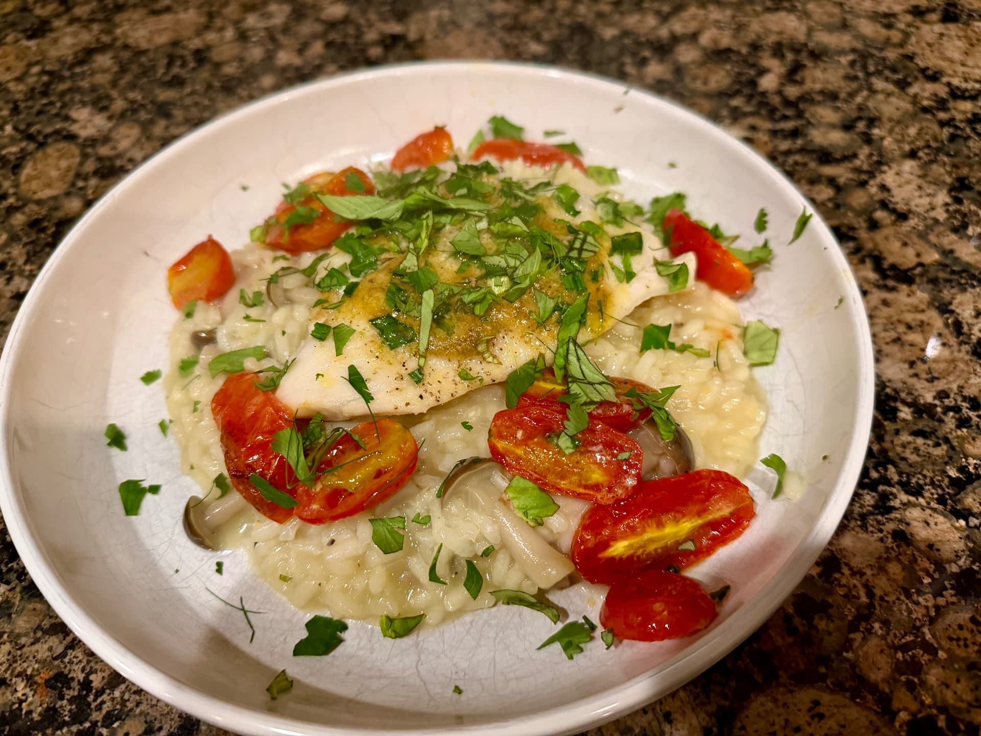 Roasted fish with spiced butter an dtomatoes over brown beech mushroom risotto. I used garam masala as the main spice in the butter, with garlic, lime zest, fresh herbs on top, added fried shallots after the pic was taken. Normally I make this dish with roasted potatoes but when inspired I go for a risotto instead, and brown beech mushrooms are perfect for it as they are a much more subtle flavor profile than baby bella or other ‘normal’ mushrooms, which take over the flavor profile of the dish.