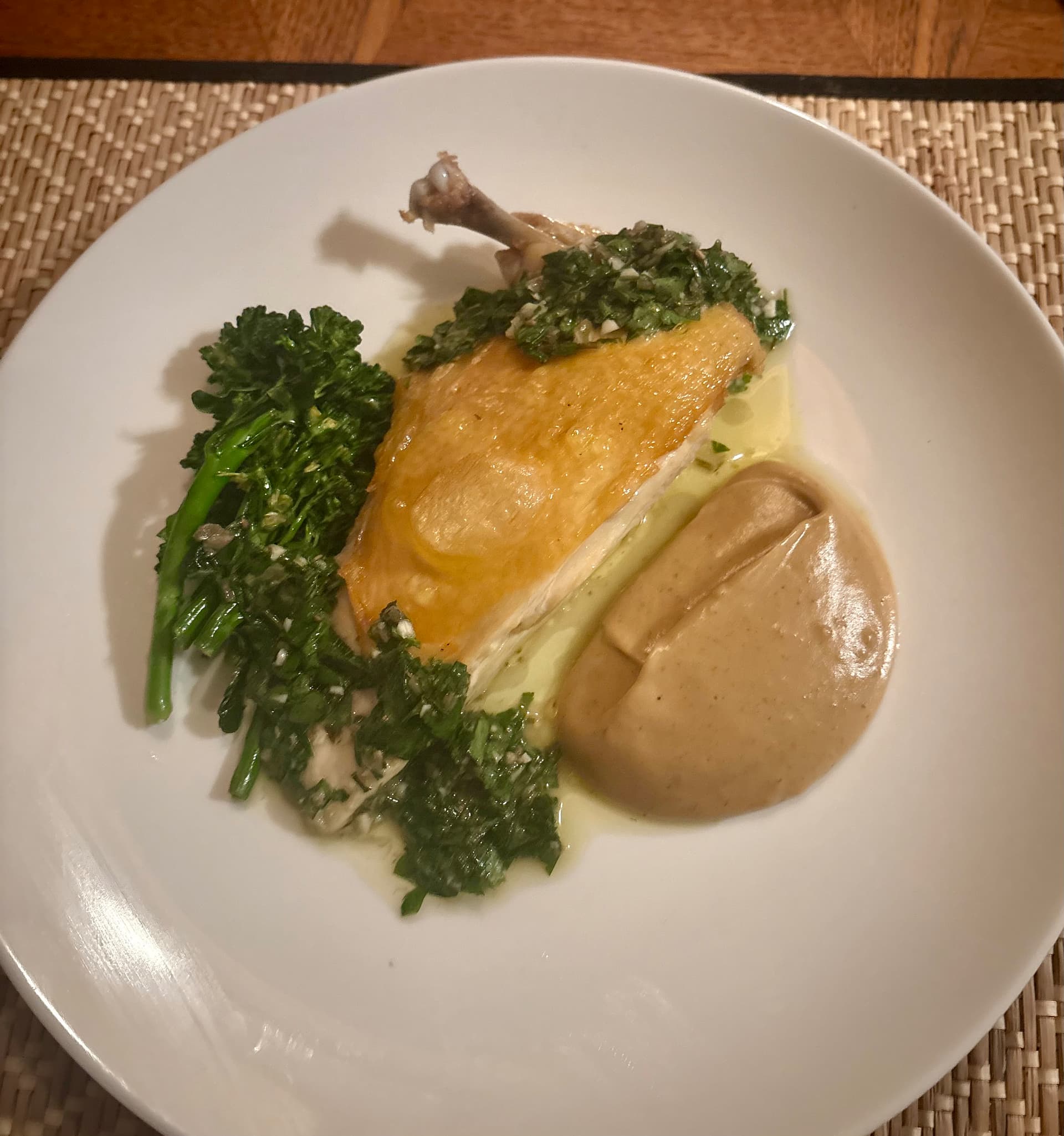 Been a stupid and busy week for me, and I finally had a chance to cook a nice dinner, so I wanted to try a technique that I’ve never done before - Ladle frying. The chicken was first cooked sous vide at 145 for an hour or so, then left to cool and dry out in the fridge. Then I rigged up an elevated rack inside a pot, with a separate pot of oil heating up. Once the oil reached temp, I ladled the oil over the chicken until the skin crisped up. Here is the only pic I took of that process