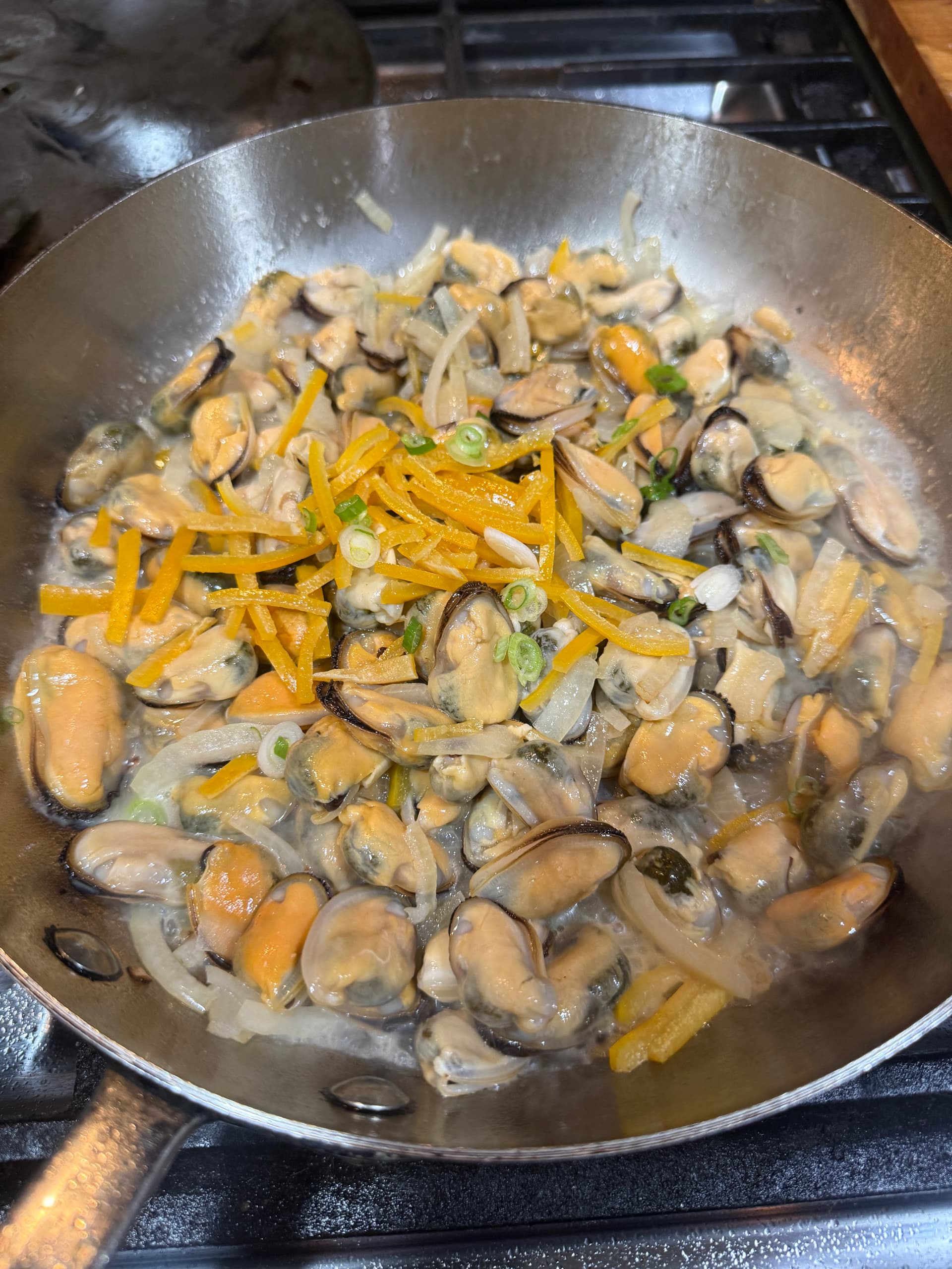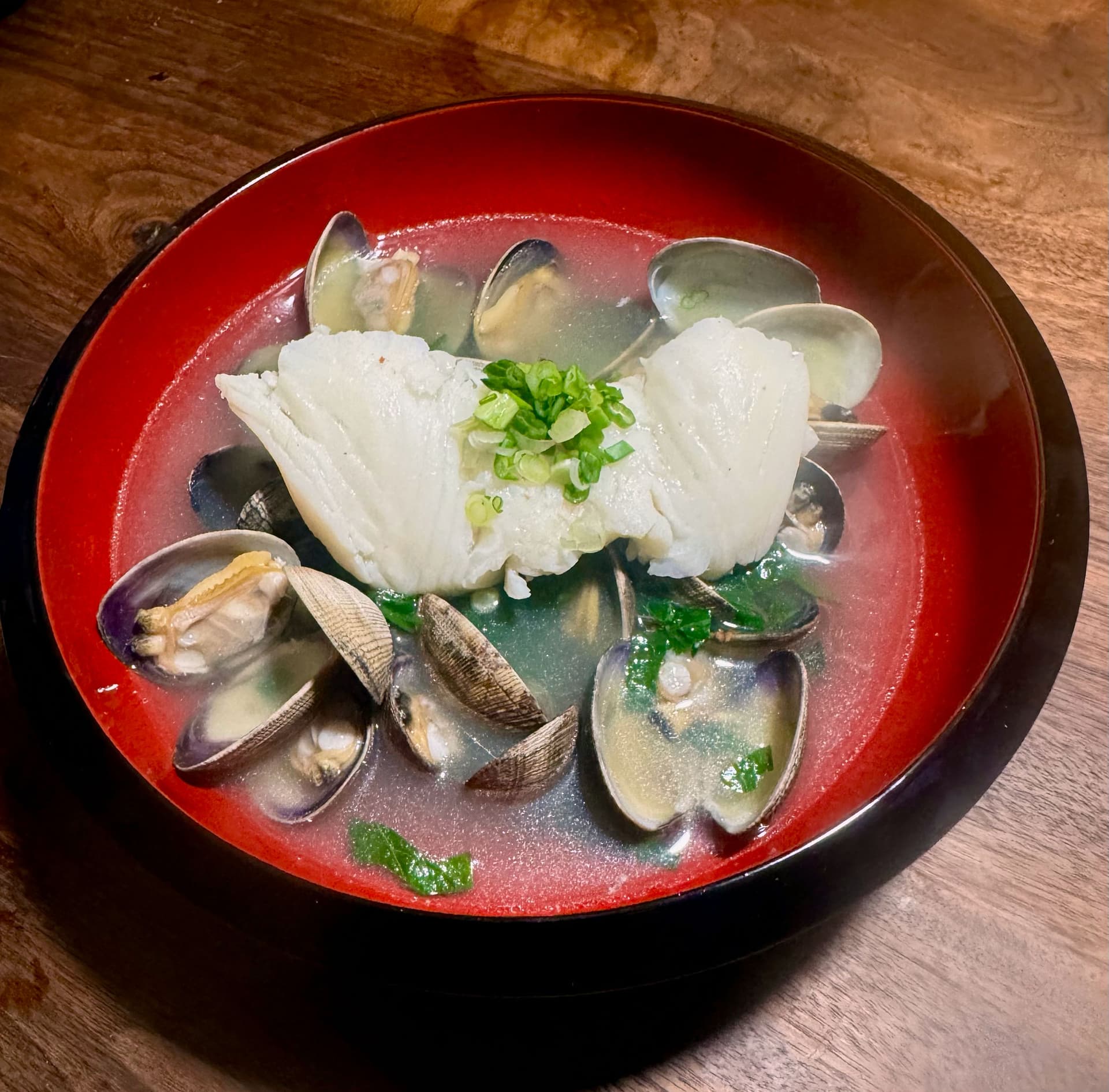 Soup with a broth of kelp, shaved bonito, ginger and green onion (strained), threw in some littleneck clams just until they opened and poached a small piece of chilean seabass in the finished broth and removed, then added some spinach and freshly shaved bonito and plated.