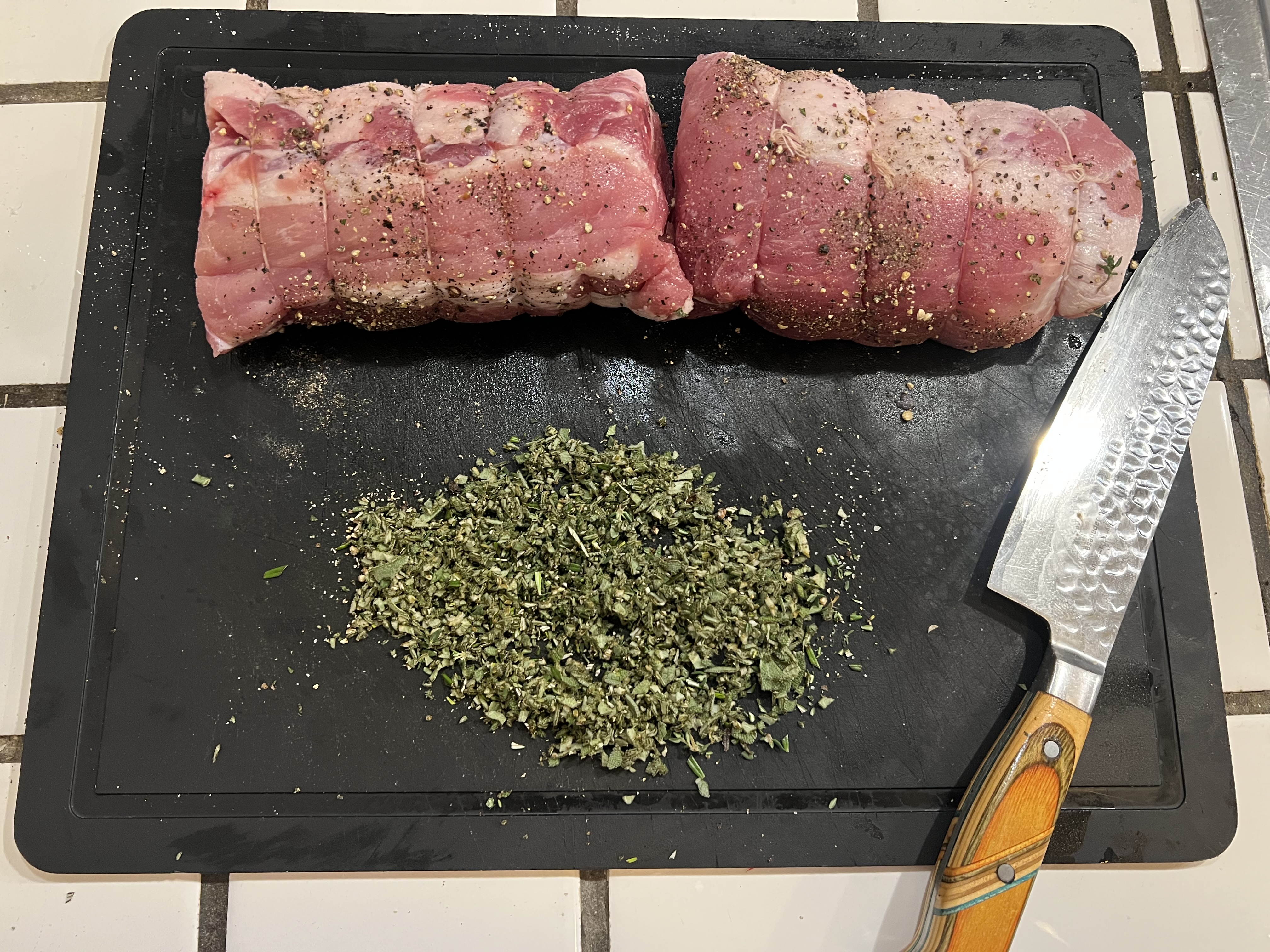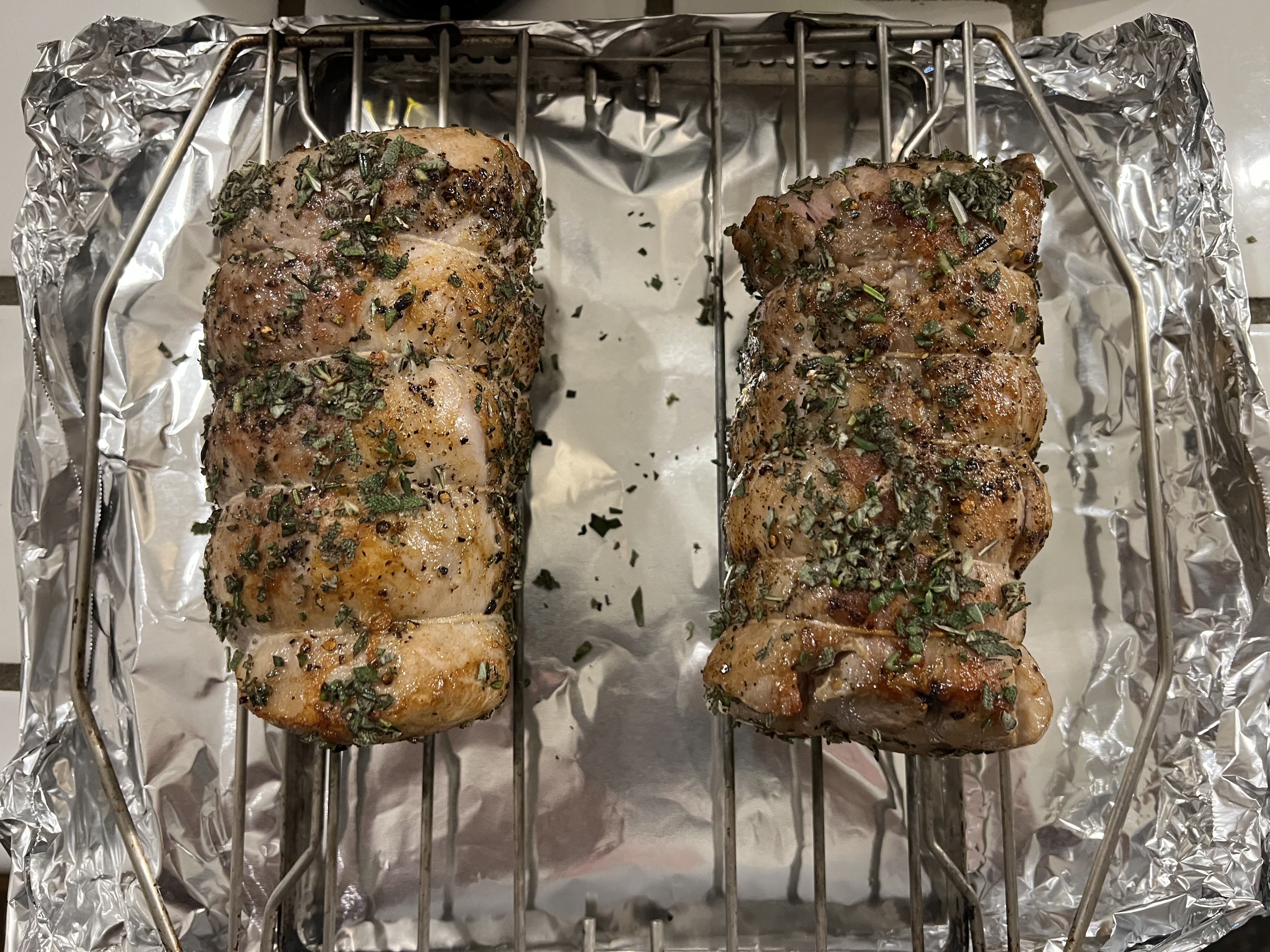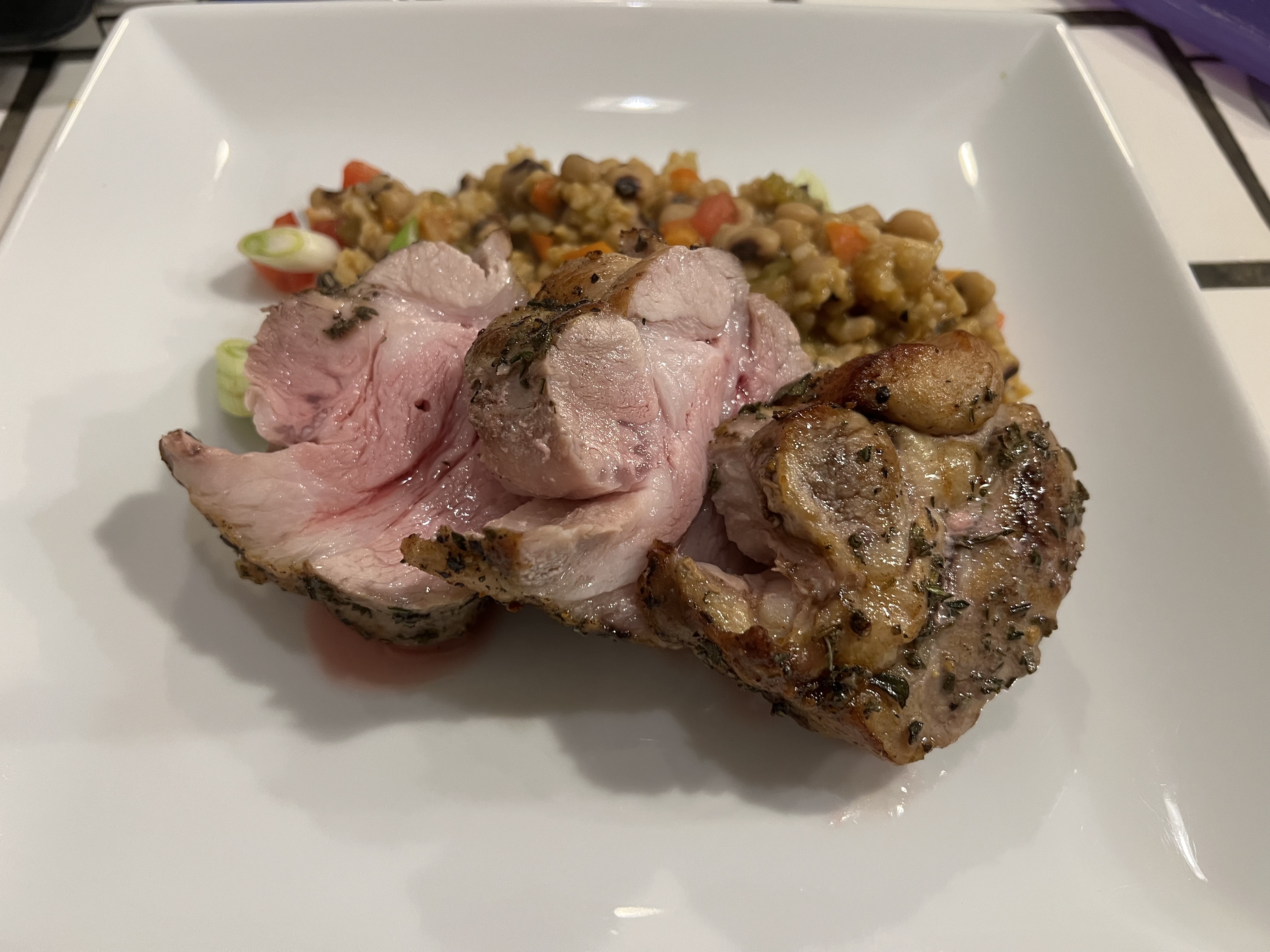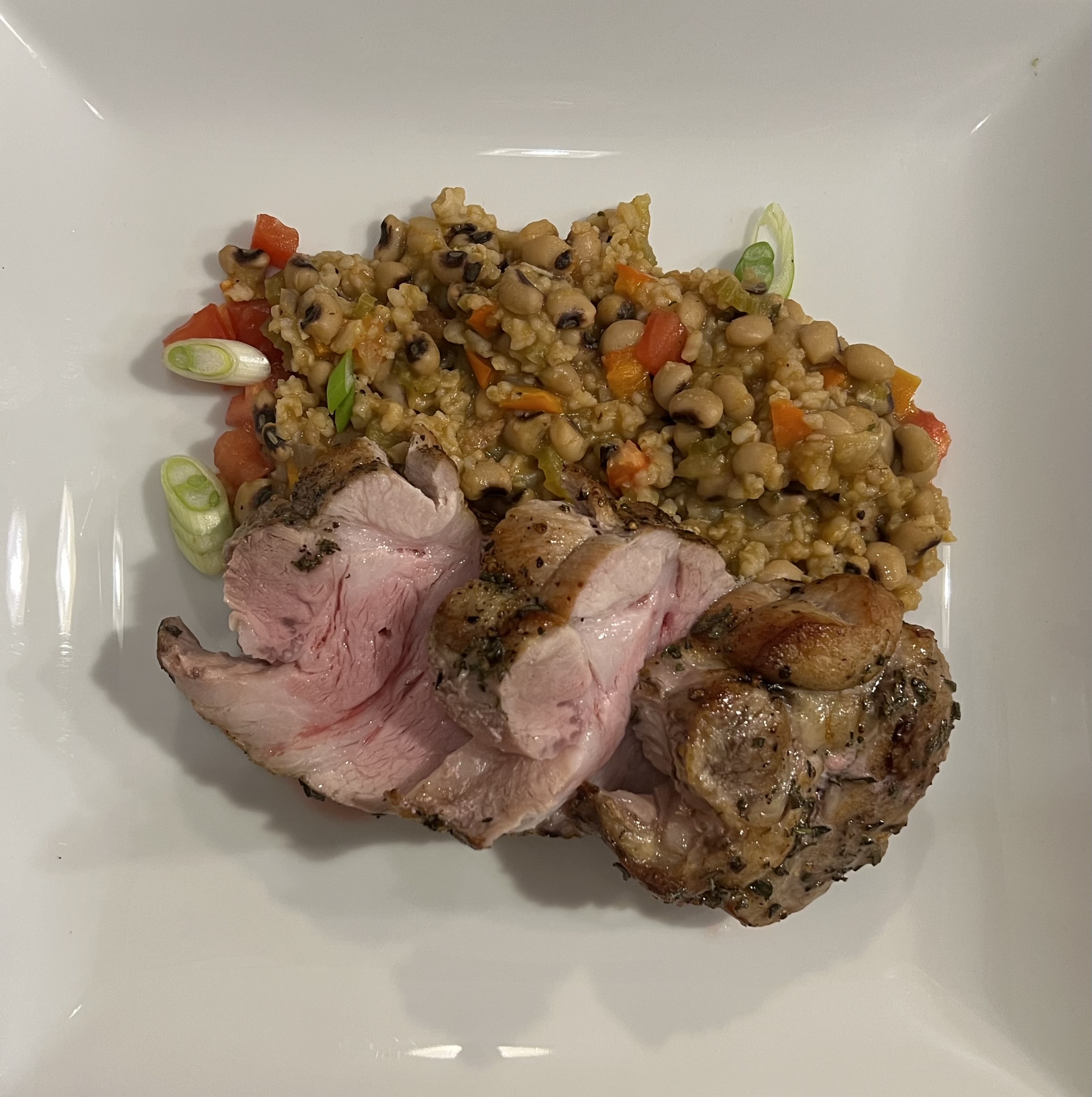 Pan seared with S&P in bacon grease, then rolled in a mix of fresh Sage, Rosemary and Thyme. Roasted to 135°. Black Eyed Peas with onion, celery, red bell pepper, garlic, brown rice, smoked paprika, cayenne, S&P, fresh thyme, veggie stock. Garnished with tomato and scallions.