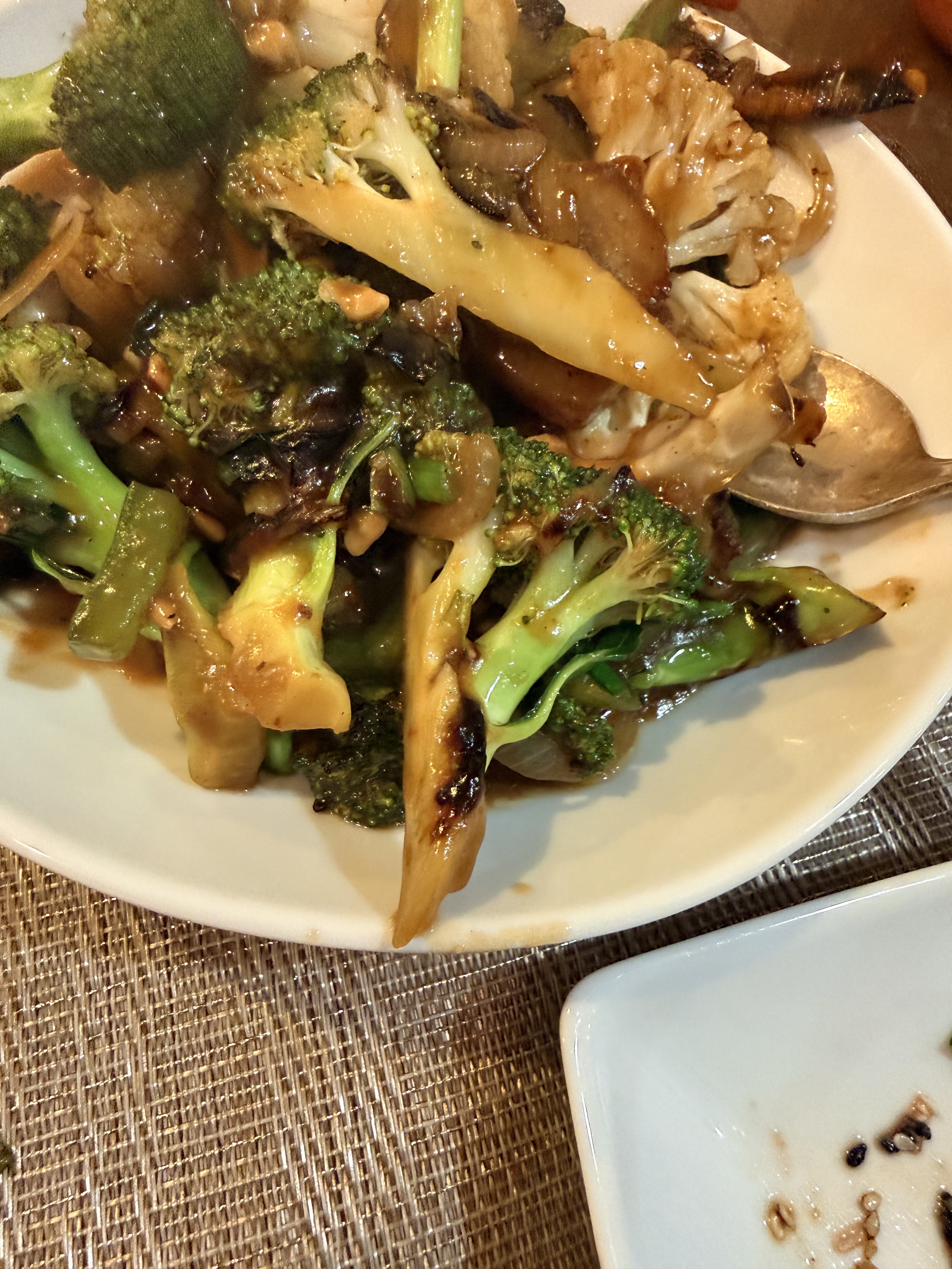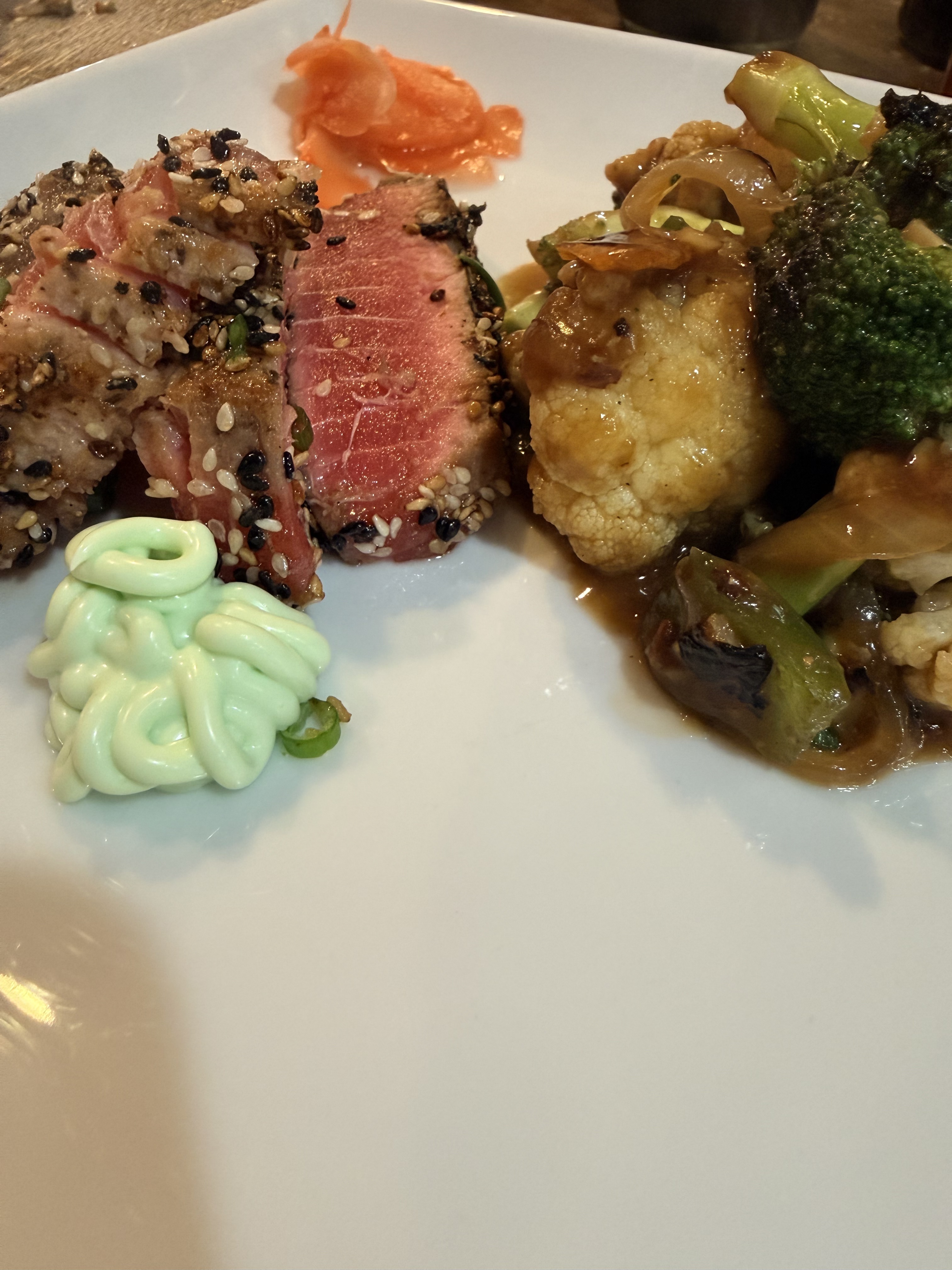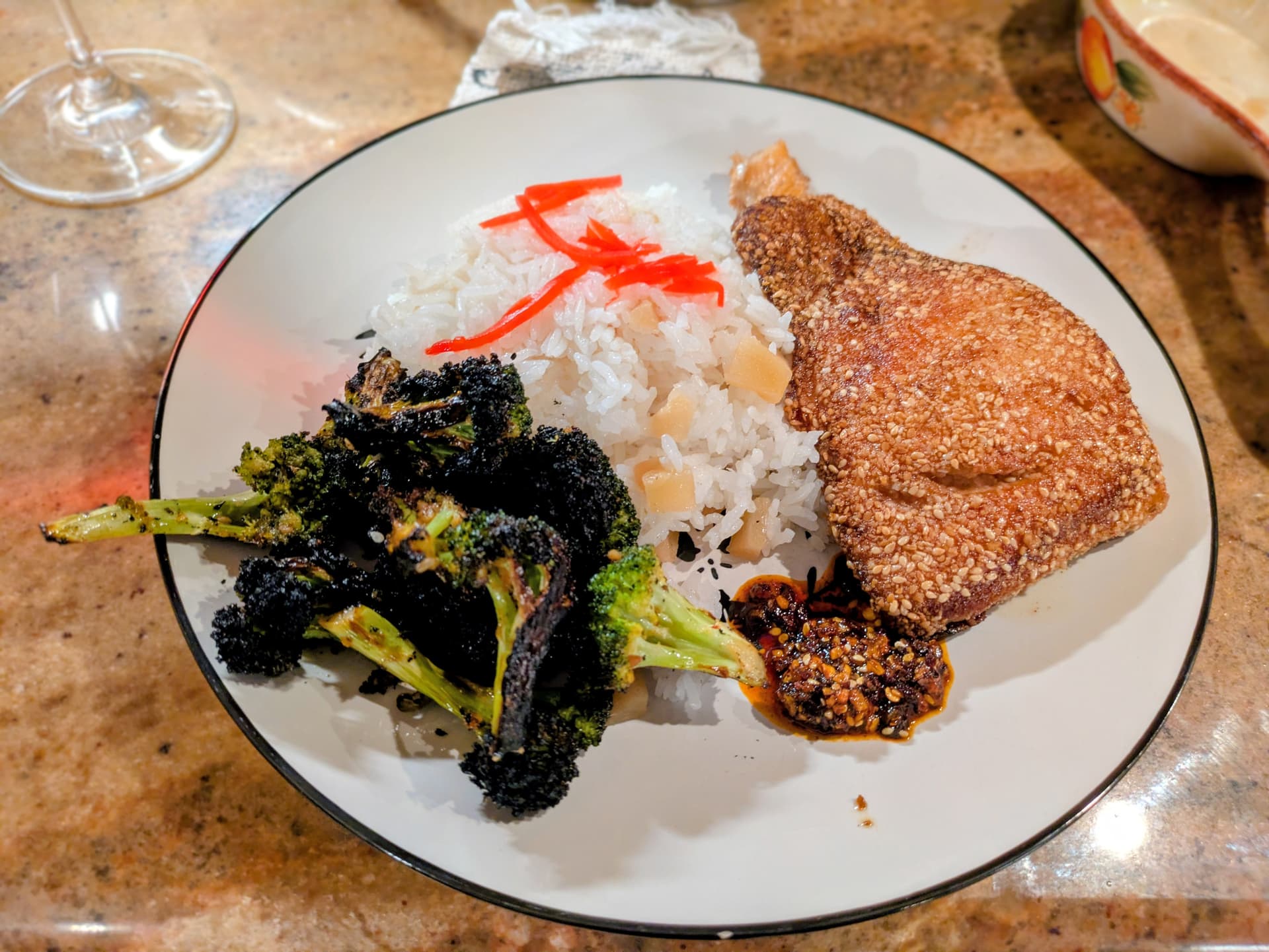 Sesame crusted salmon, blistered broccoli, and jasmine rice with chunks of crystallized ginger & beni shoga (red pickled salted ginger).