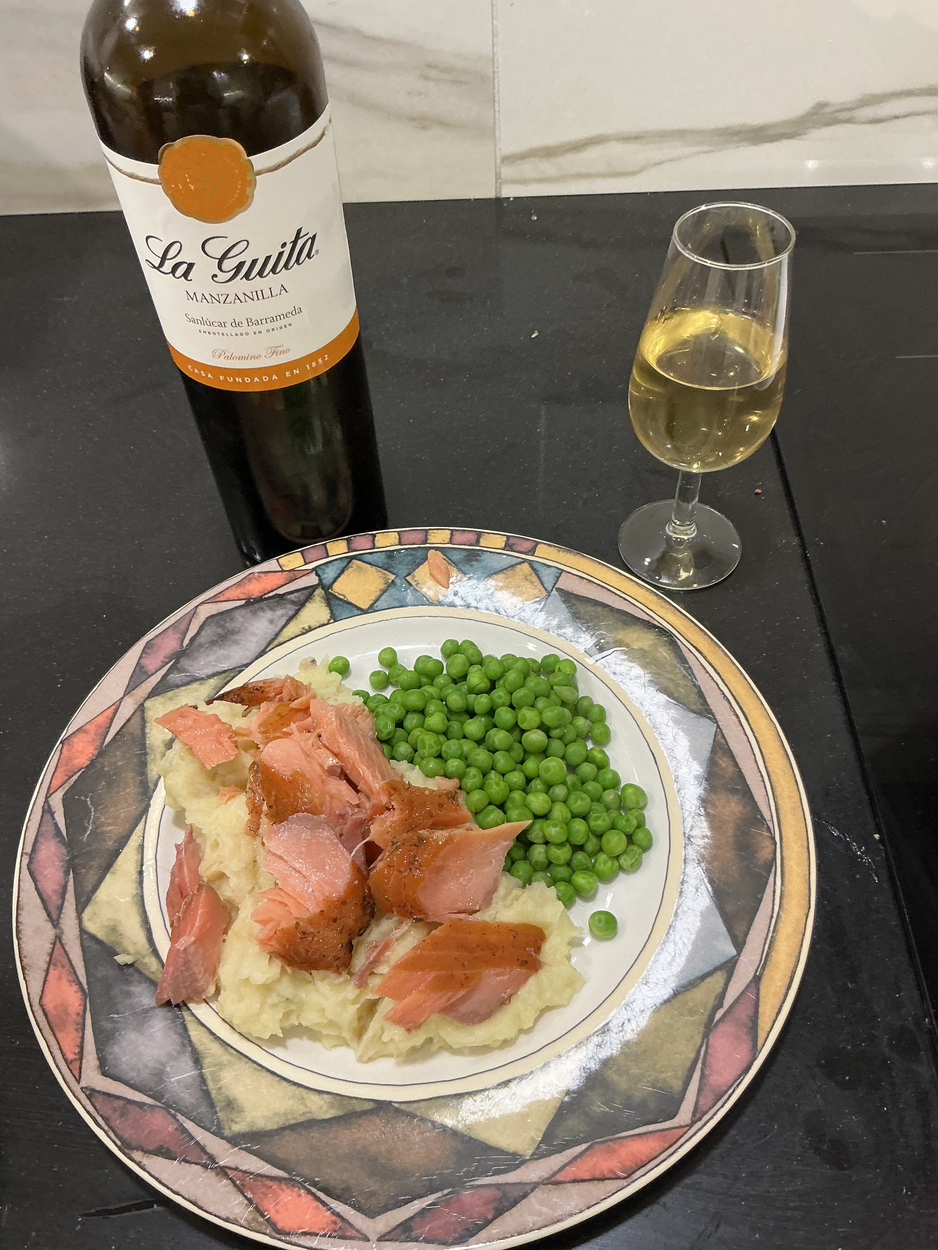 Chef was lazy today. Local Smoked trout over potato & celeriac mash (w faint touch of roast coriander) and peas - with Manzanilla. The combination was lovely. Sometimes simple is what we need, especially after the festive season.
