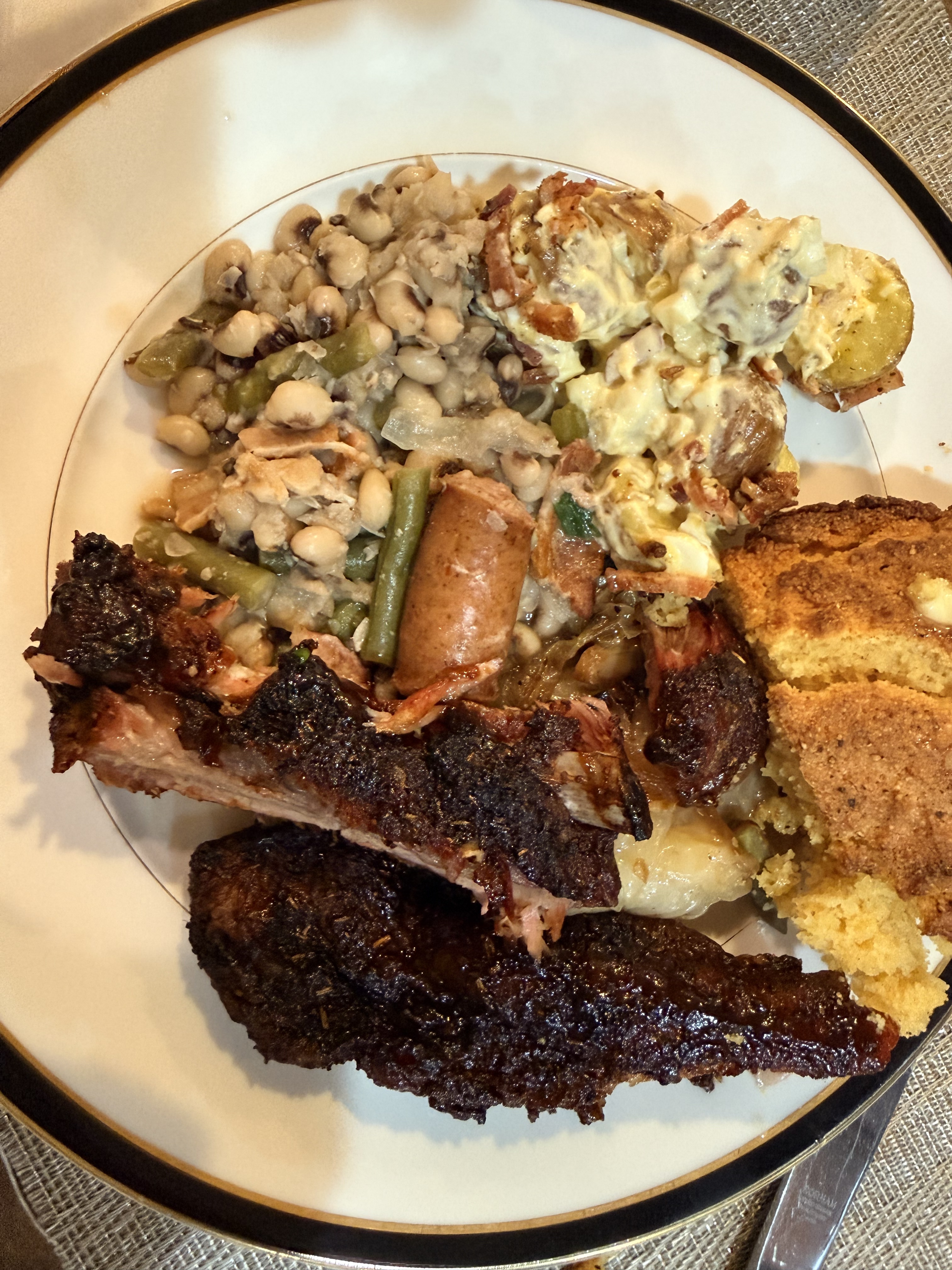 Black Eyes with snaps, braised cabbage, potato salad, baby backs and country corn bread.