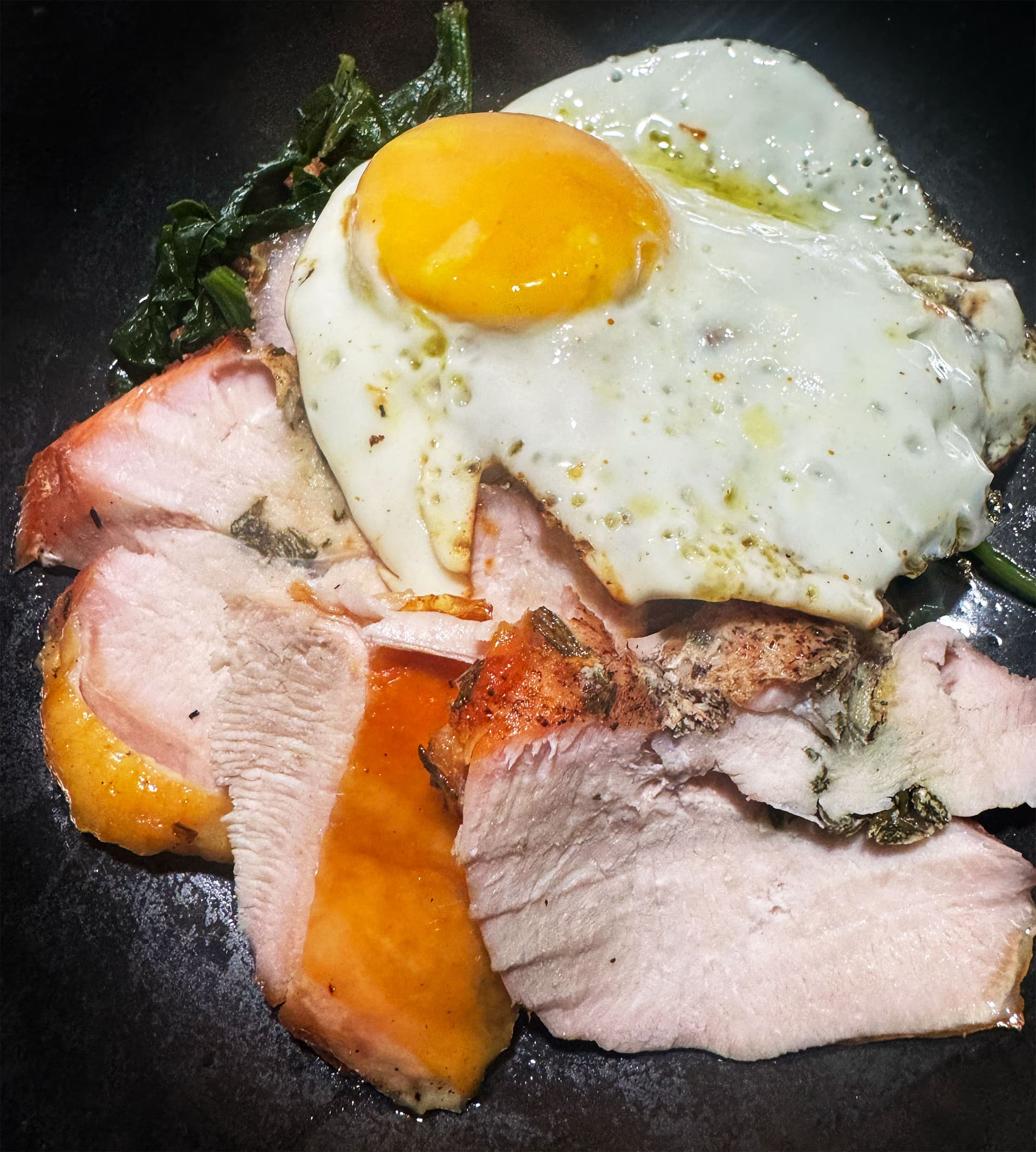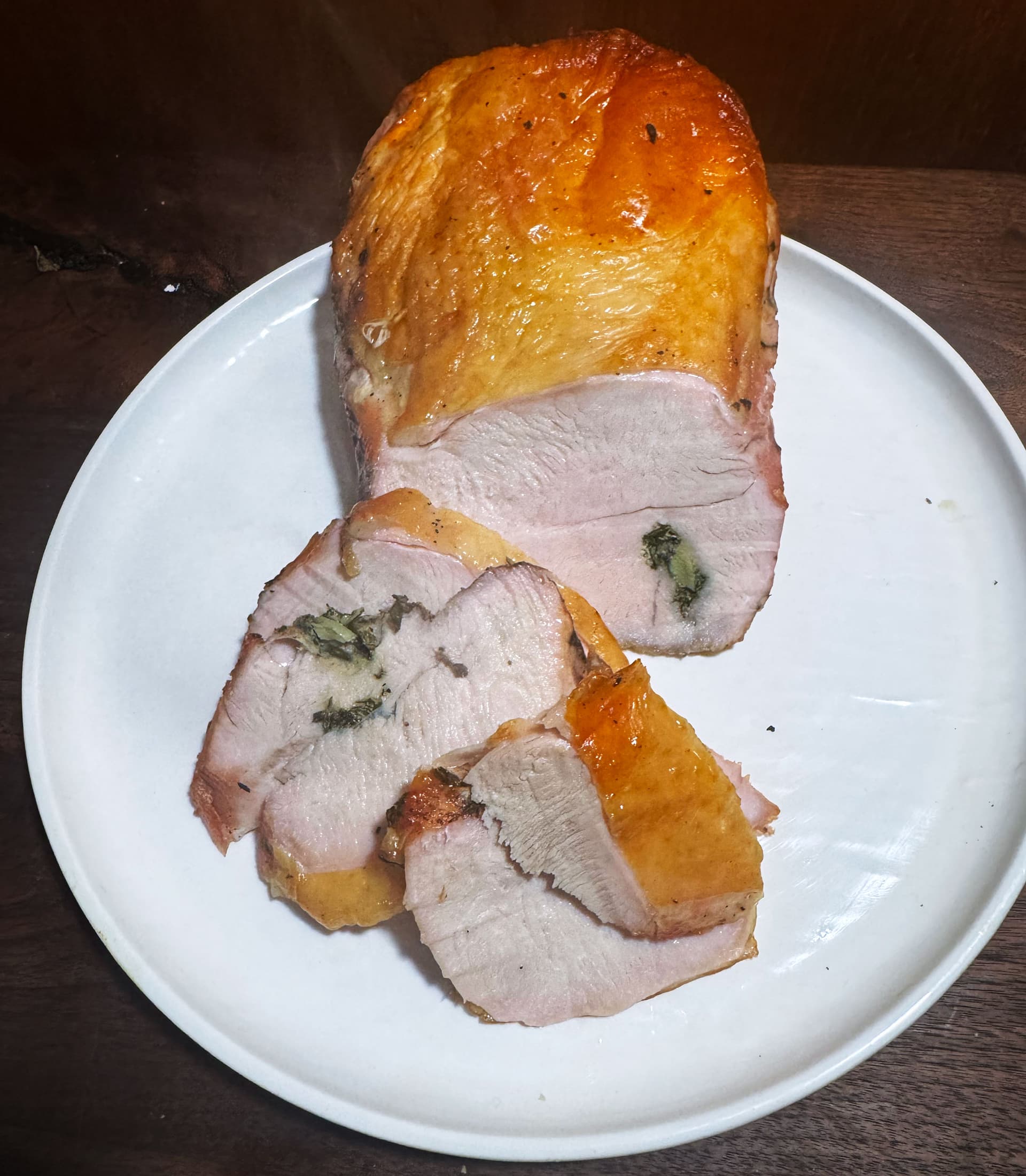 Stuffed turkey breast with thyme, rosemary, sage and a little toasted garlic, and crusted with the same herbs on the bottom. Sous vide 145º for 2.5hrs and wrapped in the fridge overnight. In the oven cold out of the fridge about 475º until the skin looked good. Had with sauteed spinach and a chicken fat fried egg.