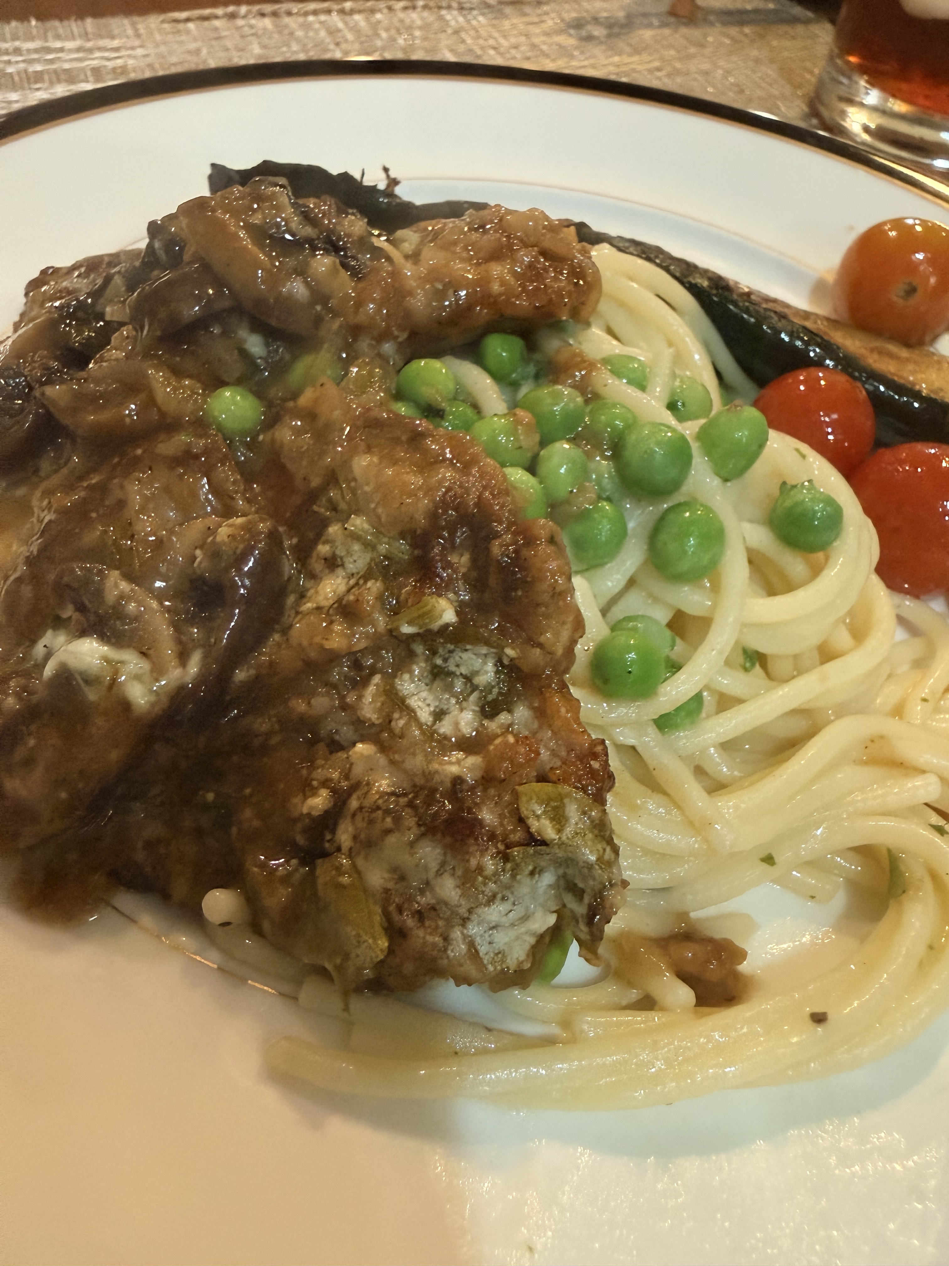 Veal with mushroom demi-glace, pasta with peas and garlic. Melted zucchini and tomatoes. The salad was shaved fennel, grapefruit and a double cream feta.