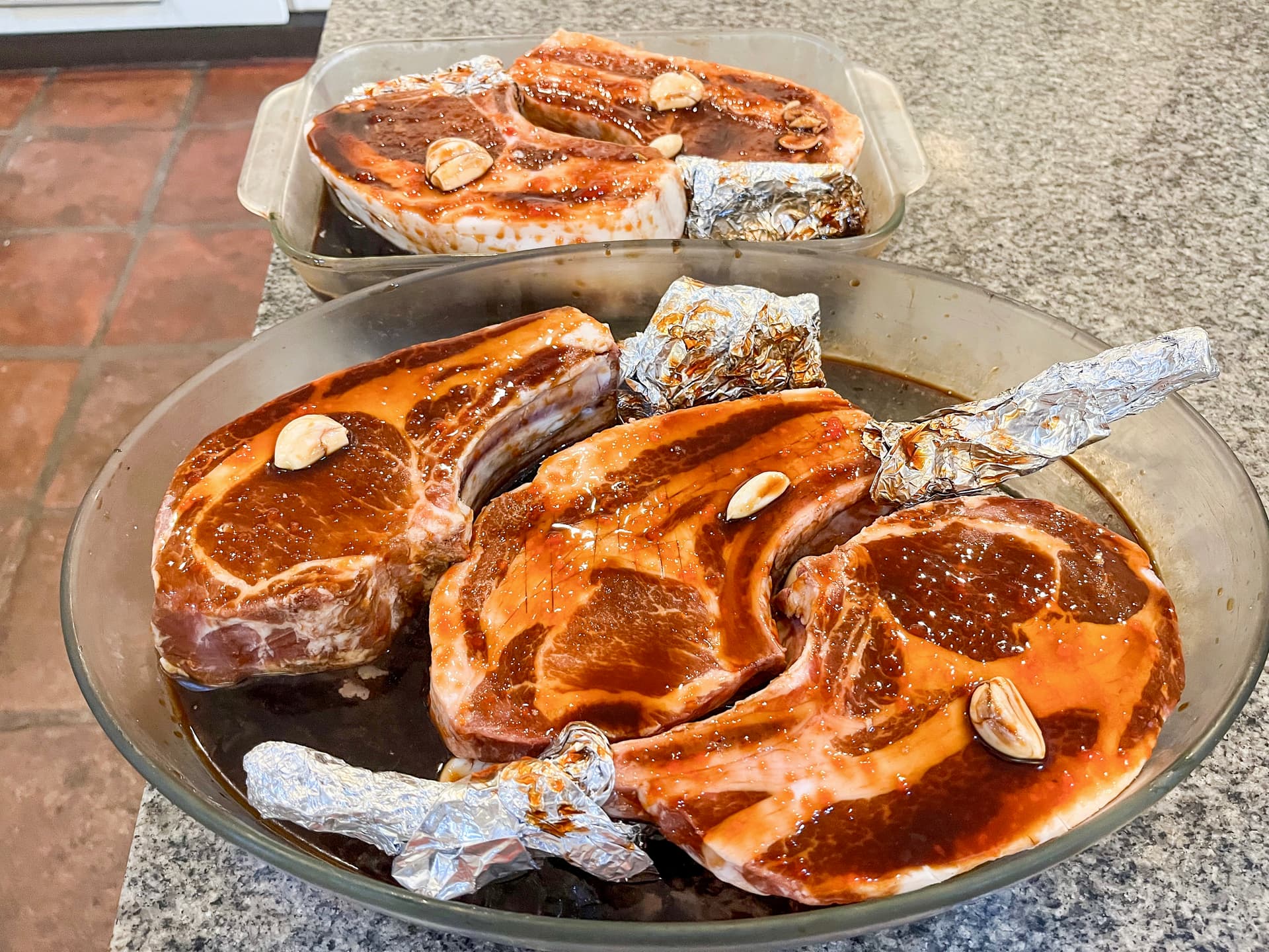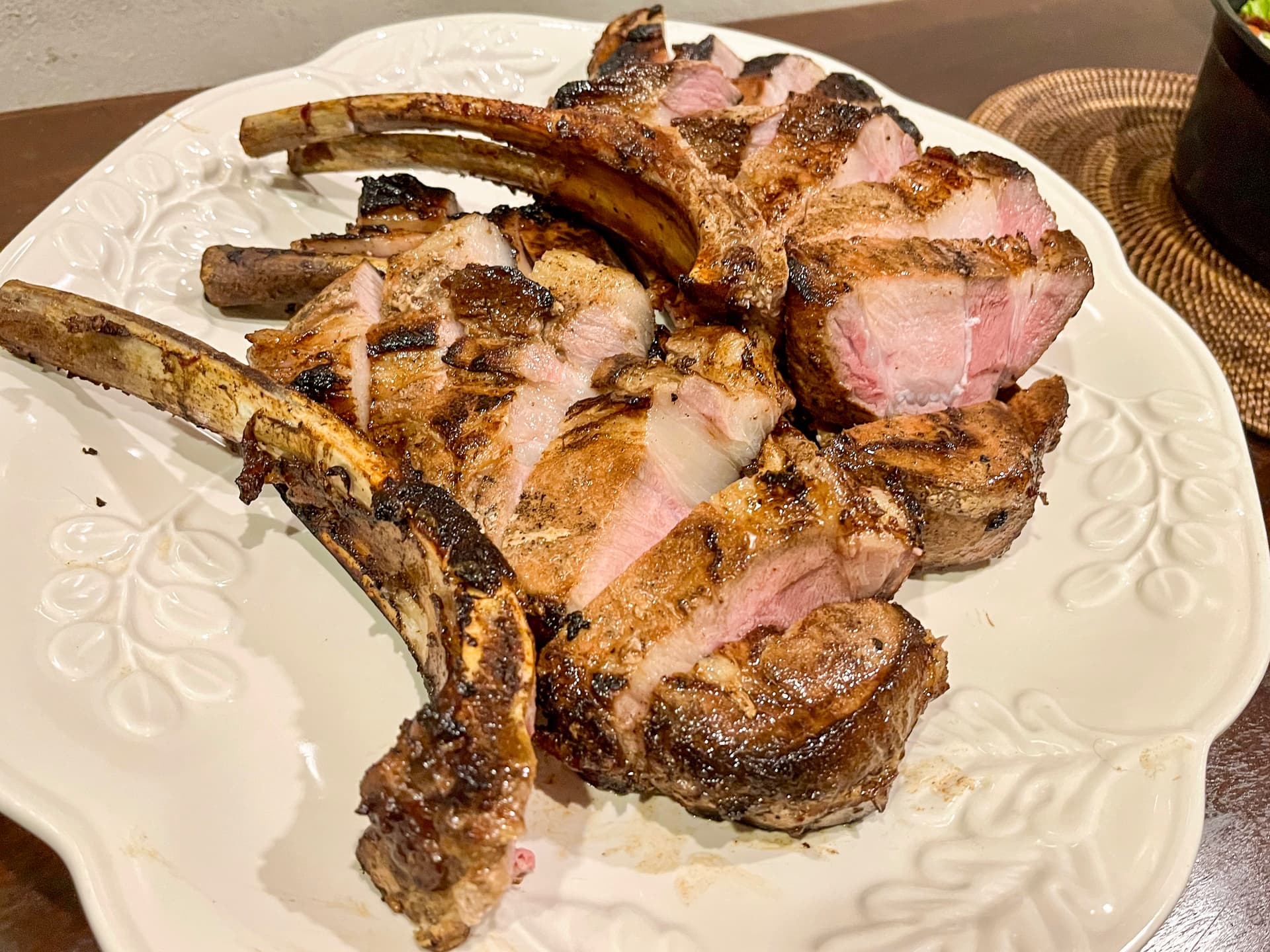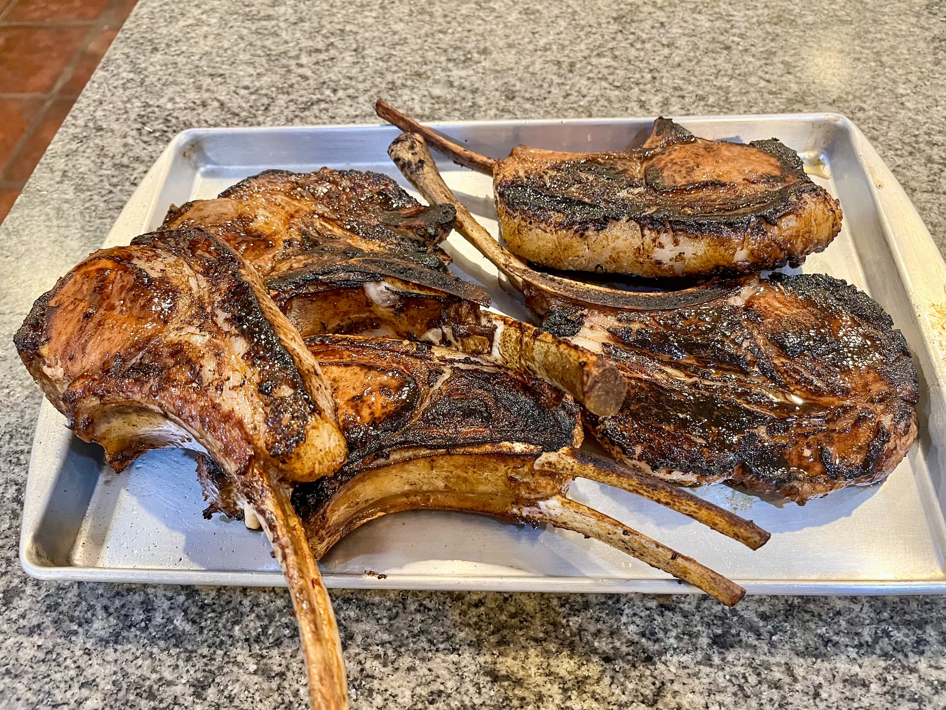 Last night, I made seared-then-roasted Ibérico pork tomahawks in the style of traditional Filipino pork bbq. This involved marinating the tomahawks for around 10 hours in a mixture of soy sauce, calamansi (Philippine lime) juice, garlic, banana catsup, brown sugar, etc.
