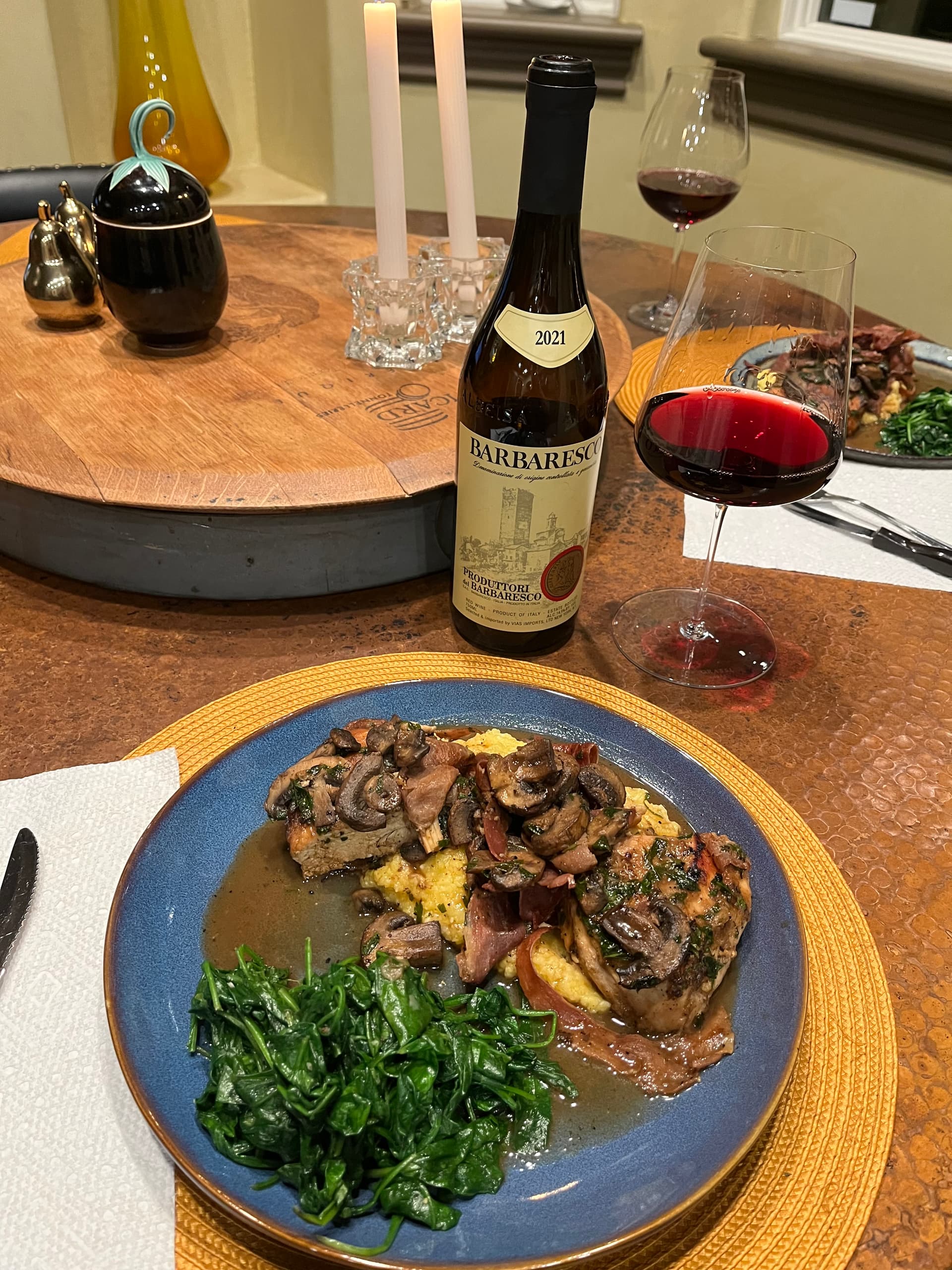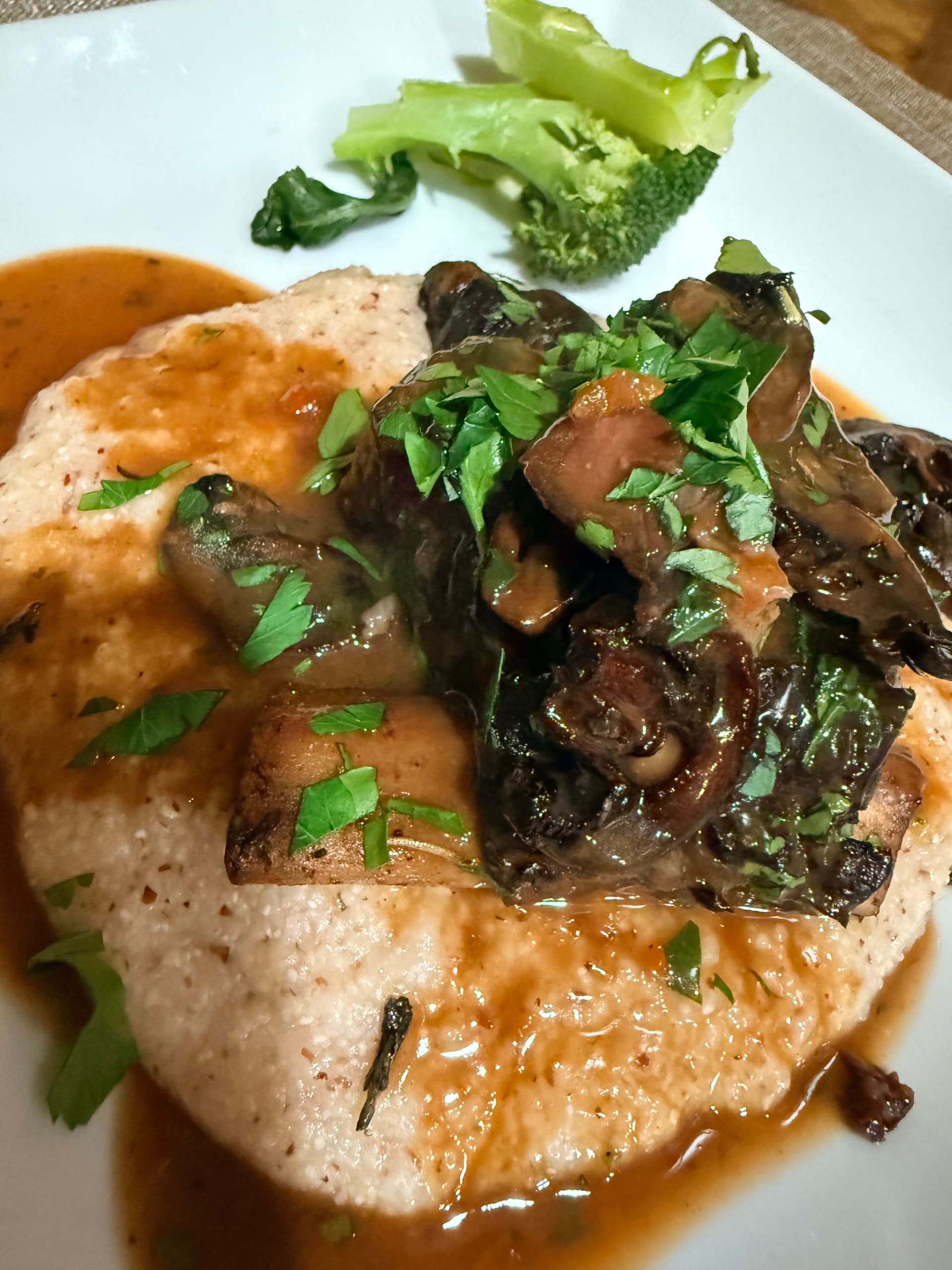 Short ribs with seared mushrooms on Bayou Cora grits. The grits are a “field blend” of heirloom corn varieties. Some are red, some blue some yellow. Hence the kind of murky color. Very corny in taste. We had a pear salad with some chili/honey coated almonds as well.