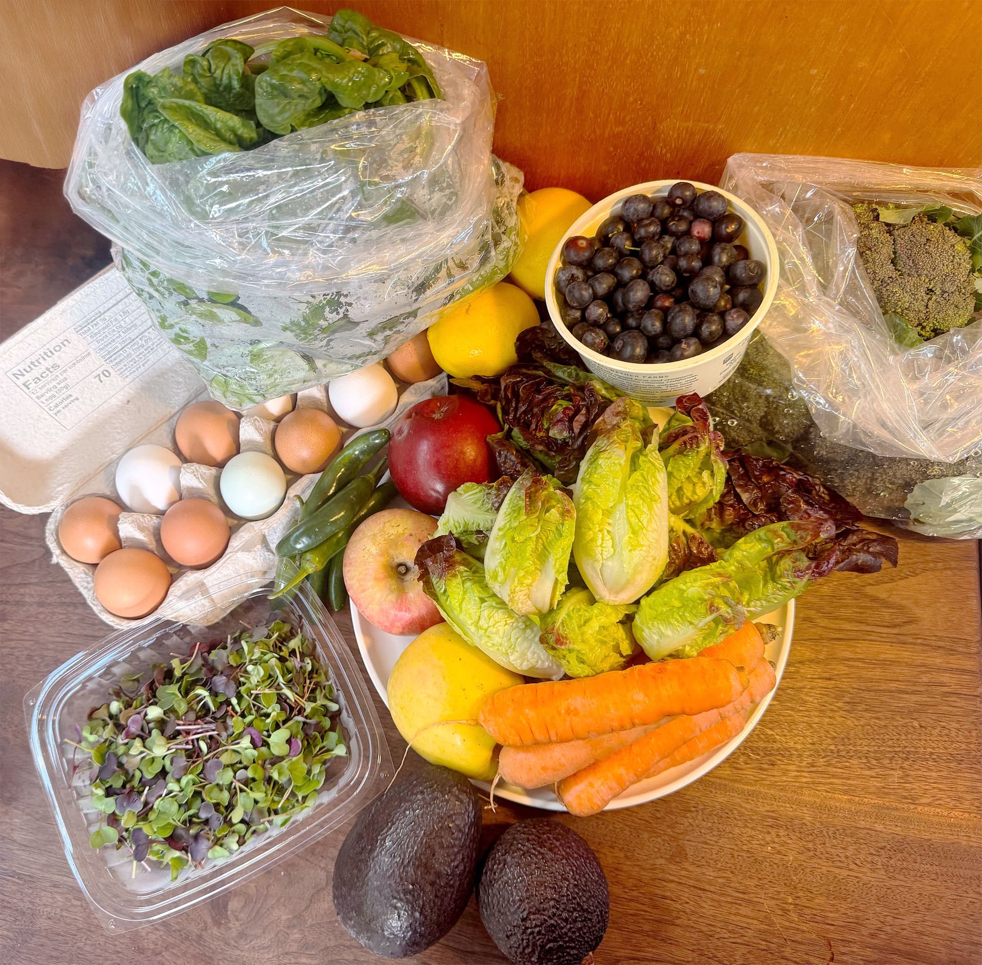 Saturday’s farmer’s market haul (meat not in pic). Everything but the berries, chilis and apples used in today’s lunch salad.