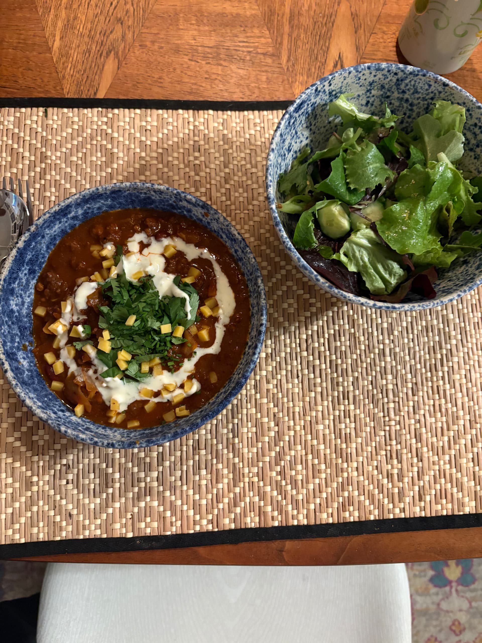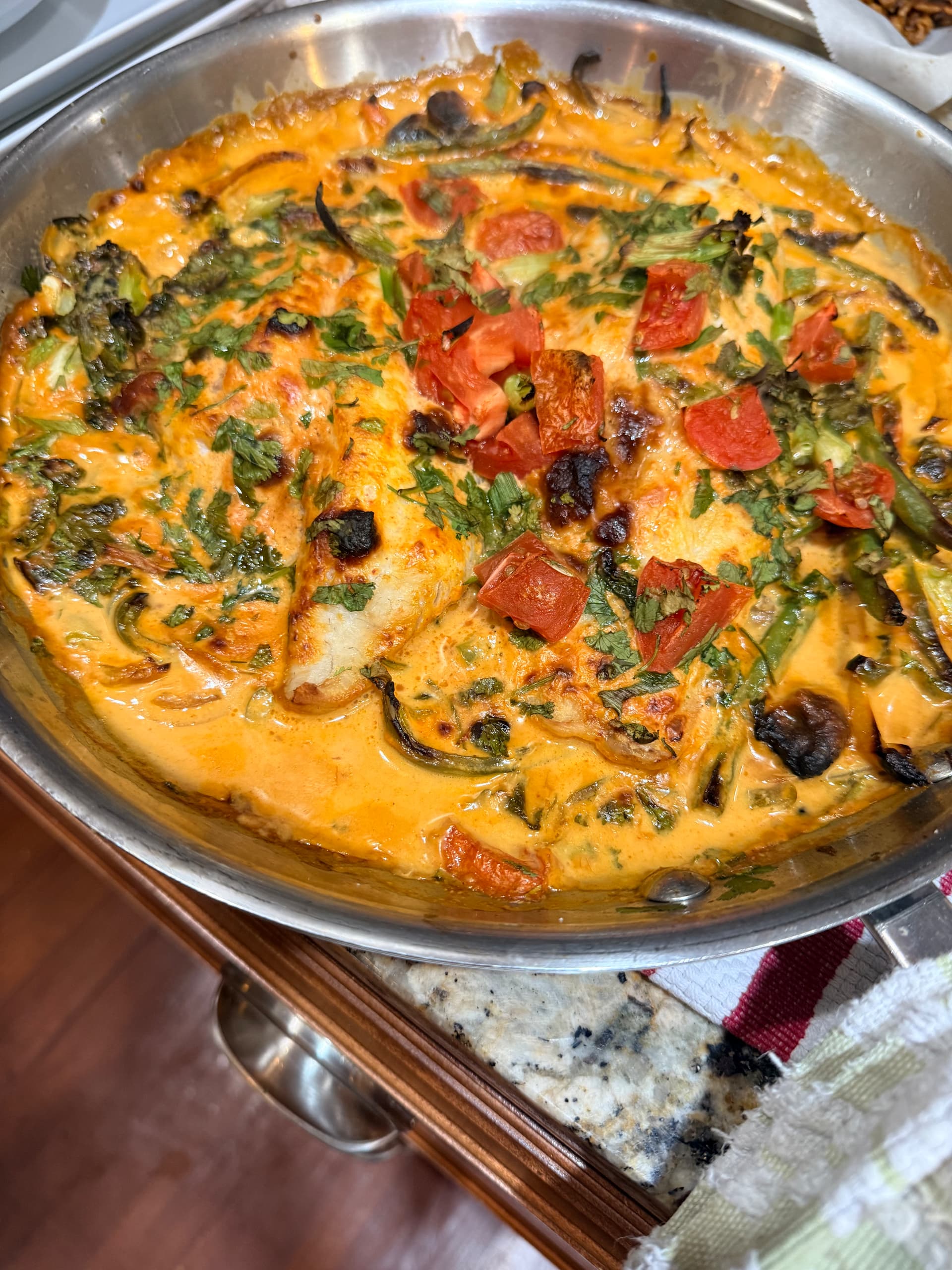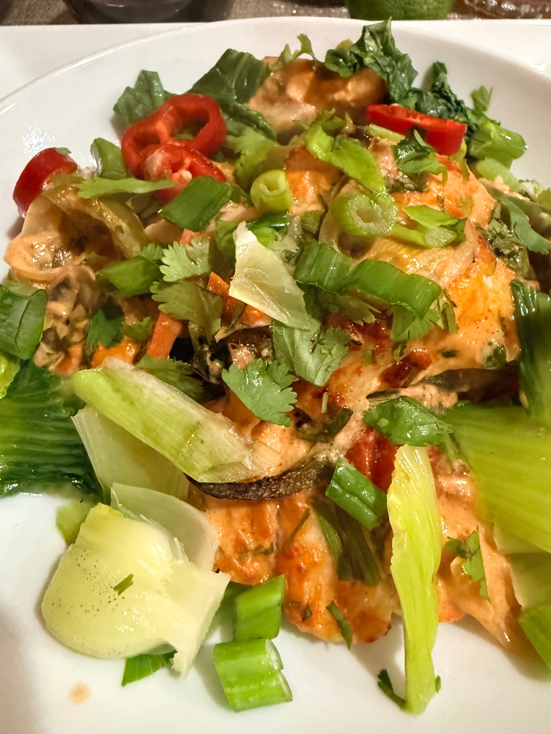 Red curry catfish. Carrots, onion, green red and jalapeño peppers, green beans, mushrooms, tomatoes. Lots of cilantro and scallion for garnish.