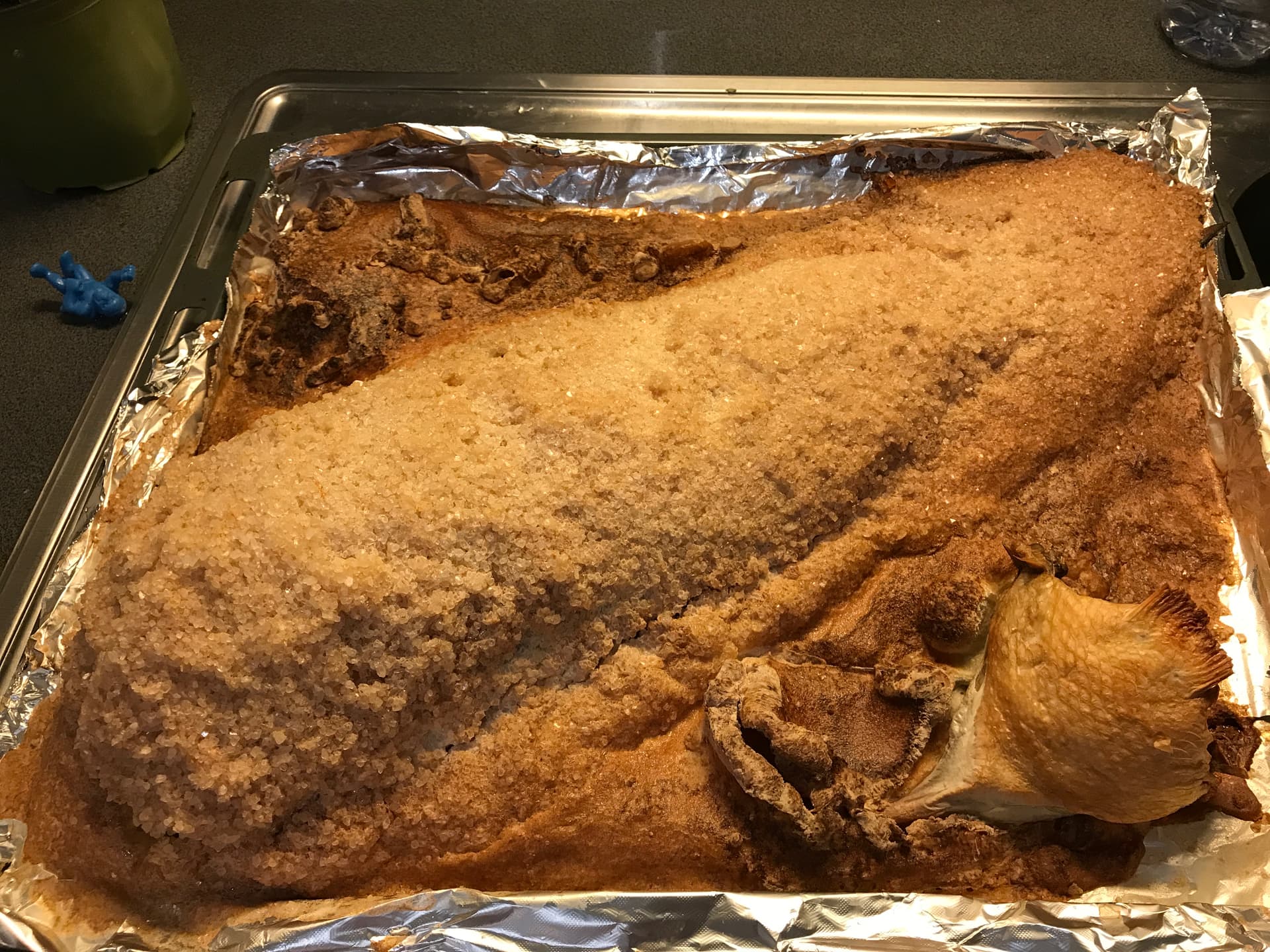 The salt-encrusted fish is a crowd pleaser, especially if you have kids. We bought a mallet so the kids could crack open the shell.