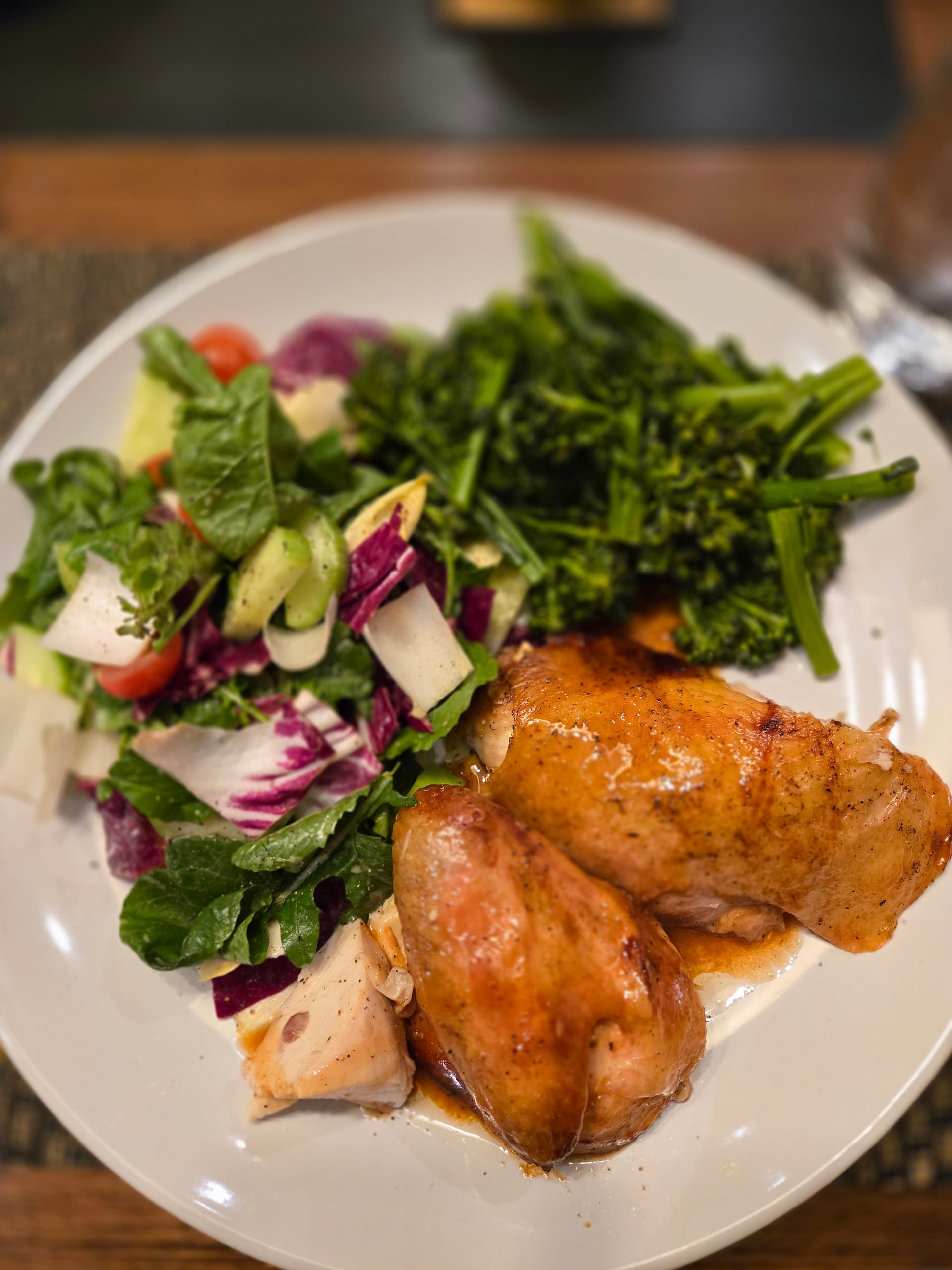 Brushed with some Dijon and creole meat seasoning then on a medium grill. Asparagus with almonds butter and miso. Quick salad with bleu cheese dressing.