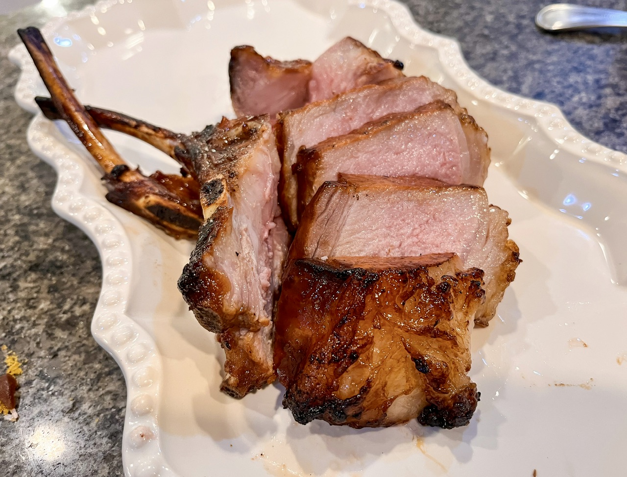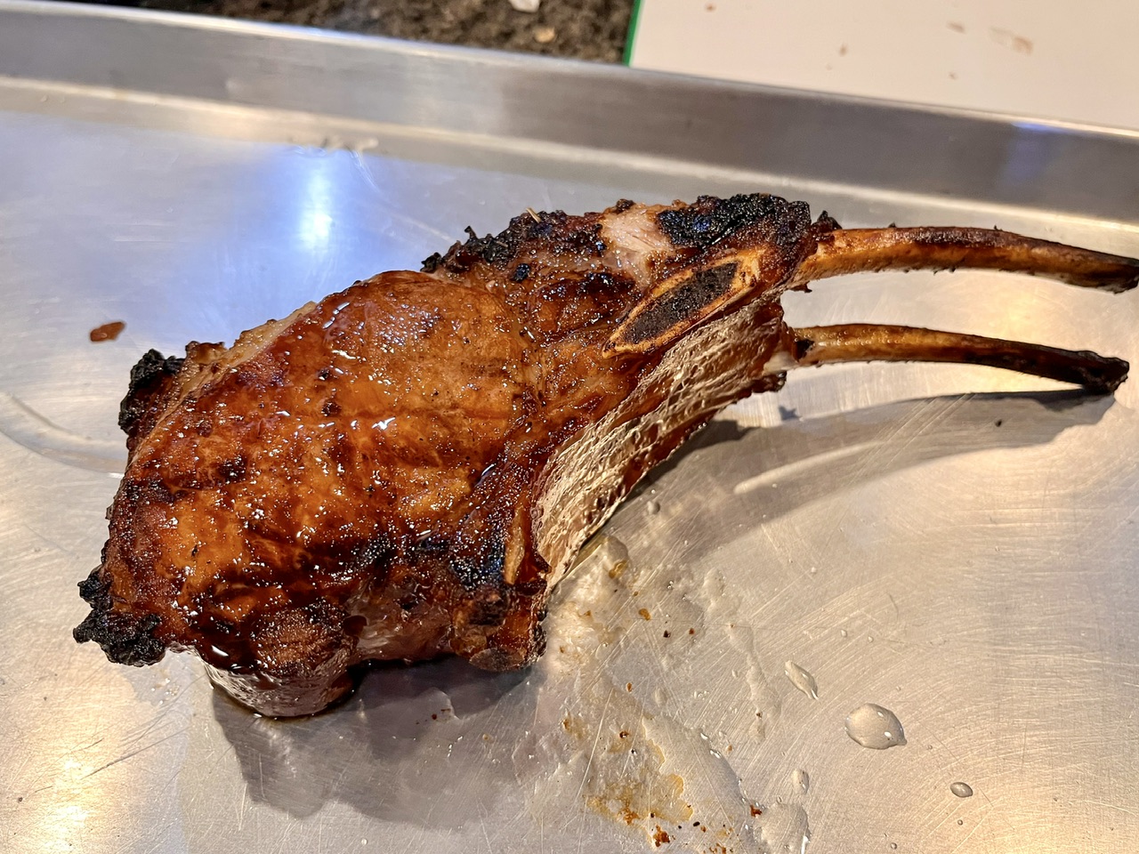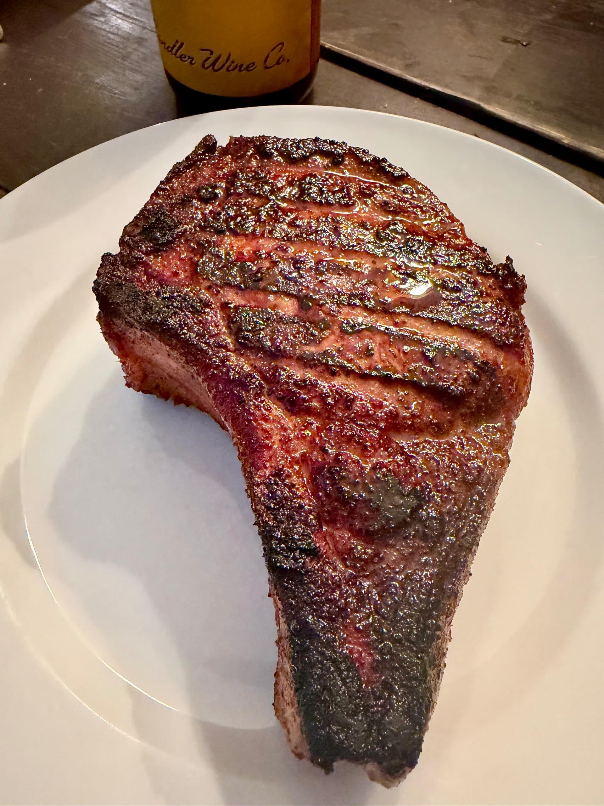 Pork chop Thursday. Plop goes the chop! 2.5” Duroc chop, smoked on a pellet grill at 225 to 115 for ~40 mins, then seared off in rendered bacon fat. Spiva Sweet Heat rub for color.