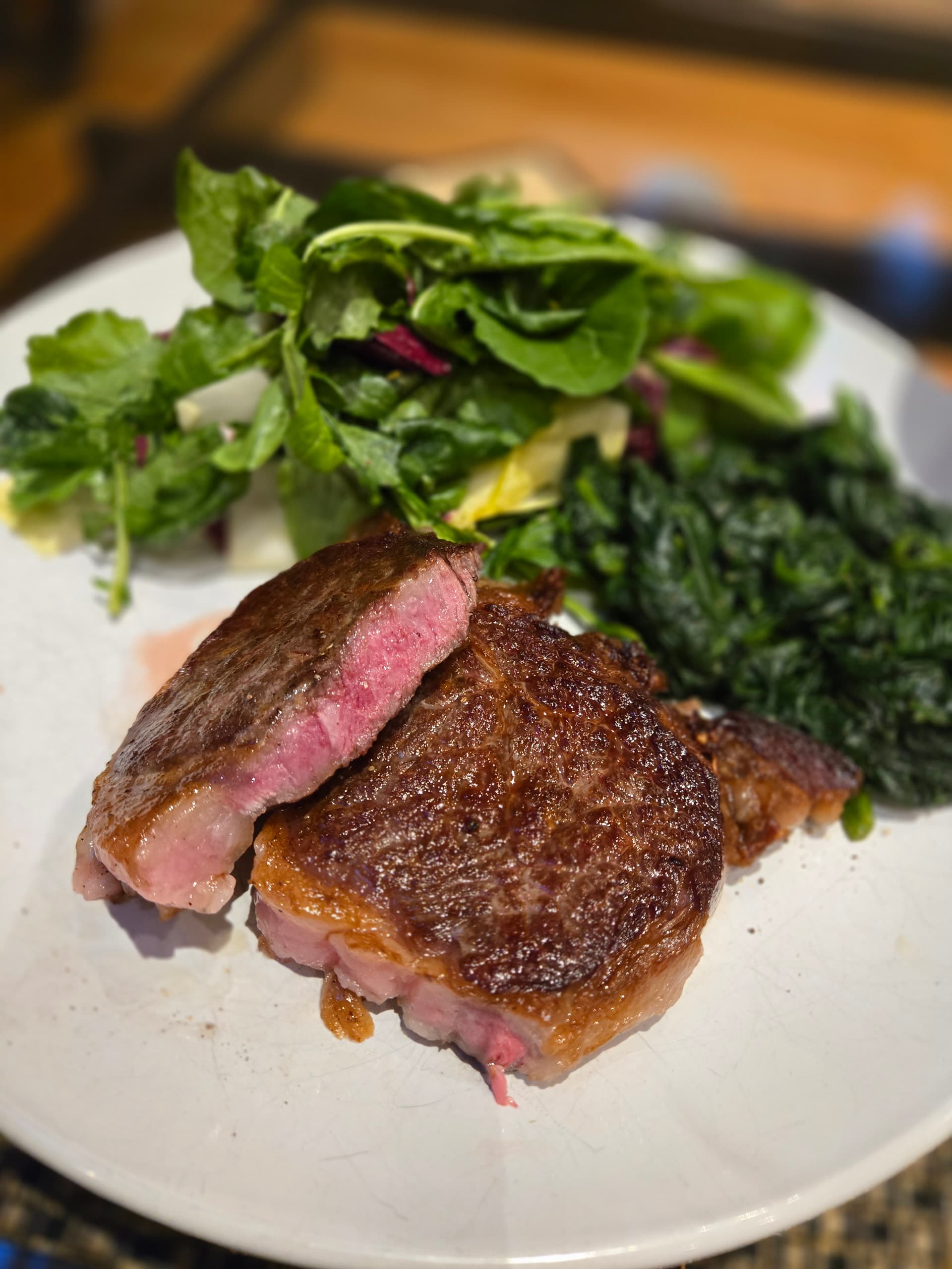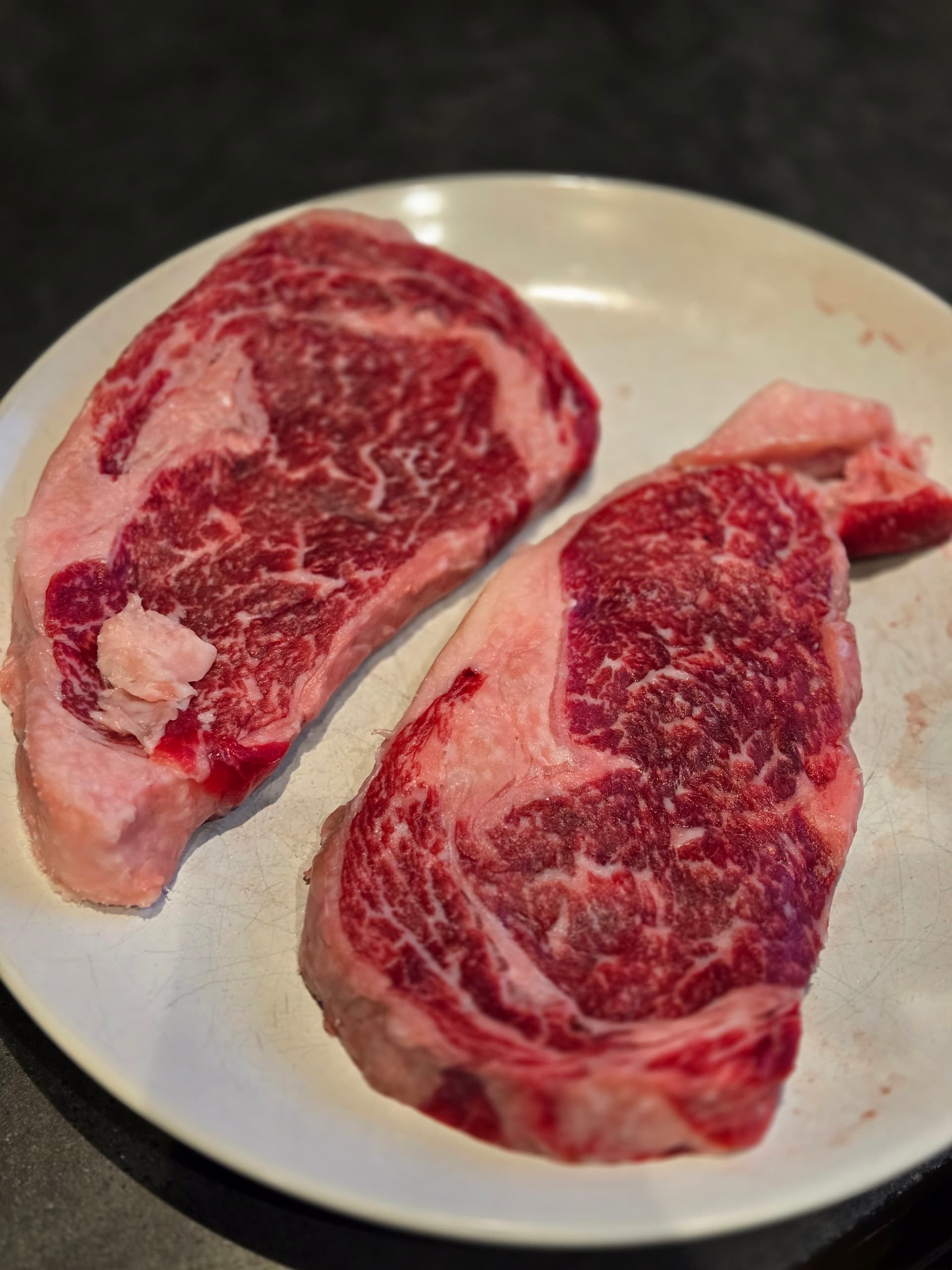 This was a momentous occasion in my house - my first Flannery dry aged ribeye! I’m actually a little ashamed it has taken me this long considering the chorus of praise this farm receives here. Well, I am here to add to that. WOW. Just a perfect piece of meat. I rarely eat dry aged beef these days (mostly for financial reasons) but I do love it, and this was a perfect amount of age for my palate. Deep and nutty, but still tastes of beef, something that I think starts to gets lost as you age longer, and also as the marbling increases (you get to a point where you’re eating pure fat and while delicious, its not something I want to eat 8oz of). Here is a pic of the steak after 24ish hrs in the fridge with salt