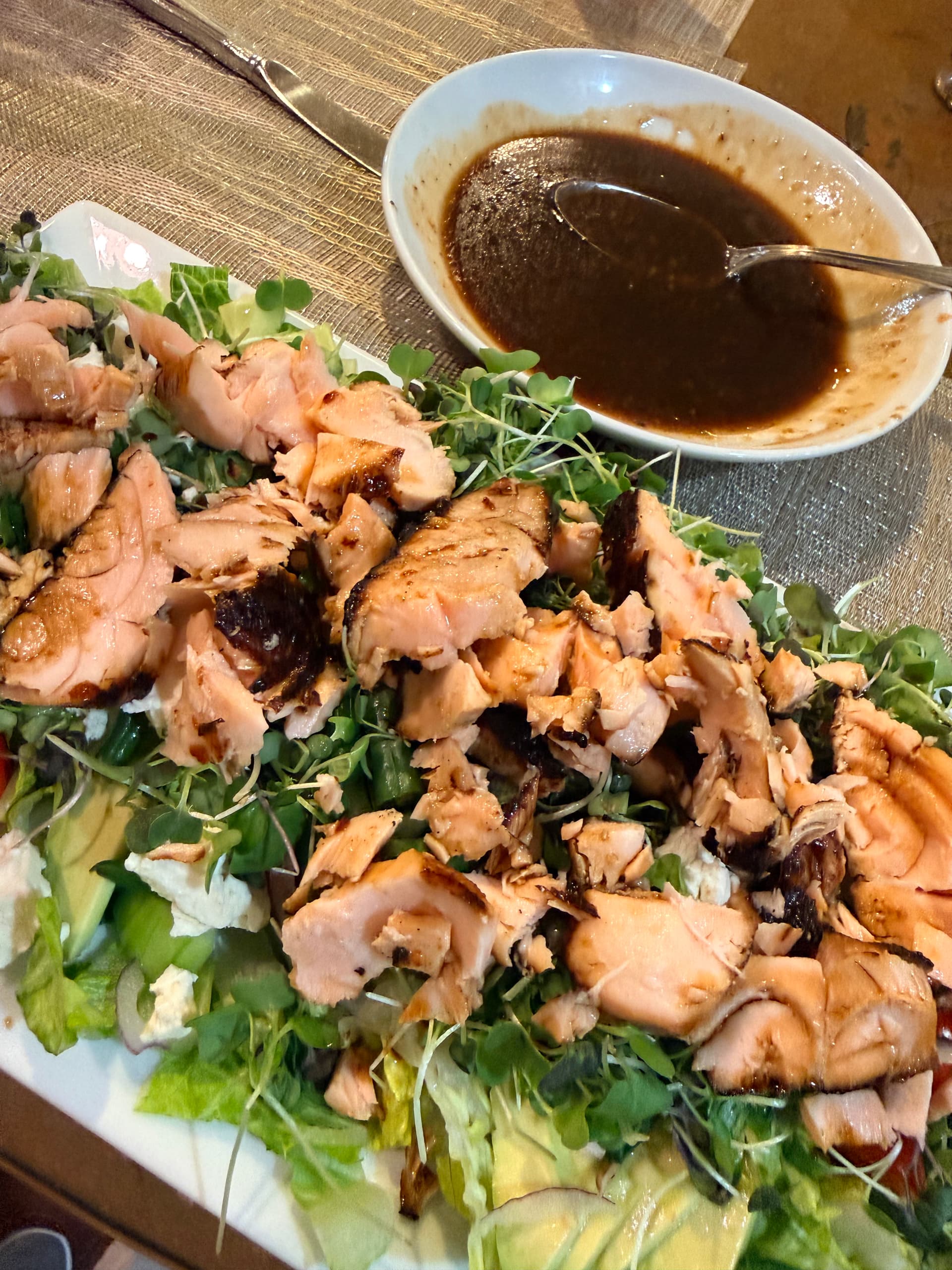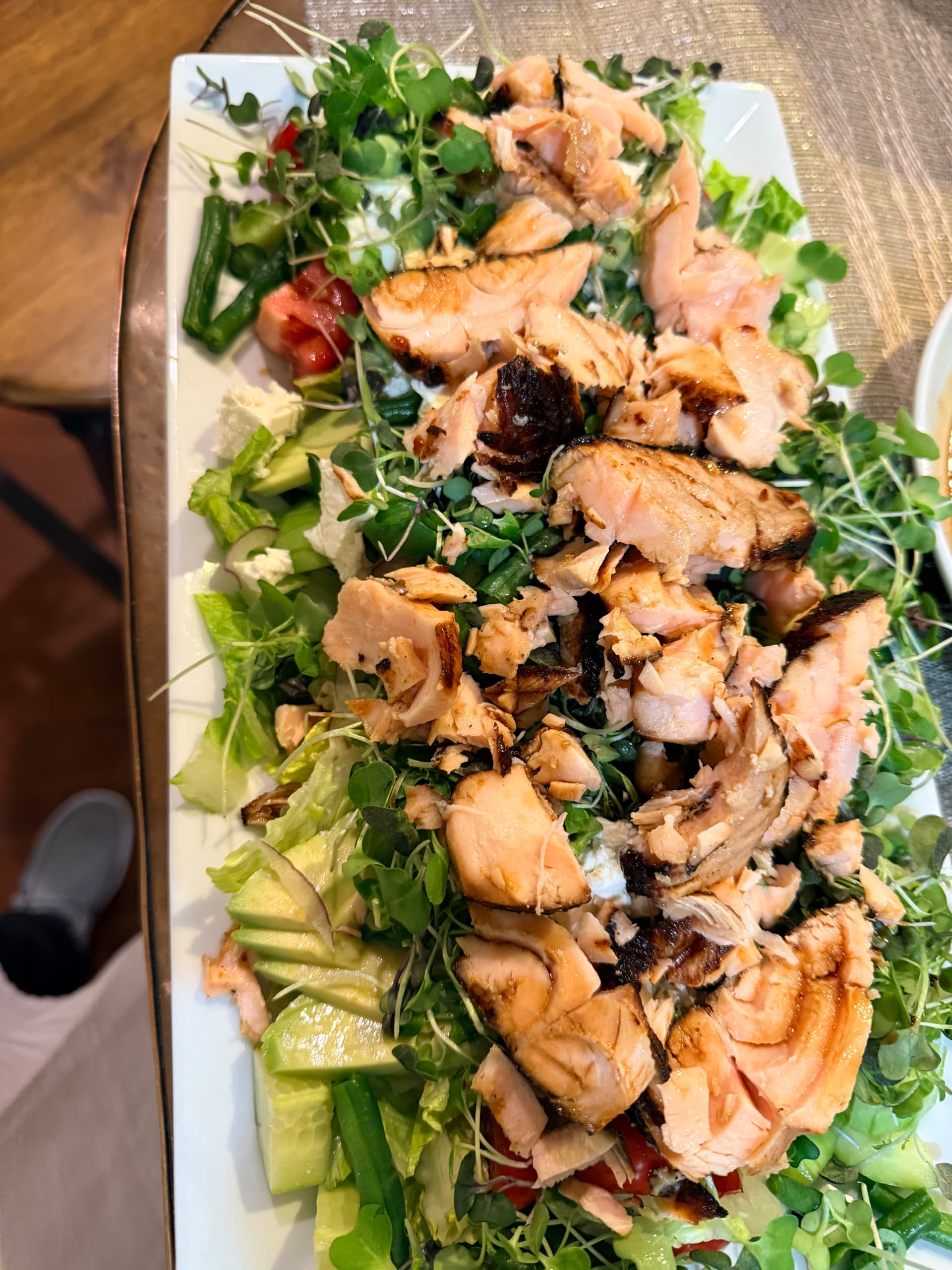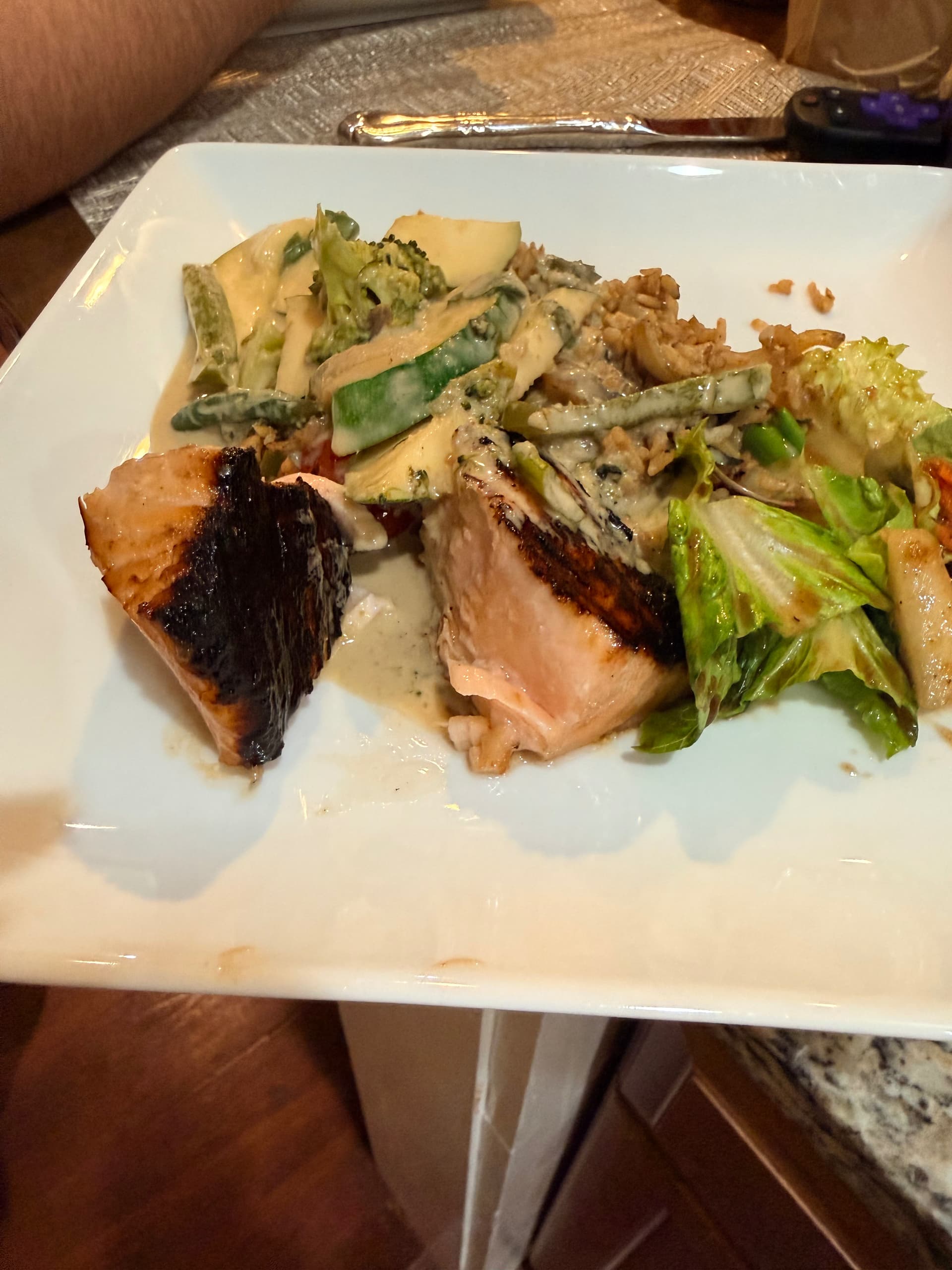 Miso glazed grilled salmon, green curry vegetables stir fried rice and romaine salad with carrots and pears. Kind of a sesame ginger vinaigrette. Shocked at how well the pears went in the salad.
