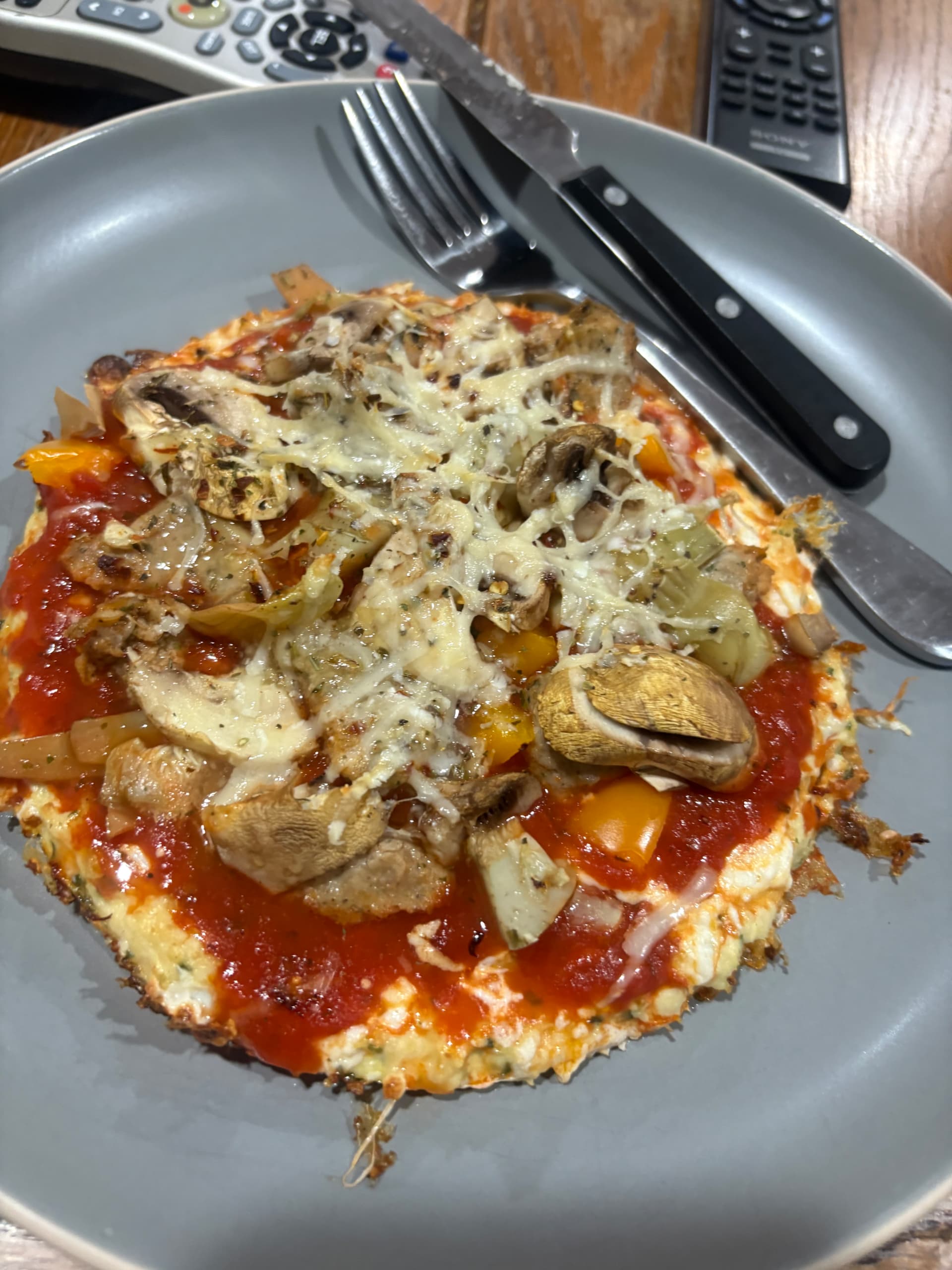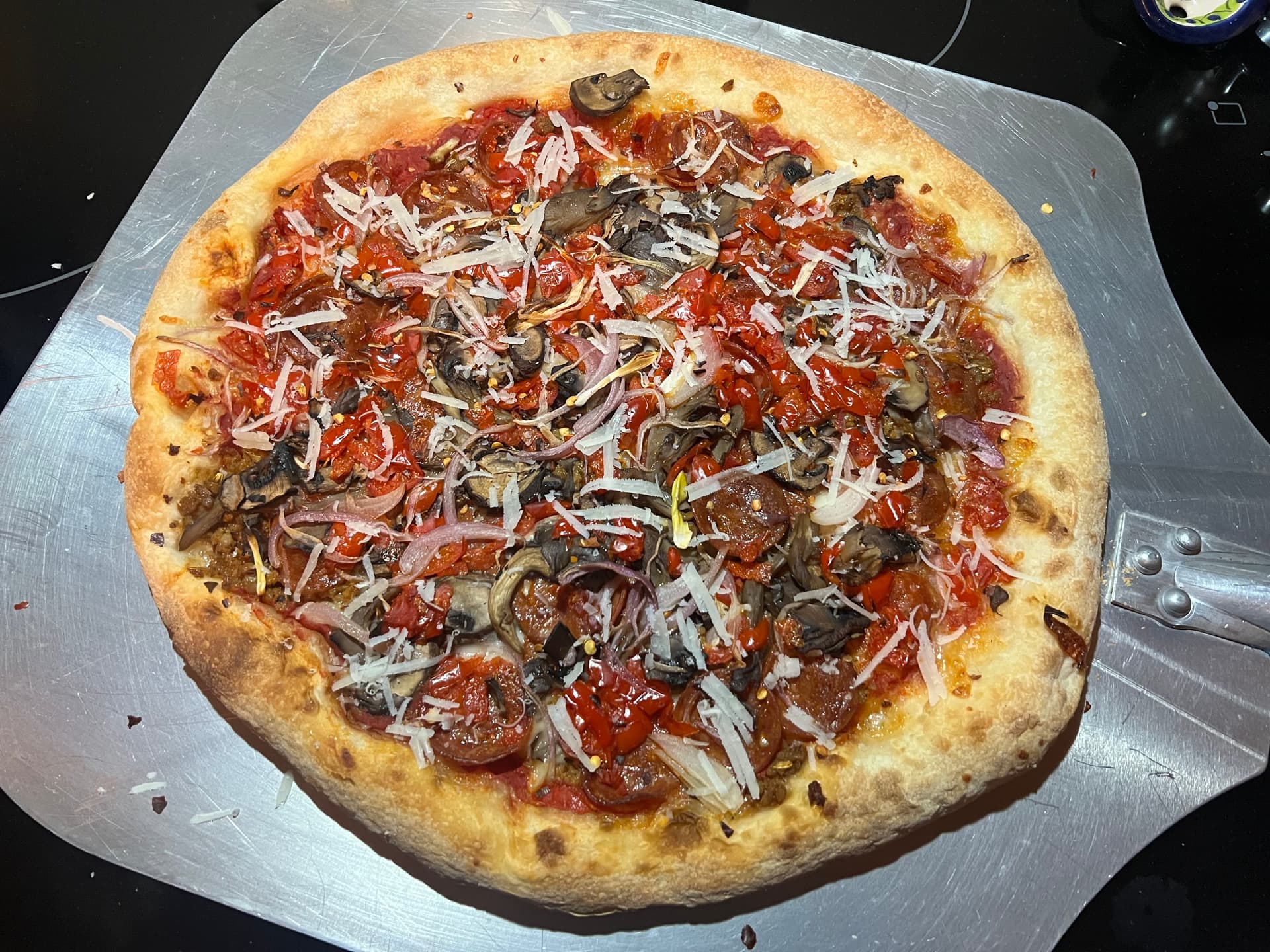 Ezzo pepperoni, fennel sausage, mozzarella, provolone, Mycopia mushrooms, red onion, peppadew peppers, red chili flakes, shaved parmesan.