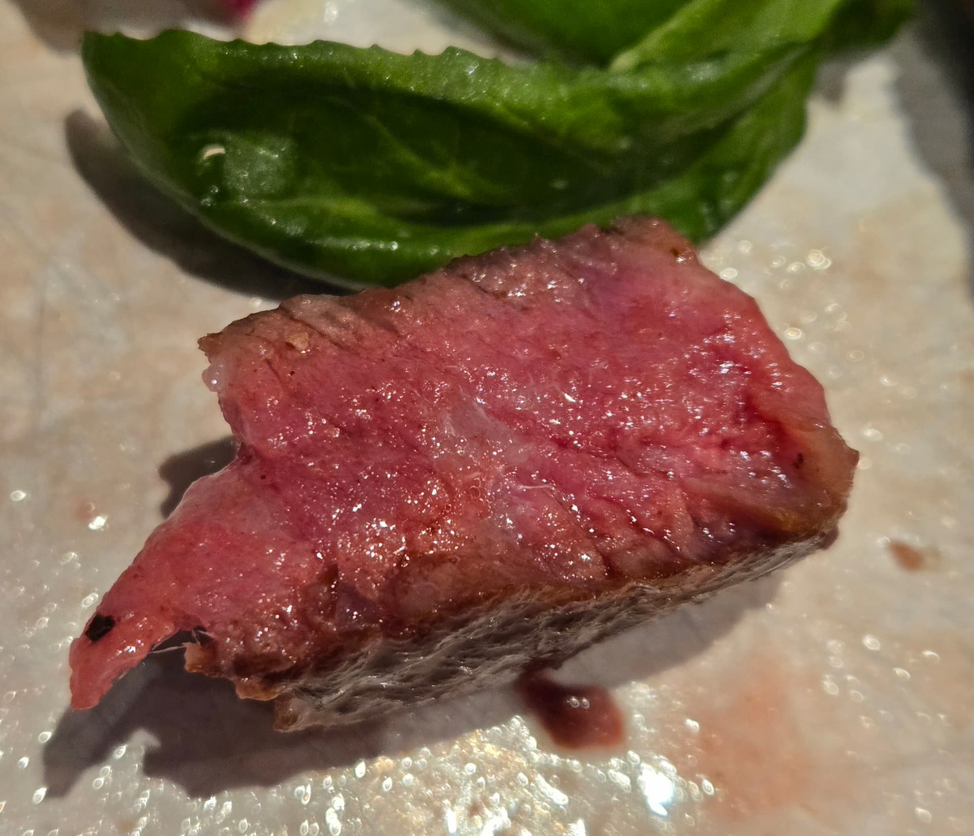 I cooked this steak using a method I’ve described upthread, lets call it “Flip and rest” where you cook the steak for 2 mins on each side, then rest for 2 mins and repeat this until you’ve reached your desired doneness. This steak took about 16mins. One twist to this version was that I had just made a batch of clarified butter, and so I melted a couple of tablespoon of that (and snuck in a little bit of bacon fat too) and rested the steak in that. Here is the finished product